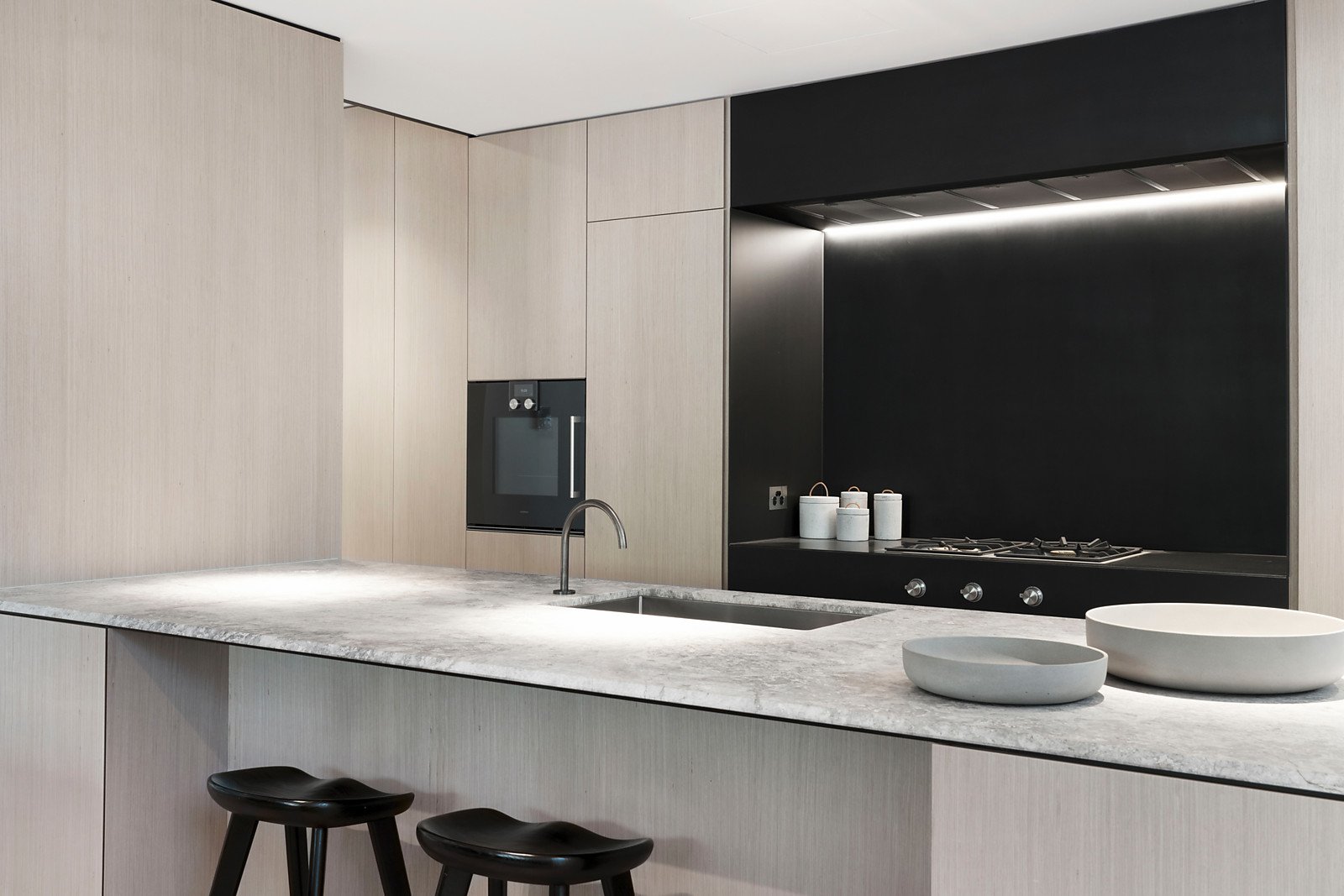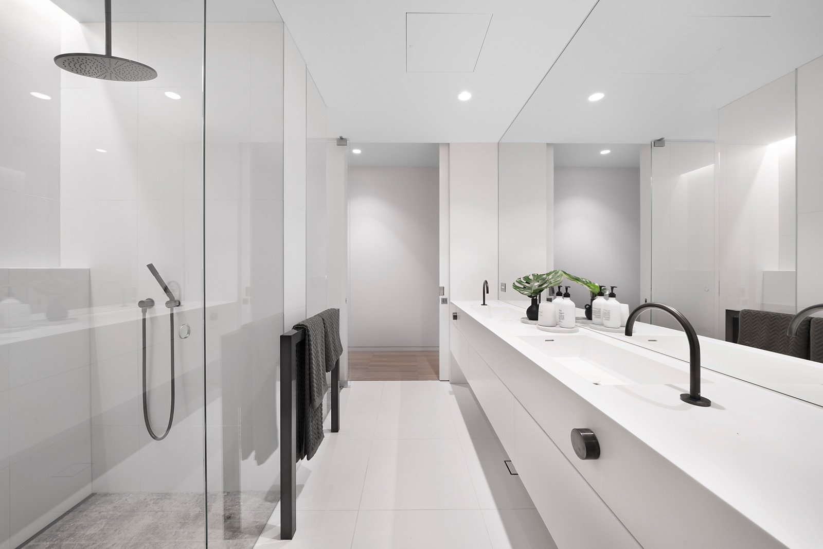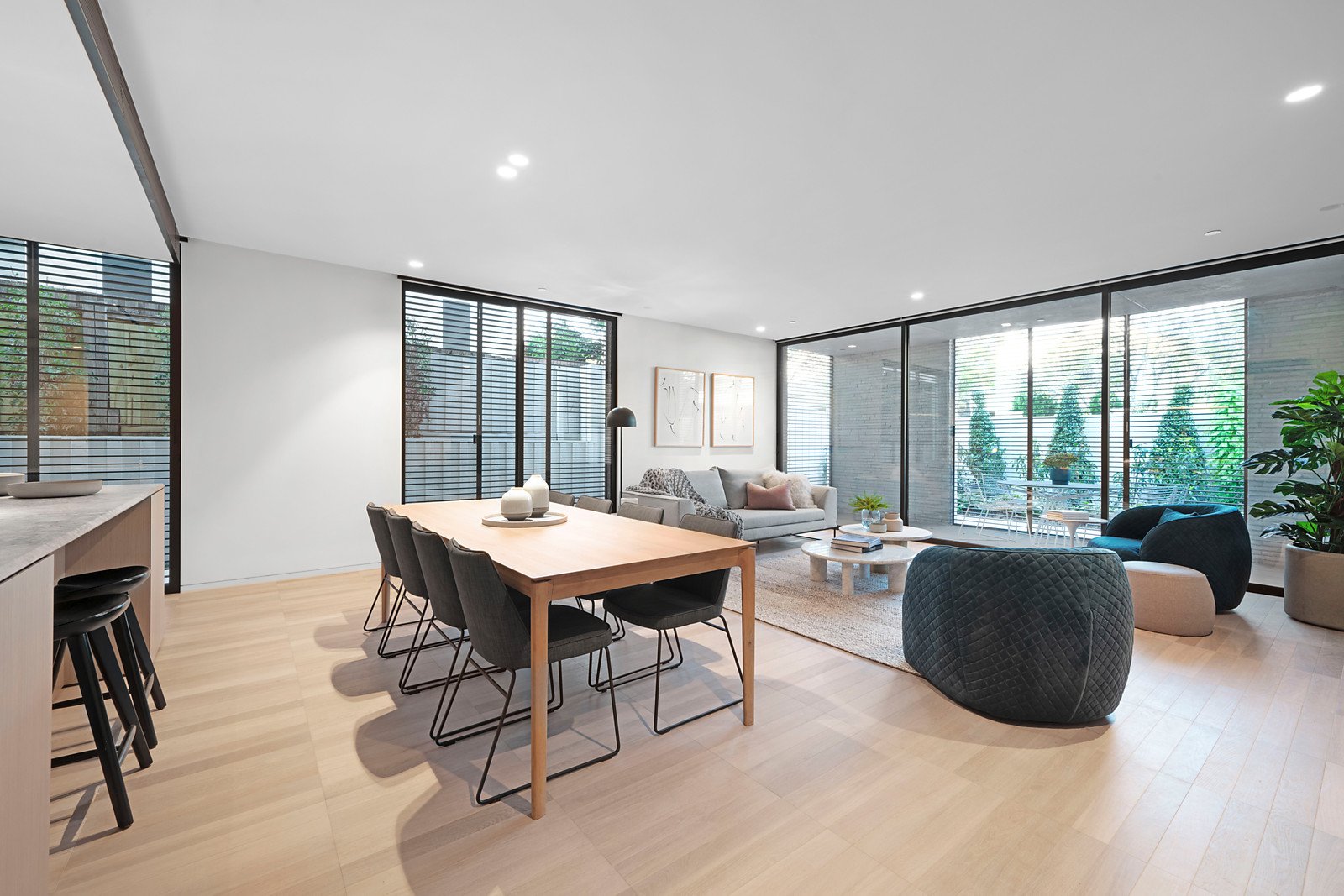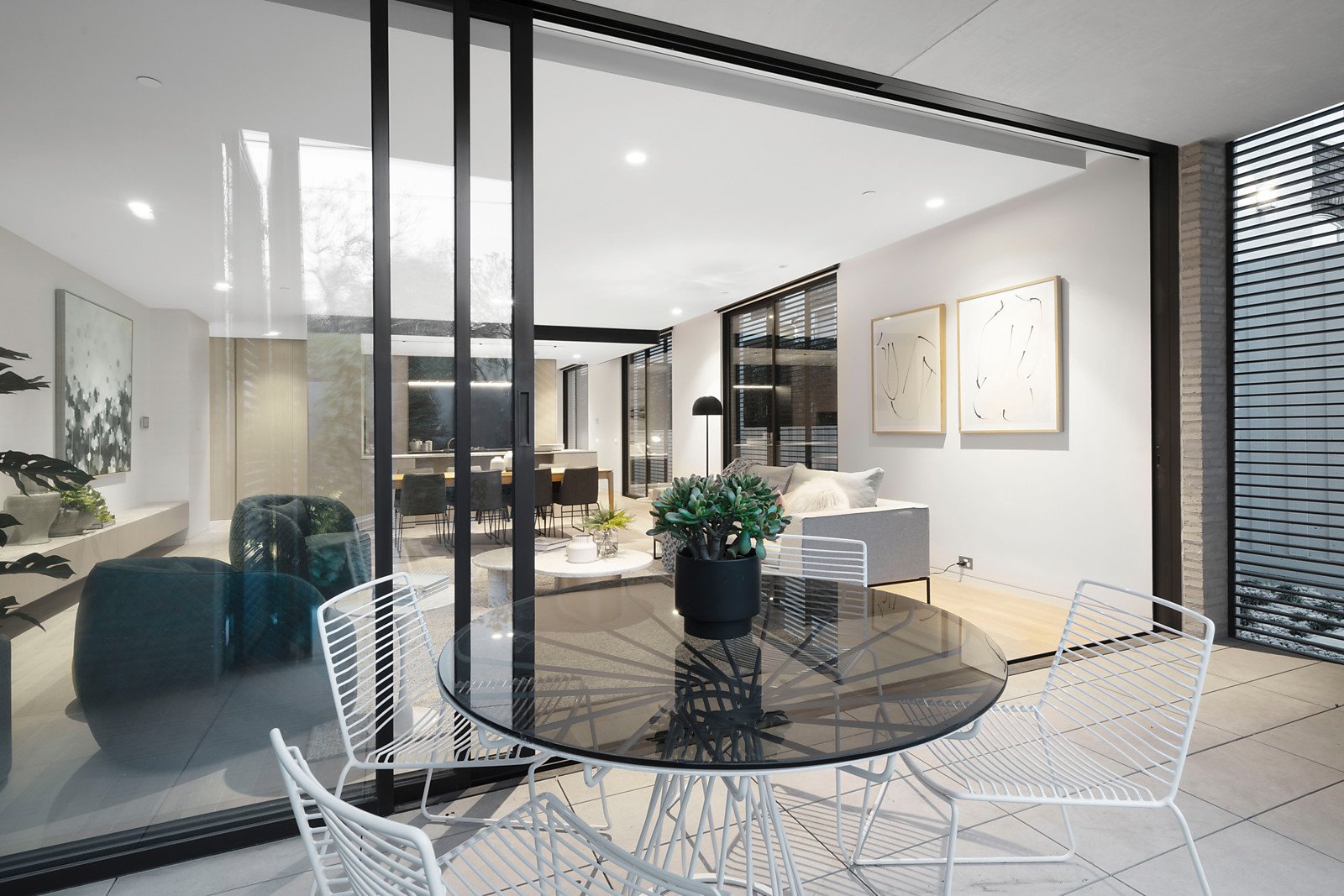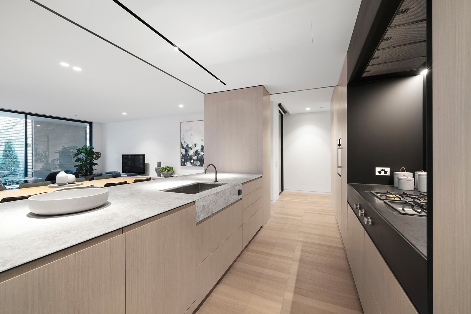 Continuing the linear themes inside, limed parquetry floors flow through the entrance hall to a stunning and impressively proportioned living and dining room surrounded by full height glass and bi-fold shutters that open to north and east facing landscaped gardens and a sensational covered al fresco terrace. Sleek and seductive, the elite kitchen is eminently appointed with marble benches, Gaggenau appliances and integrated Liebherr fridge/freezer. The beautiful main bedroom with an abundance of robes and a designer en suite is matched by an equally spacious bedroom with built in robe and a sublime en suite/bathroom.