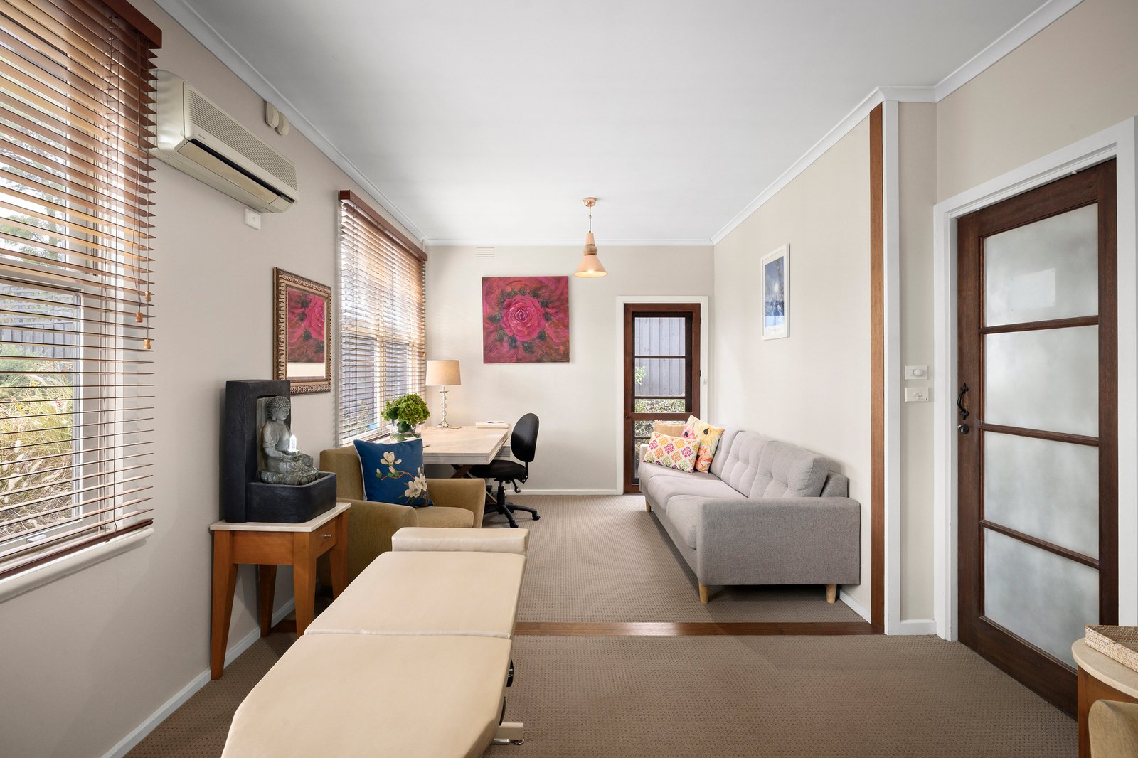 The existing layout functions beautifully in its present configuration, with a serene reception foyer introducing hardwood floors and leafy green outlooks, three consulting rooms or bedrooms, two offices, a kitchenette, and a bathroom, each room fitted with split-system heating and cooling and two consultation rooms with sinks. A landscaped allotment, verandah entry, and off-street parking for eleven vehicles add further practicality to a building that already operates at a high standard.