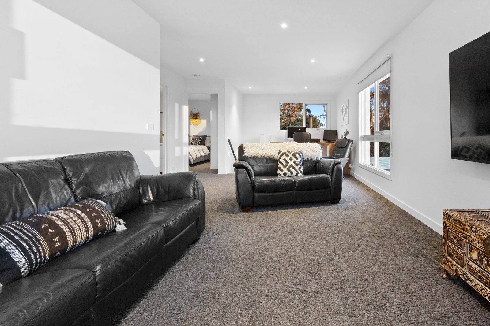 Zoned on the lower level, the spacious main bedroom has a sitting or study area, a walk-in robe, and a stylish ensuite with a walk-in dual-head shower. With views towards the Bay and Red Hill, the upper level comprises a second living room, a work-from-home space, the main bathroom, and two bedrooms with built-in robes and ceiling fans.