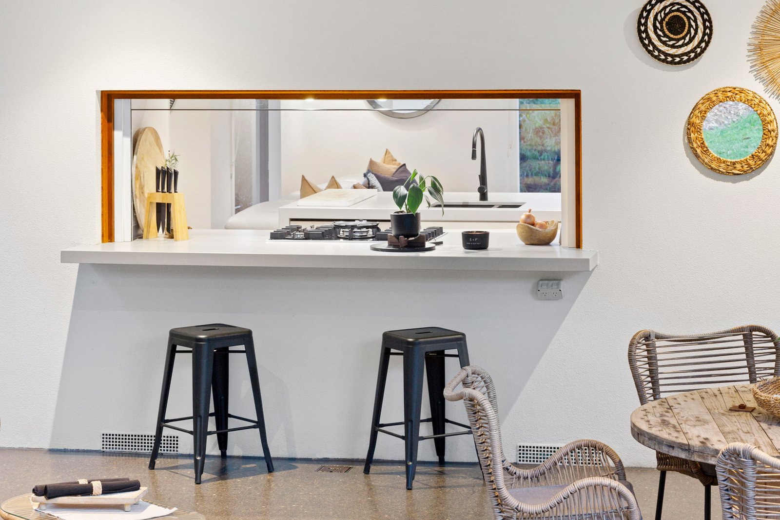 The entry deck has been crafted from reclaimed timbers, while hand-scraped Engineered oak flooring adds an industrial/rustic edge to the generously proportioned interiors further complemented with a wood fireplace set in hand-laid stone surrounds. Oriented towards the north, the light-filled ground-level open plan area is headed by a gourmet stone kitchen, fitted with Miele appliances including a five-burner gas cooktop, convection oven and dishwasher, while a walk-in pantry with sensor lighting and a servery window to the alfresco zone enhance the ease of entertaining. Anchored by a wood fireplace, the outstanding polished concrete alfresco zone is designed for all-season enjoyment with a Vergola ceiling and a sliding barn door to assist in temperature control.