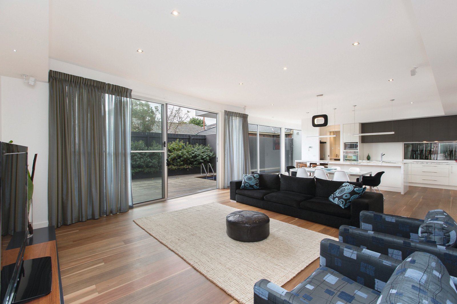 Brilliantly showcasing the very latest designer style and luxury, the spectacular dimensions of this 4 year old architect designed contemporary residence provide a sophisticated indoor/outdoor family lifestyle. A prestigious cul de sac setting close to great schools, Dendy and Hampton Streets' shops and cafes and Brighton station enhances the appeal. Soaring ceilings, floor to ceiling glass and Tasmanian Oak floors enhance the sense of space, light and style through the entrance hall, fitted study area and inviting sitting room. The impressively proportioned living and dining room featuring a state of the art Calacatta marble kitchen with full butler's pantry opens out to a private north-facing garden sanctuary with solar heated pool and landscape designed by Jack Merlo. Floating timber stairs lead up to an opulent main bedroom with marble en-suite and walk in robe, two additional double bedrooms with built in robes, a sunny retreat and sleek bathroom. Impeccably appointed with ducted heating and cooling, alarm, video intercom, Bose audio-wiring, powder-room, laundry, irrigation, water tank, auto gates and internally accessed double garage.