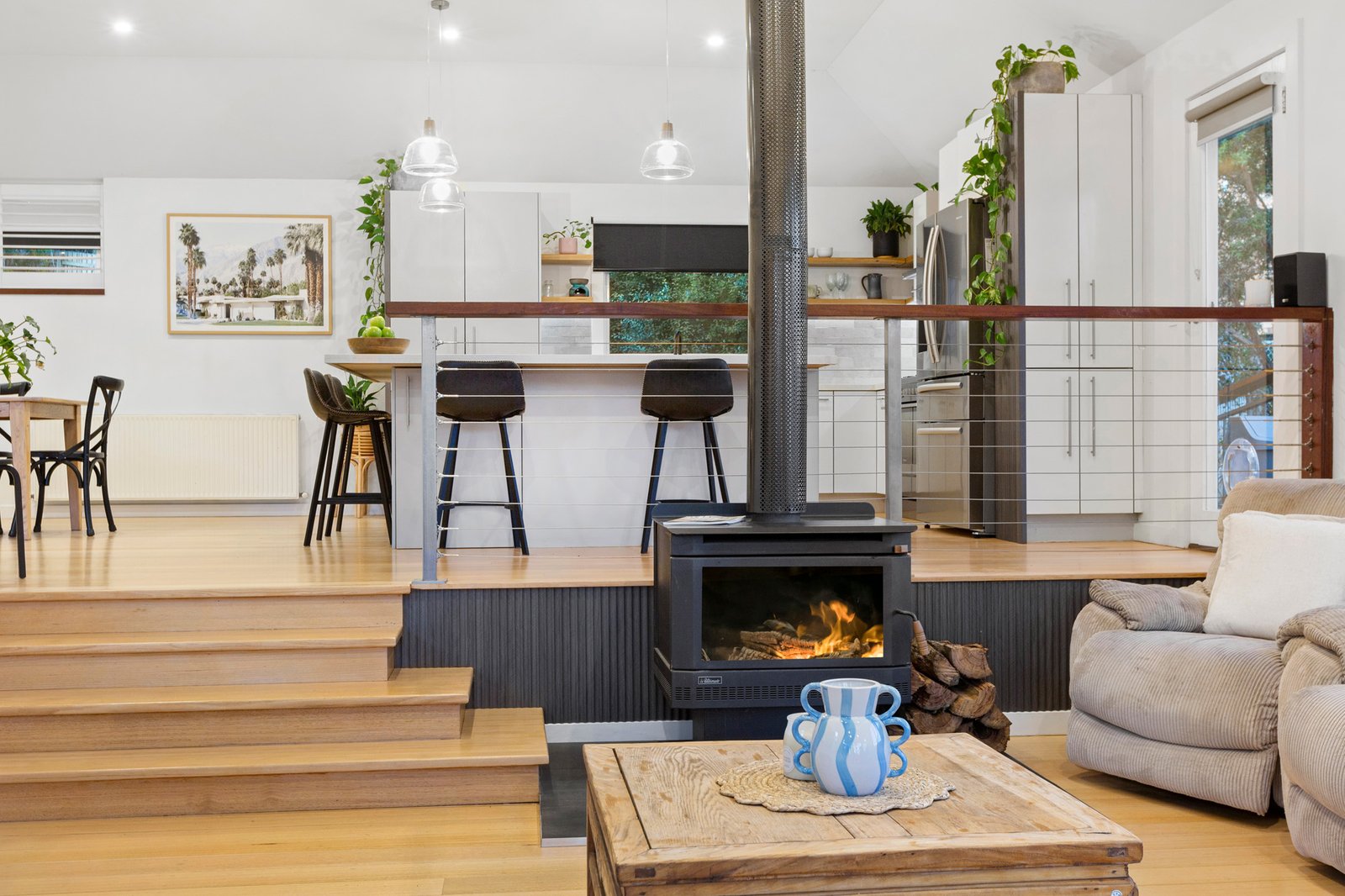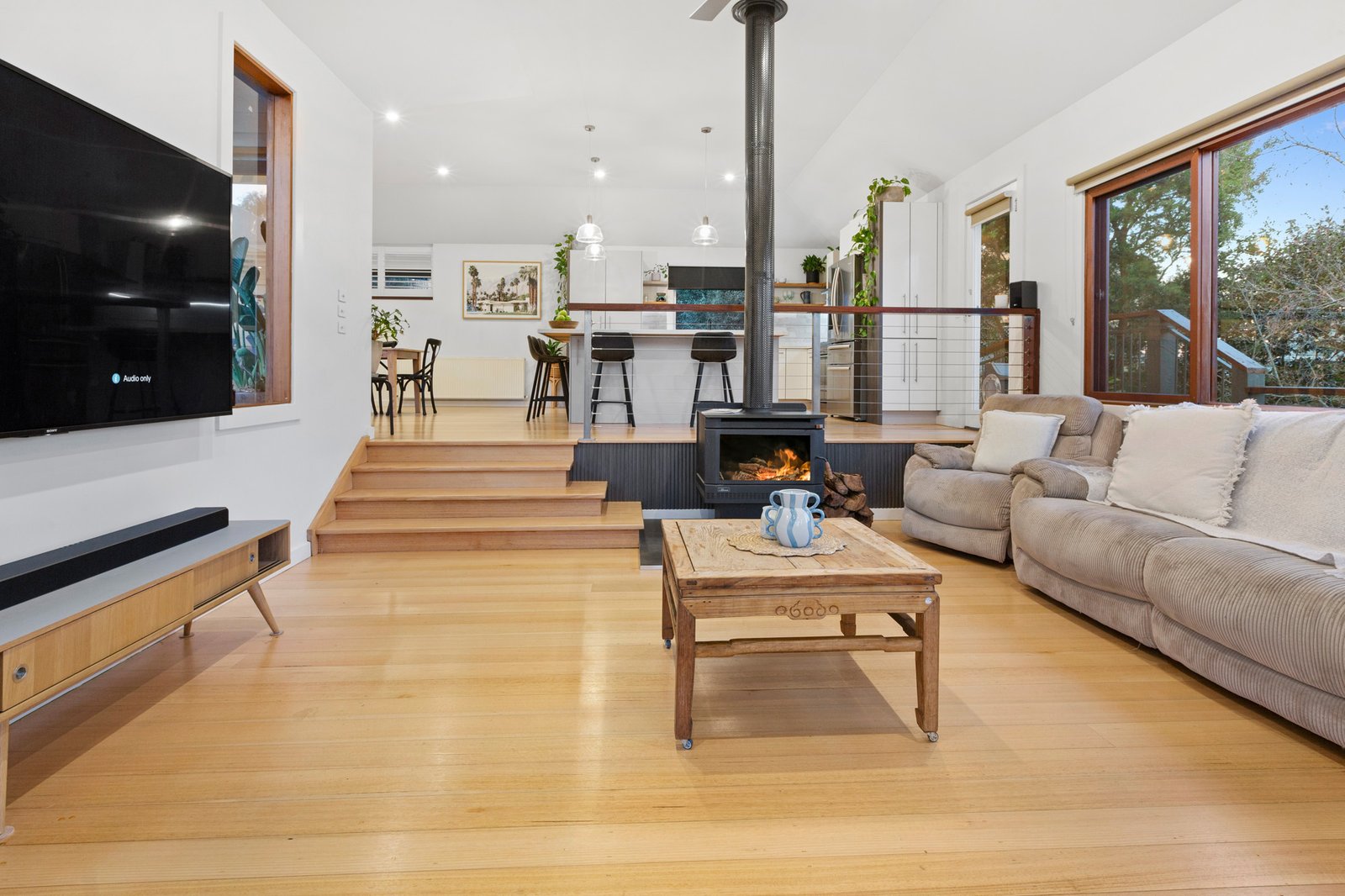 Oriented towards the bushland vista that extends towards Arthurs Seat, entry is via steps that lead to a broad front-facing entertaining deck with an undercover area. The generously proportioned interiors are resplendent with newly resurfaced polished hardwood flooring, while high, angled ceilings enhance the character-rich home’s light-filled dimensions. Perfect for entertaining, or family gatherings, the central gourmet stone kitchen has a corner island bench/breakfast bar, a Westinghouse free-standing range cooker, and a dishwasher. Steps lead down to the lower-level living space with a wood-fire heater and French doors that open to the entertaining deck. The home is fitted with hydronic central heating throughout, including a heated towel rail to the recently fully renovated main bathroom with floor-to-ceiling tiling, a free-standing bath, walk-in shower, and stone vanity. There are two bedrooms with built-in robes on the upper split level, along with a living area/retreat, while the spacious main bedroom is zoned at the front of the home and has balcony access, a walk-in robe and stylish ensuite with walk-in shower. Another bedroom with built-in robes, a study (or 5th bedroom) and a laundry with external access complete the layout.