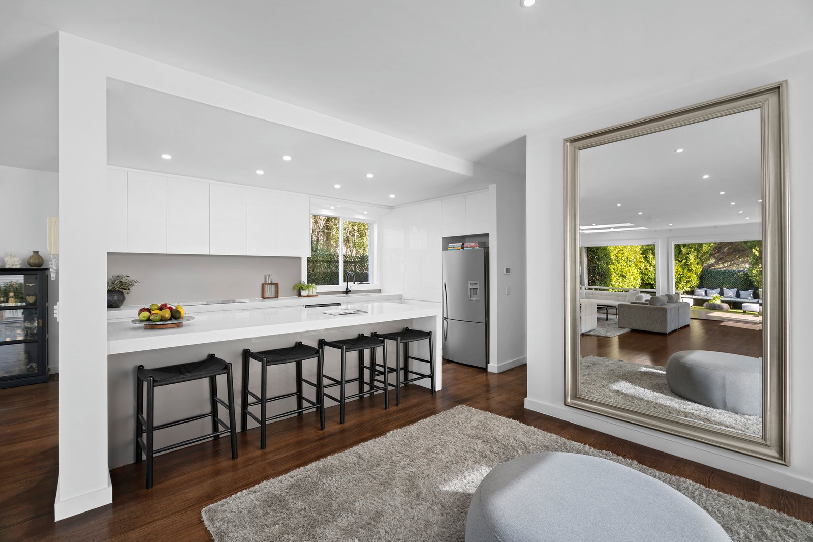 A previous winner of Home Beautiful magazine’s ‘Renovation of the Year’, a double-height entry void, skylights, and walls of glass draw in optimum natural light to the generously proportioned dimensions, further enhanced with dancing pool shimmers from the recently re-surfaced solar/gas heated lap pool and spa that runs the length of the open plan living area. Polished hardwood flooring flows with seamless connection via bi-folding glass sliding doors to the undercover alfresco zone, and the sleek, central stone/Bosch kitchen is perfectly positioned to oversee pool and play areas.