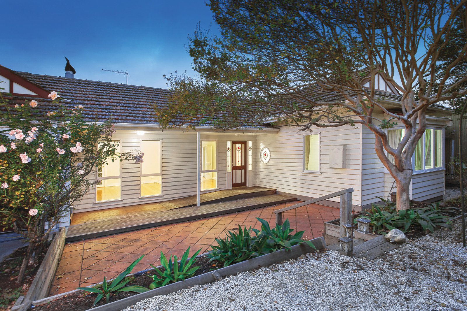 Privately positioned behind a high front fence and set in easily managed terraced gardens the home presents in excellent condition whilst also offering scope for further updating and improvements or new home site (STCA) if desired. The interior features polished timber floors and entrance hall leading to a sitting room with OFP, two bedrooms with BIRs, two stylish bathrooms and a laundry. Through to a well-equipped kitchen with timber bench-tops and stainless steel appliances plus a family living and dining room which opens to a deck with wisteria-clad pergola - providing ideal options for indoor/outdoor entertaining in complete privacy. Other features include alarm, period attributes, ducted heating, split-system R/C air conditioners (bedrooms & living), auto security gates to a remote garage/storage and tandem off-street parking.