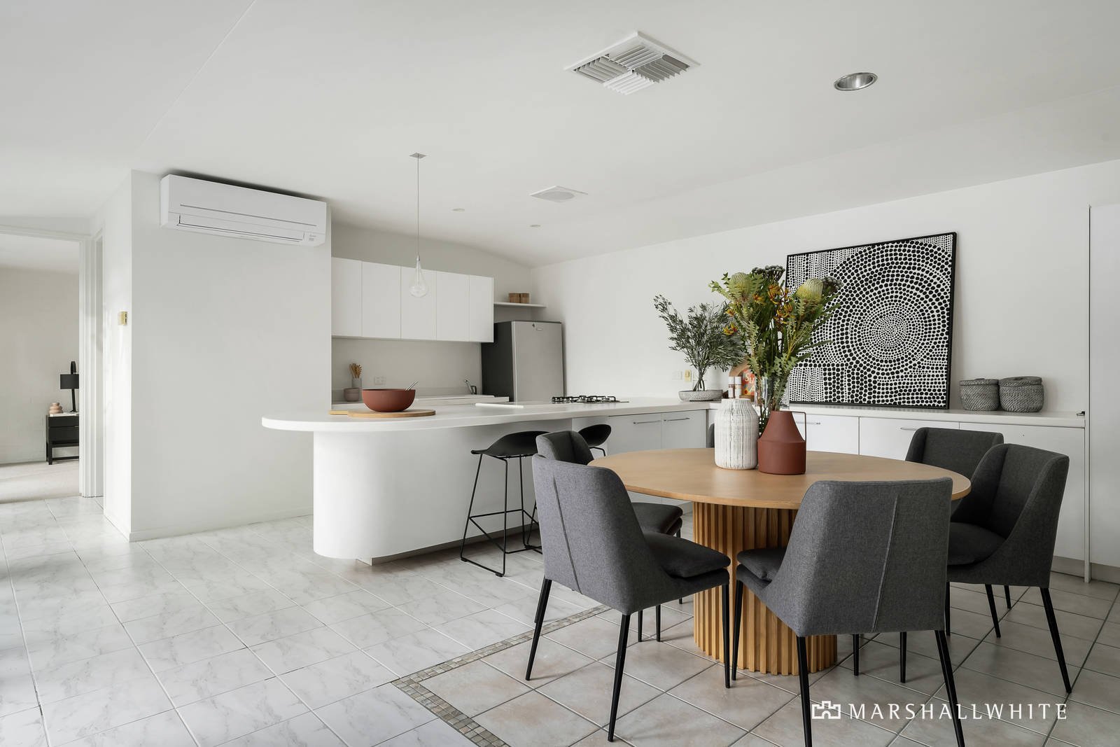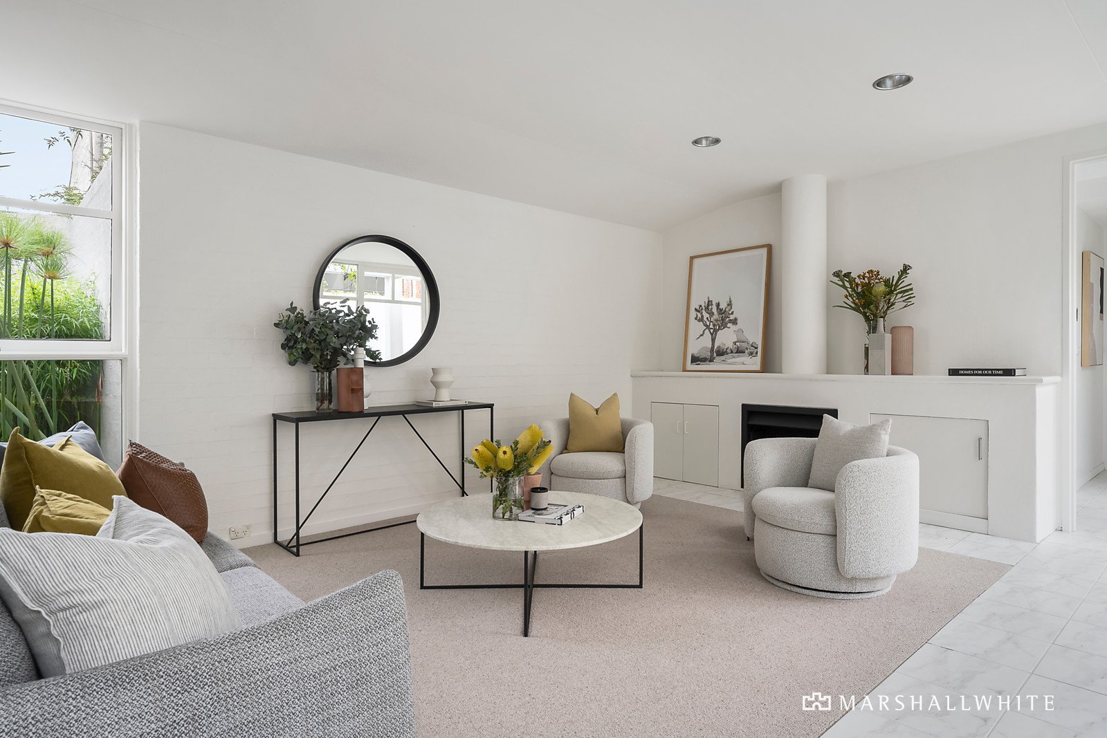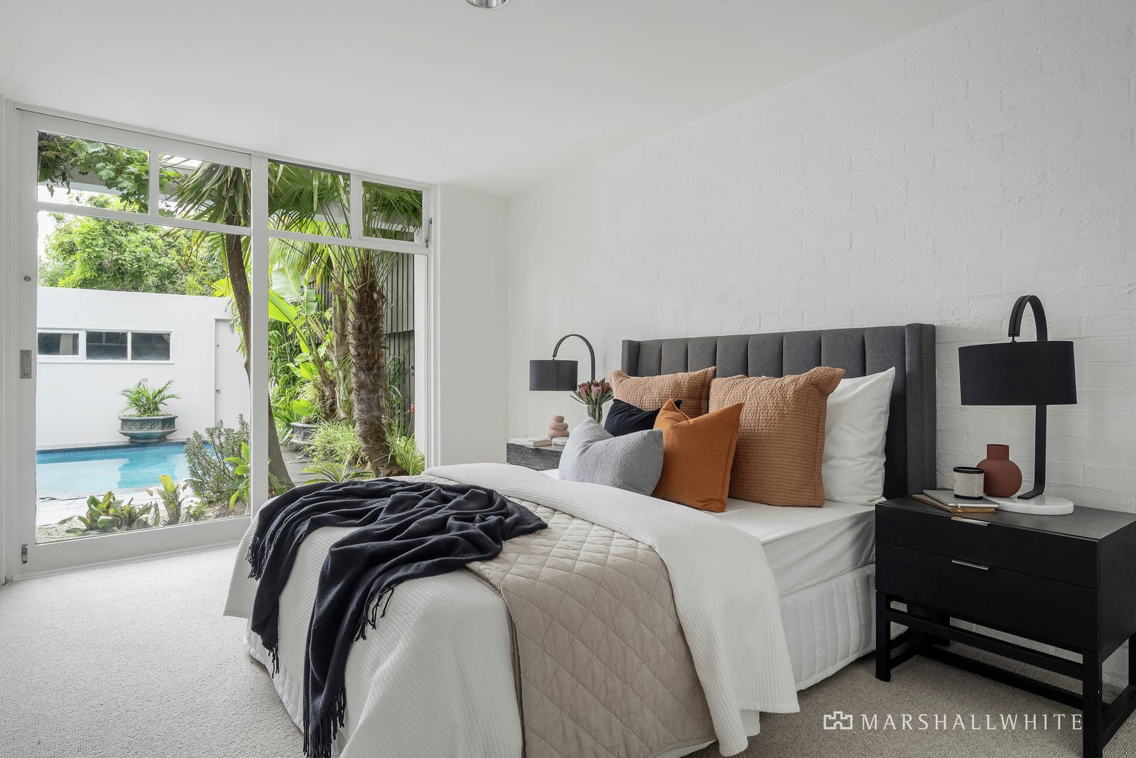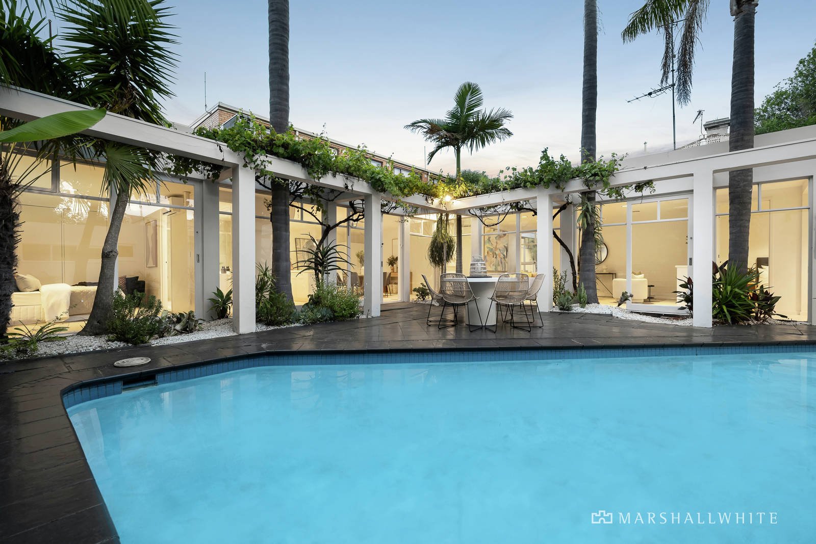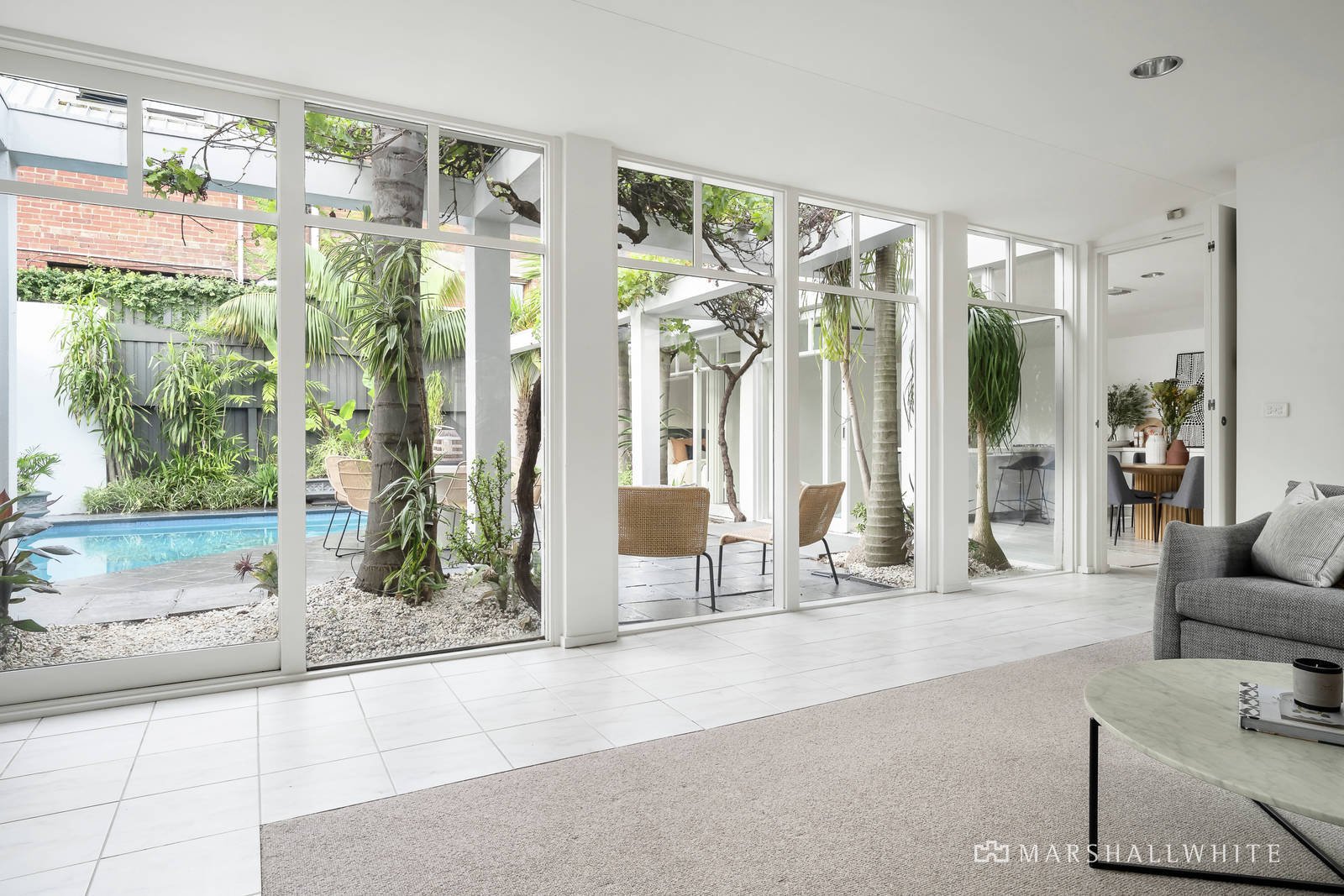The stunning, fully renovated and updated interior benefits from loads of northern light and floor-to-ceiling glass boosted by a crisp white décor. An L-shaped floor-plan surrounding the courtyard garden and solar heated pool features three zoned bedrooms, or two plus a study/home office, the main has a sky-lit ensuite and laundry combined, plus a separate family bathroom with sunken spa bath and flanked by leafy east/west light wells. A spacious living room flows to an open plan dining area and kitchen equipped with high quality appliances, all flowing to the outdoors through sliding doors. Other features include ducted heating, evaporative cooling, R/C air conditioner (kitchen/dining and main bedroom), OFP (living room), new carpets, ample storage and potential to add a second level over the double garage if desired (STCA).