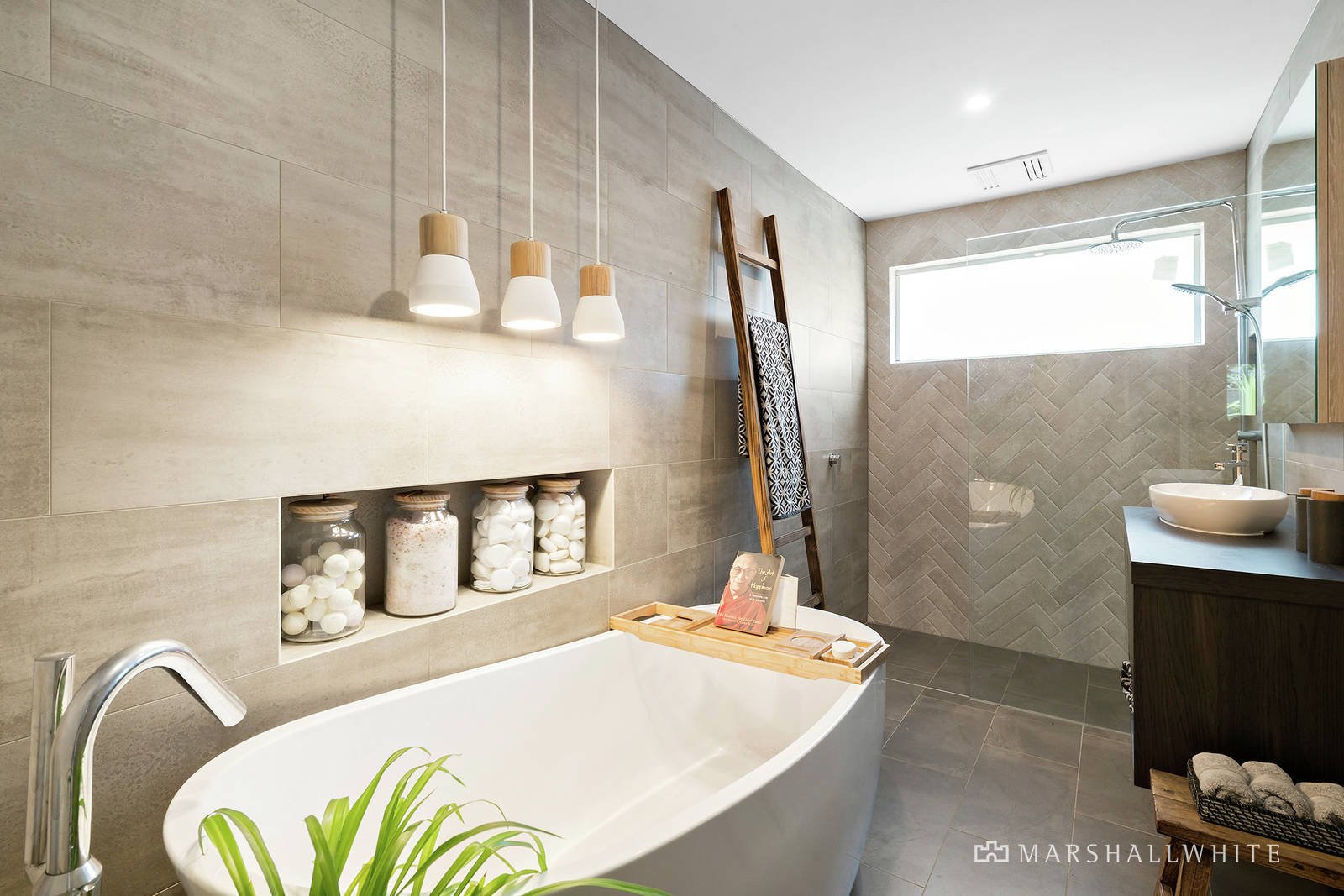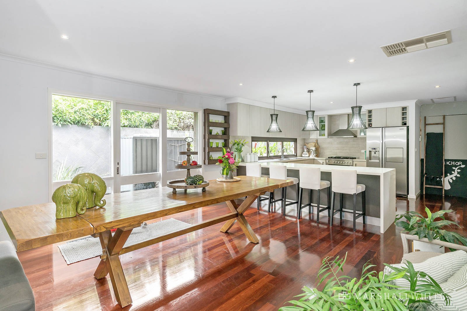 Surrounded by coastal-inspired landscaping with a front courtyard garden, the single-level bagged-brick home graces a fully fenced 744sqm* block. Featuring gleaming Jarrah floorboards, high ceilings, and modern-coastal-inspired feature pendant lighting, the fluid, open-plan spaces include a stylish formal lounge with an open fireplace in limestone surrounds. The home’s main bathroom has been lavishly renovated with floor-to-ceiling matt stone tiling, a large walk-in dual head shower, and has a free-standing tub fitted with a designer bath-spout and hand shower. A powder room, positioned for easy alfresco entertaining access has also been luxuriously updated, along with the mudroom/Euro laundry, complemented by a drying room. Newly carpeted, there are three centrally zoned bedrooms with built-in-robes, while the master suite with walk-in robe and shower ensuite is at the front of the home, along with a study/home office (or 5th bedroom). The gleaming stone kitchen has soft-close vinyl-wrapped cabinetry, an Ilve freestanding oven with gas cooktop, and has a servery window to the Merbau-decked boardwalk sideway. Further enriching the entertaining offerings, is the rumpus/second living room with kitchenette, gas log fireplace, and sliding glass doors that open to the pool deck.