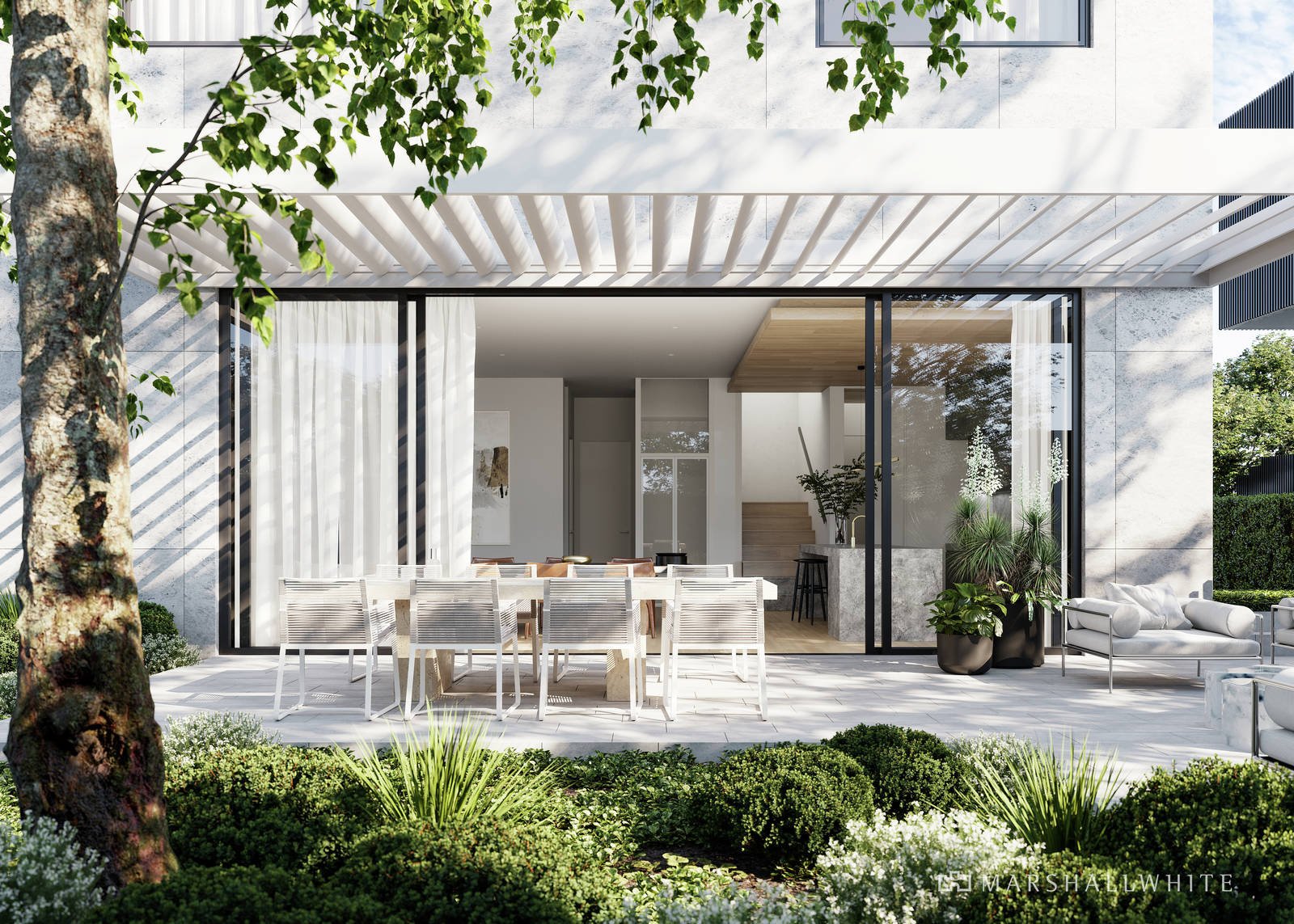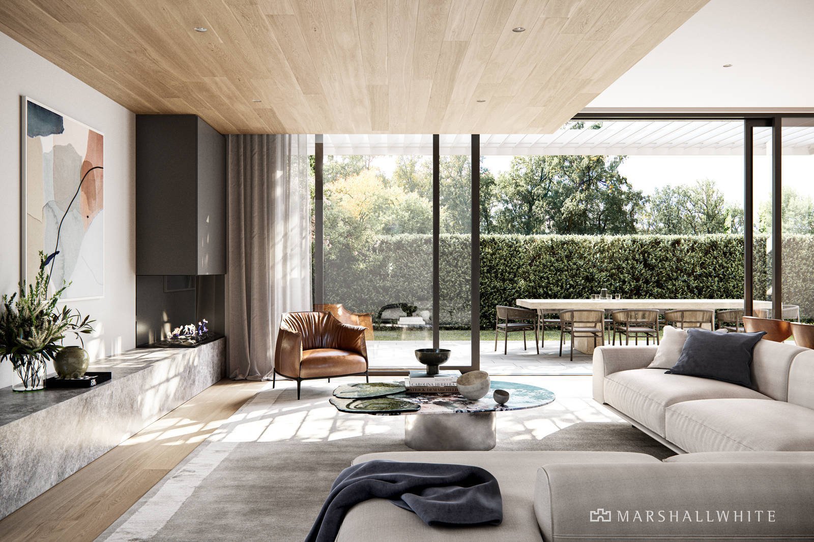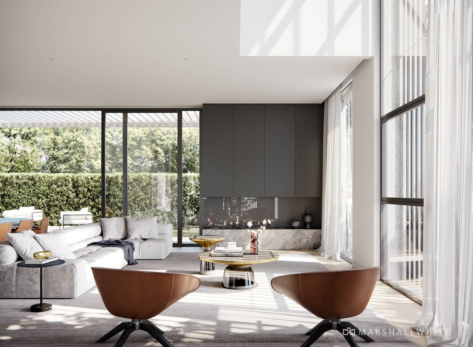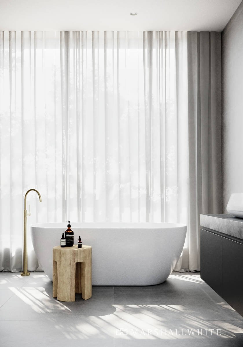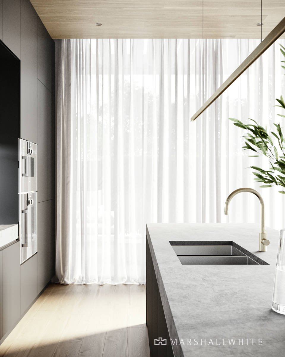 custom stone skirting boards and elegant sheer drapery. Soaring windows capture a magnificent vista of the treetops, creating a lush green backdrop within.