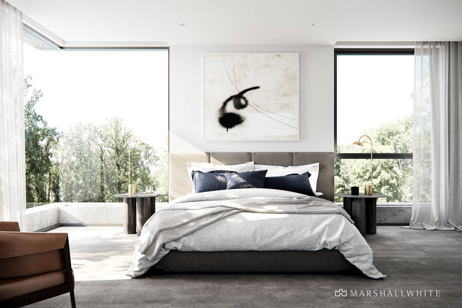 The master bedroom has been designed to cultivate the ultimate sense of calm. Plush and texturally rich, the finishes palette is defined by sumptuous wool carpets,