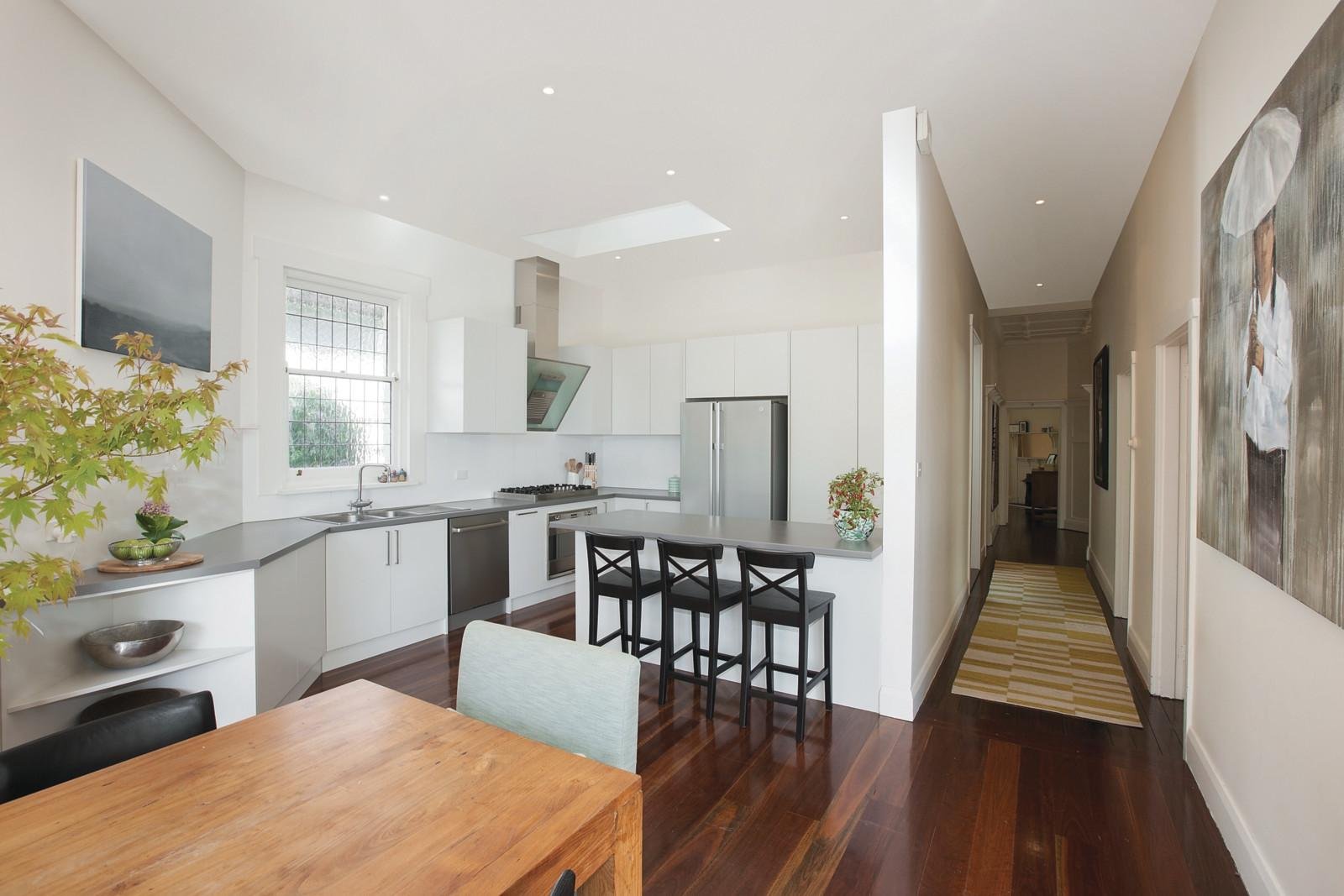 Supremely light and airy throughout, the crisp white decor is brilliantly combined with dark timber floors, diamond leadlight windows and ornate ceilings through the welcoming entrance hall and graciously proportioned sitting room with open fireplace. Three gorgeous bedrooms of generous dimensions and versatile playroom or study/4th bedroom are complemented by two stylish bathrooms. The kitchen featuring a Smeg oven and huge wine cellar below, family living, meals, study area and light-filled dining open out to a fabulous private 2 tiered entertaining deck and northwest garden.