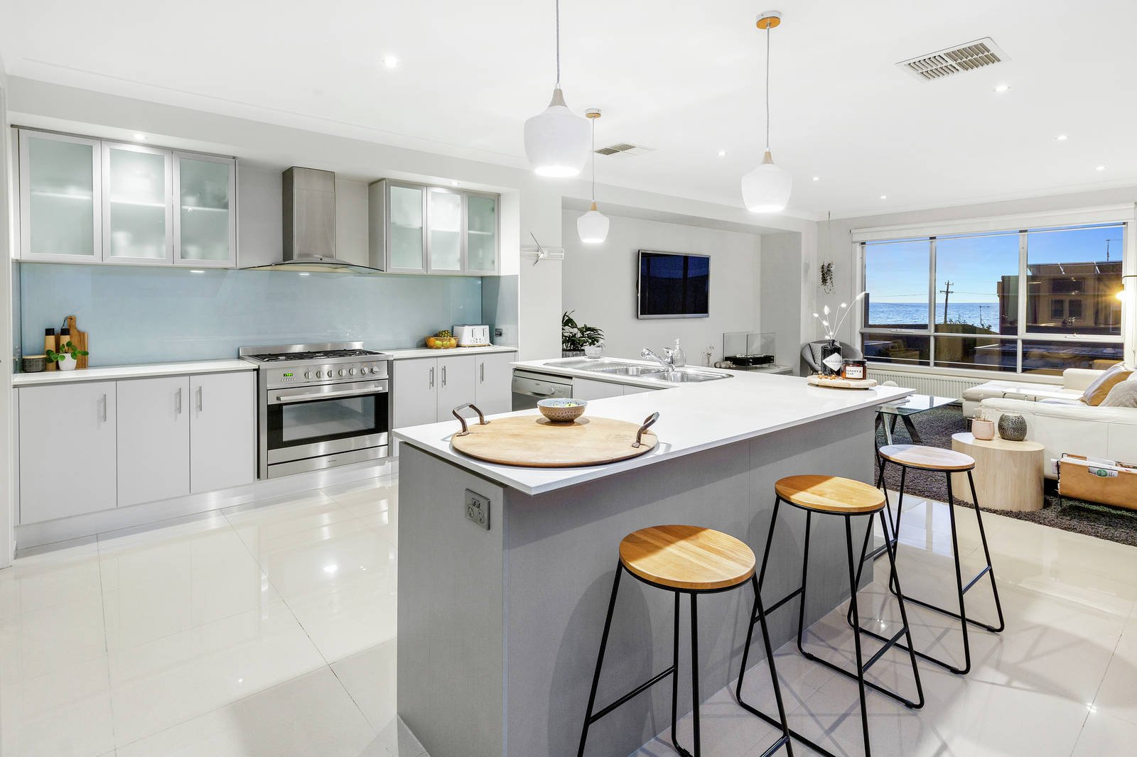 Designed with modernistic form to capture the breathtaking views of Port Phillip Bay, the considered floorplan unveils an upstairs family domain encompassing casual living, dining and kitchen inclusive of a large island stone bench, countless storage, WIP and standalone 900mm oven. Large windows and glass stacker doors invite the views inside, opening to enhance the entertaining opportunities spilling onto the rear deck, whilst welcoming a delightful sea-breeze.