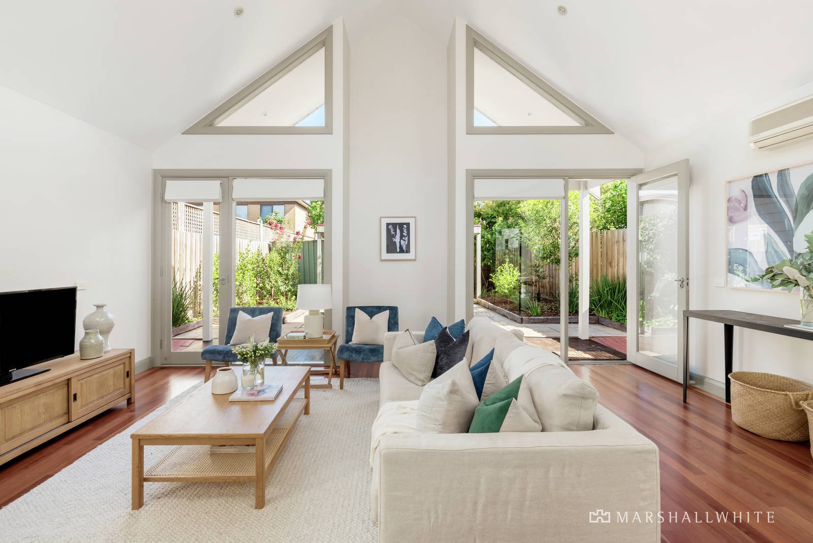 Baltic pine floors flow through the wide hall to two double bedrooms, a chic bathroom and the gorgeous main bedroom with stylish en suite, built in robe and French doors to a side garden. Beneath a soaring vaulted ceiling with north-facing clerestory windows, the generous living room, inviting dining area and gourmet granite kitchen open to the private garden with paved entertaining terrace and secure carport accessed from a rear right of way.