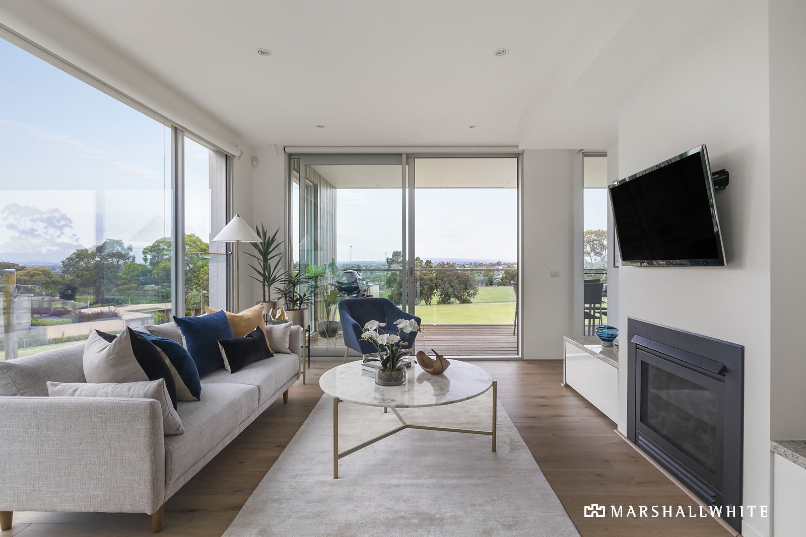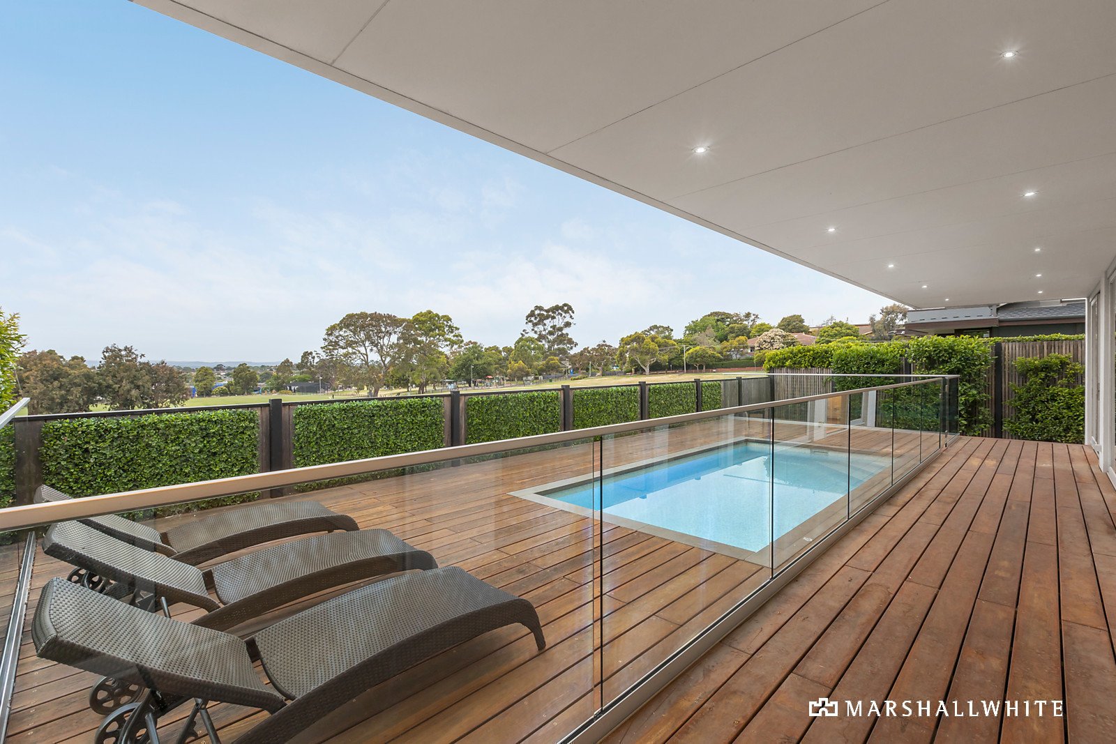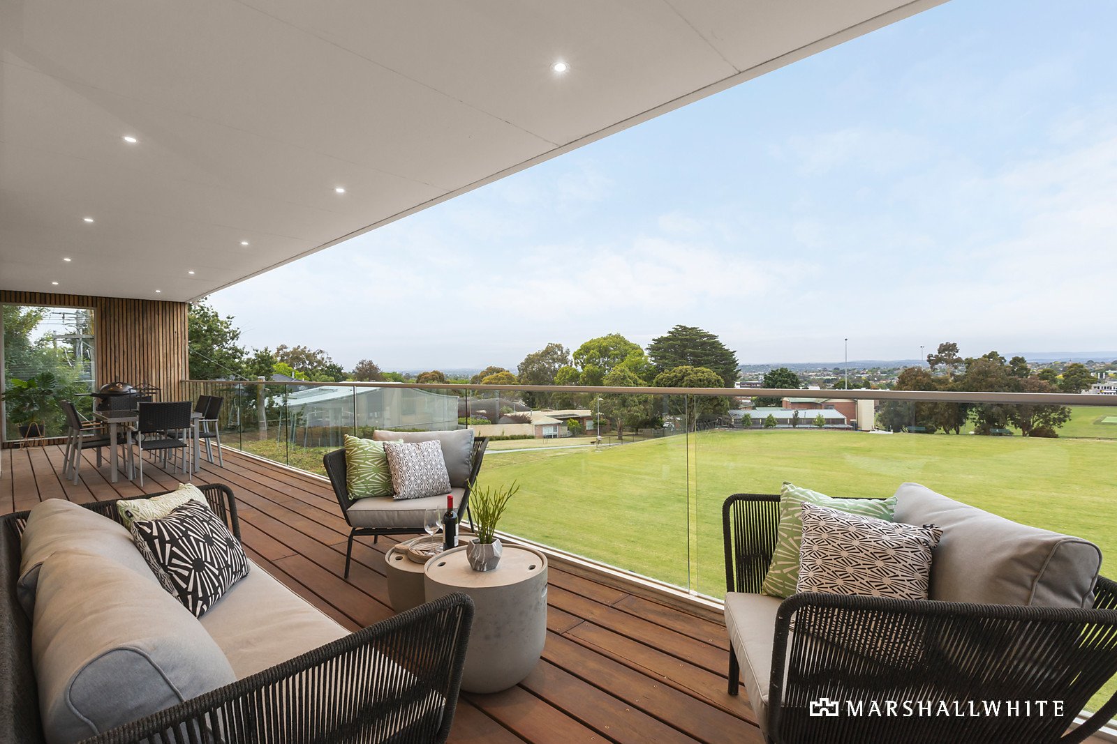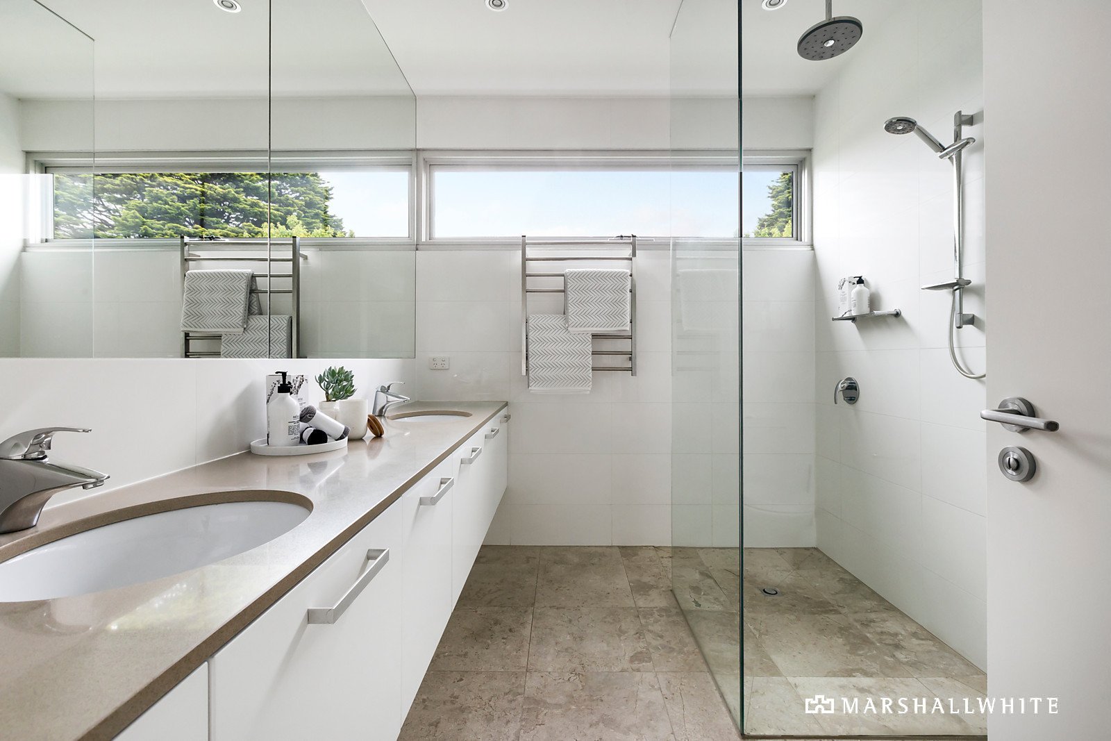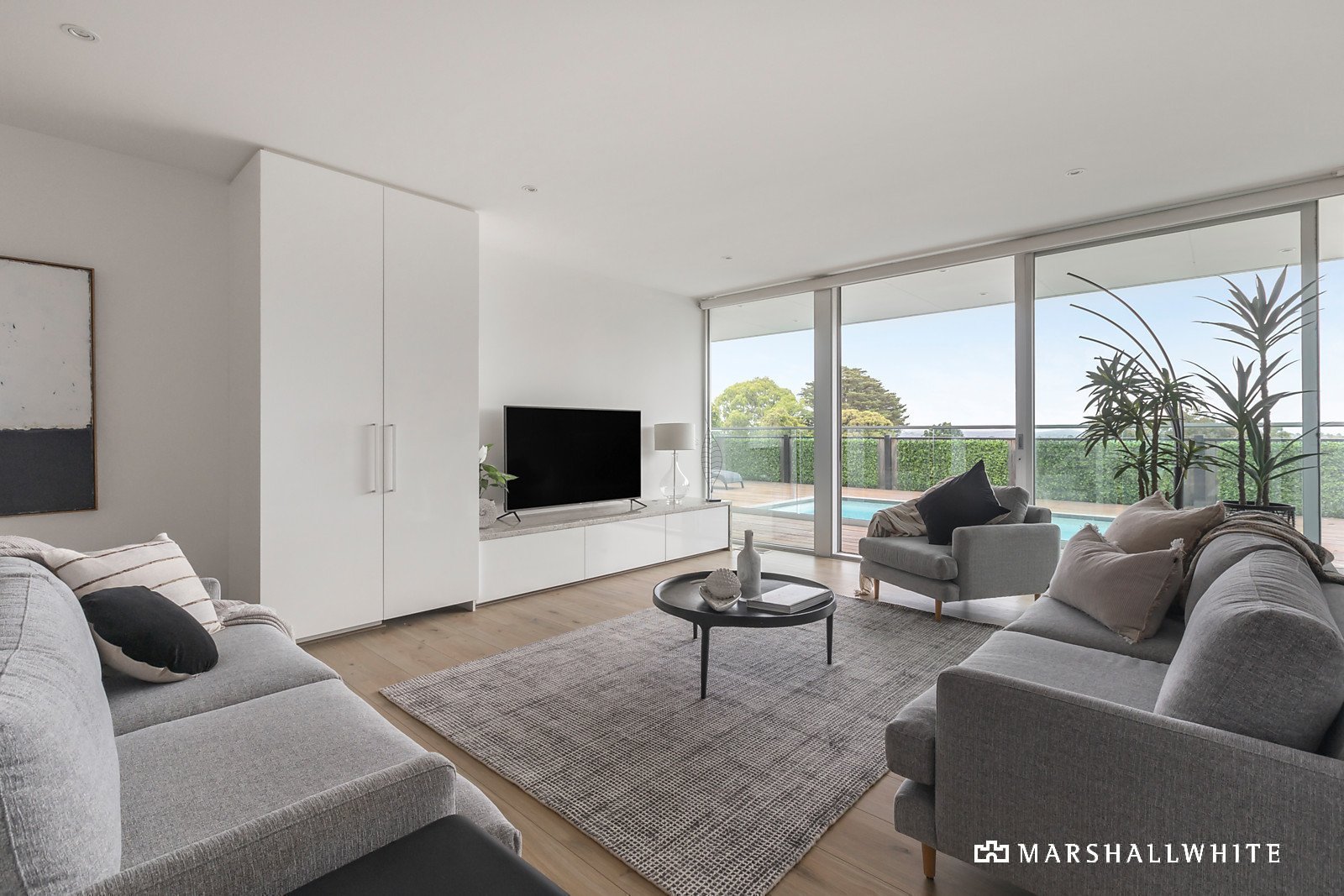 Bathed in northern light through floor-to-ceiling glass, the upper level is devoted to living and entertaining. The sitting room with a gas log fire and the separate dining room overlook the garden. A raised ceiling and clerestory windows accentuate the exceptional scale of the family living room which opens out to a full-width undercover north-facing deck commanding uninterrupted views over the park to the Macedon and Dandenong Ranges. Behind fully recessed doors, the gourmet kitchen is appointed with stone benches, Miele appliances and a butler's pantry.