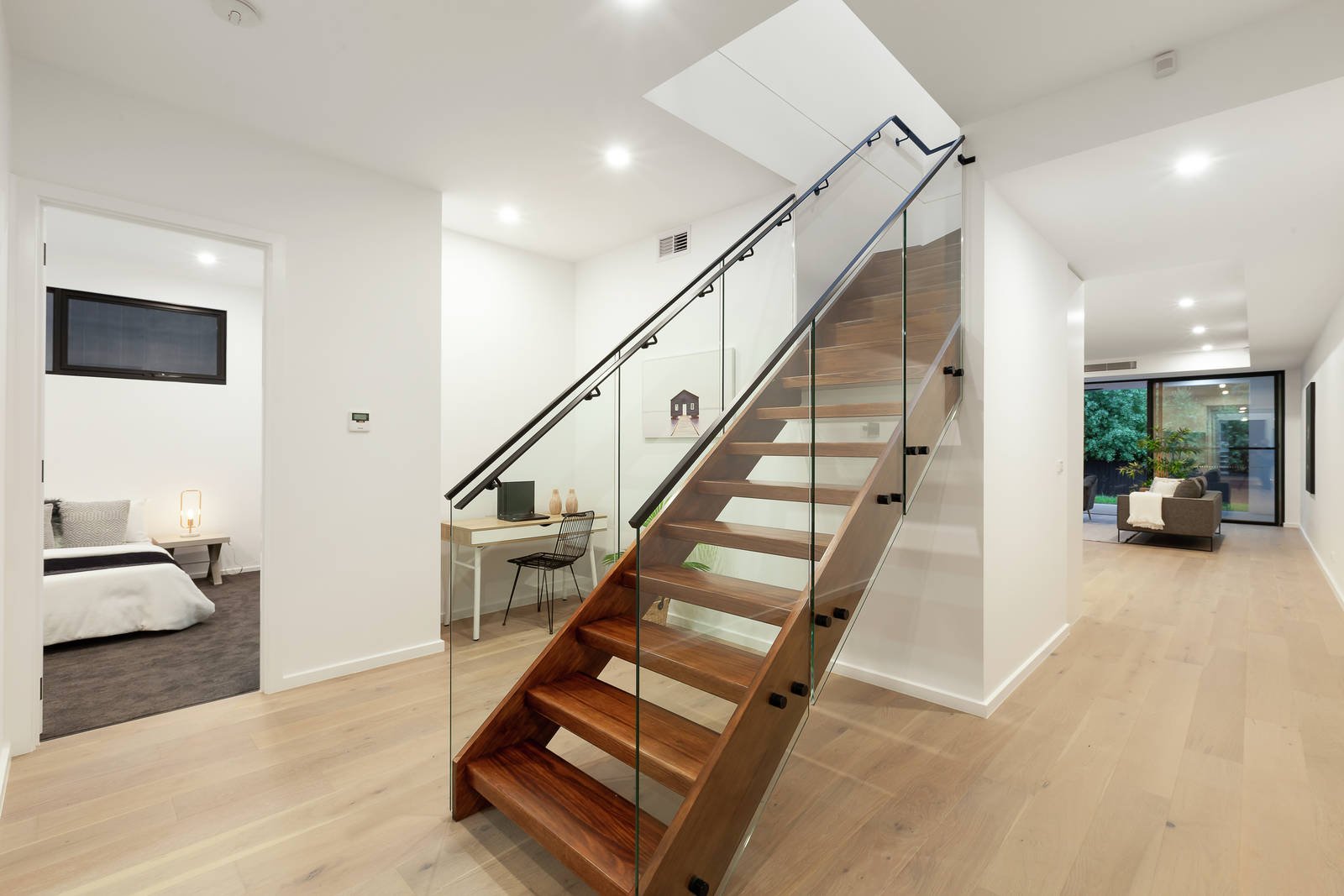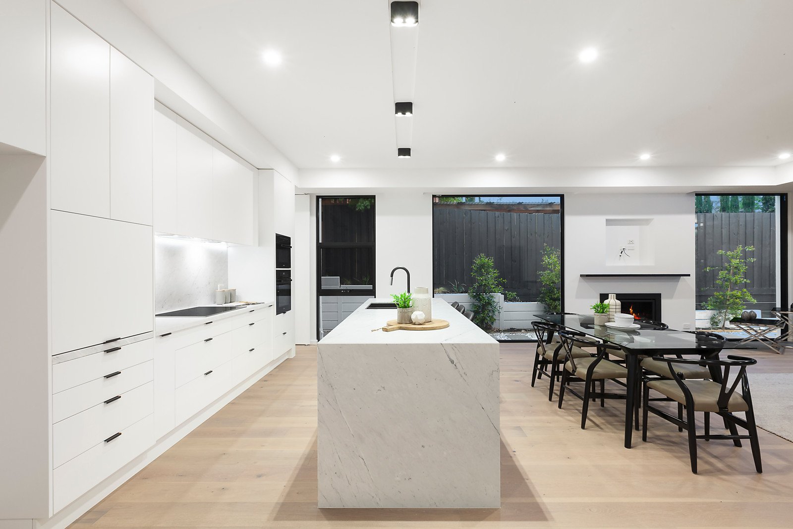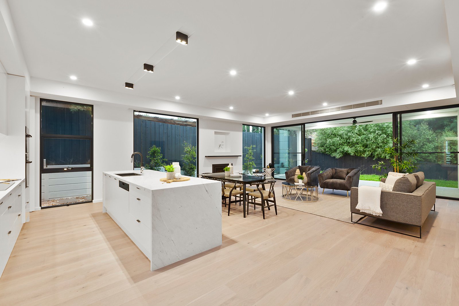 The imposing entrance hall with its soaring double height ceiling and wide oak floors creates an instant impact that continues through to the expansive open plan living and dining room with a gas log fire and sleek premium kitchen appointed with Miele appliances, marble benches and second kitchen/butler's pantry. Full width glass sliders connect the living to a private northwest-facing garden and fabulous covered al fresco dining terrace with ceiling fan. Generous family accommodation comprises a downstairs bedroom with chic en suite and built in robe, and upstairs, a palatial main bedroom with lavish en suite and walk in robe, two additional bedrooms with robes, a spacious retreat and stylish bathroom.
