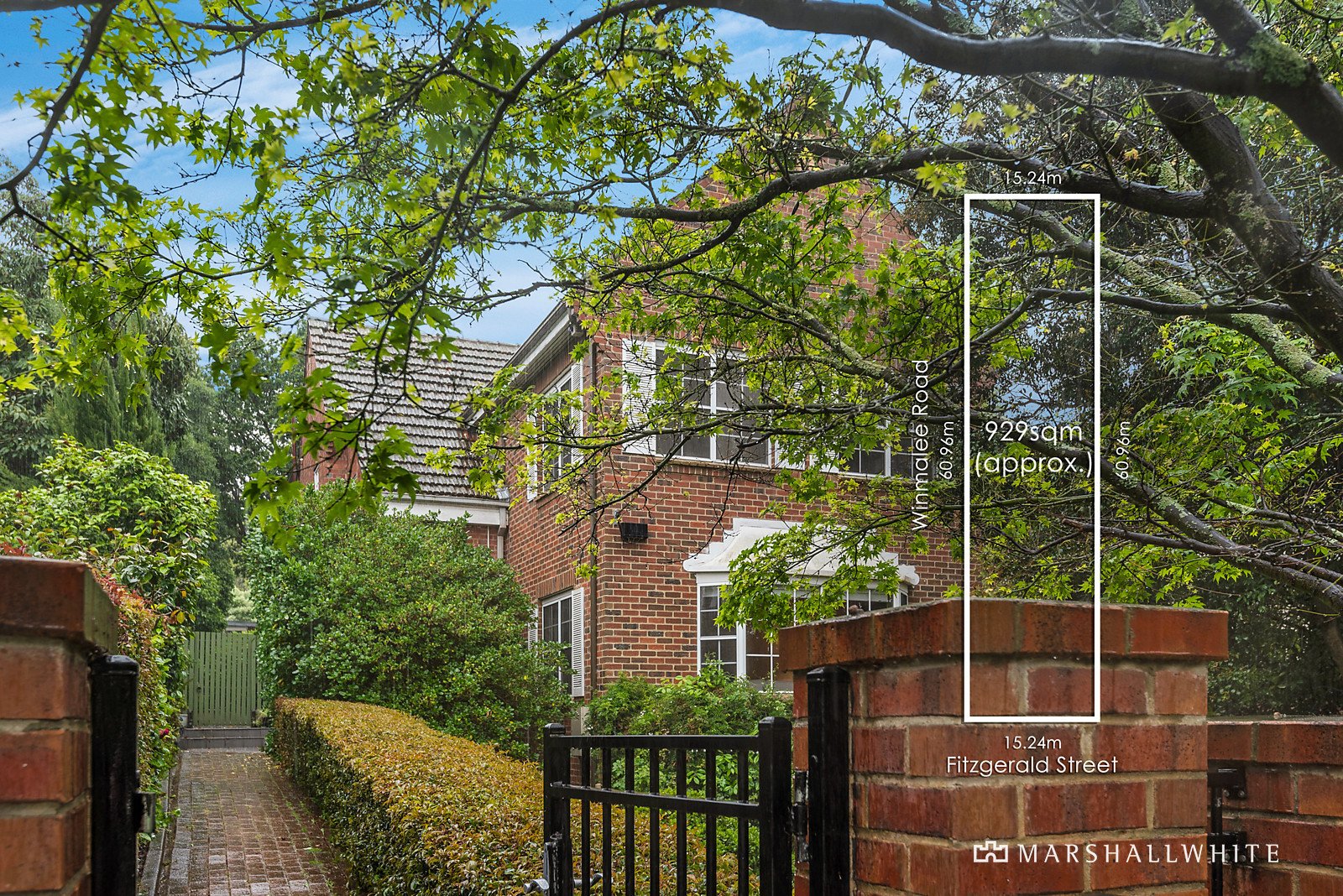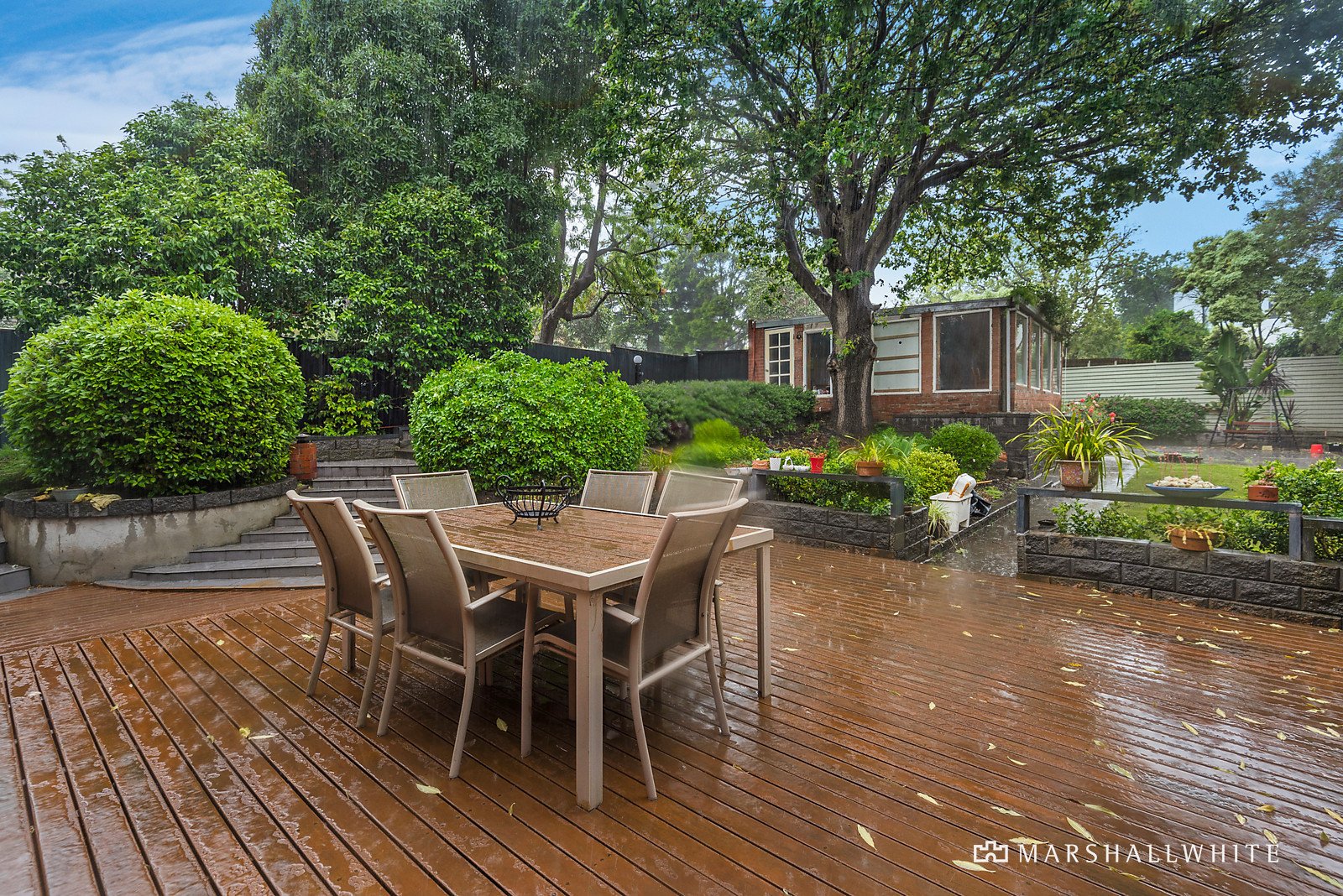 Set well back behind a deep established garden, the wide entrance foyer introduces an expansive living room with a bay window offering leafy views and an elegant dining room boasting timber floors. The gourmet kitchen appointed with stone benches and Blanco oven leads out to the deep private northwest garden with garden shed and garage accessed from Winmalee Rd. The downstairs main bedroom with en suite is matched upstairs by a second bedroom with walk-in robe and en suite, two additional bedrooms with built-in robes, a study and a third bathroom.