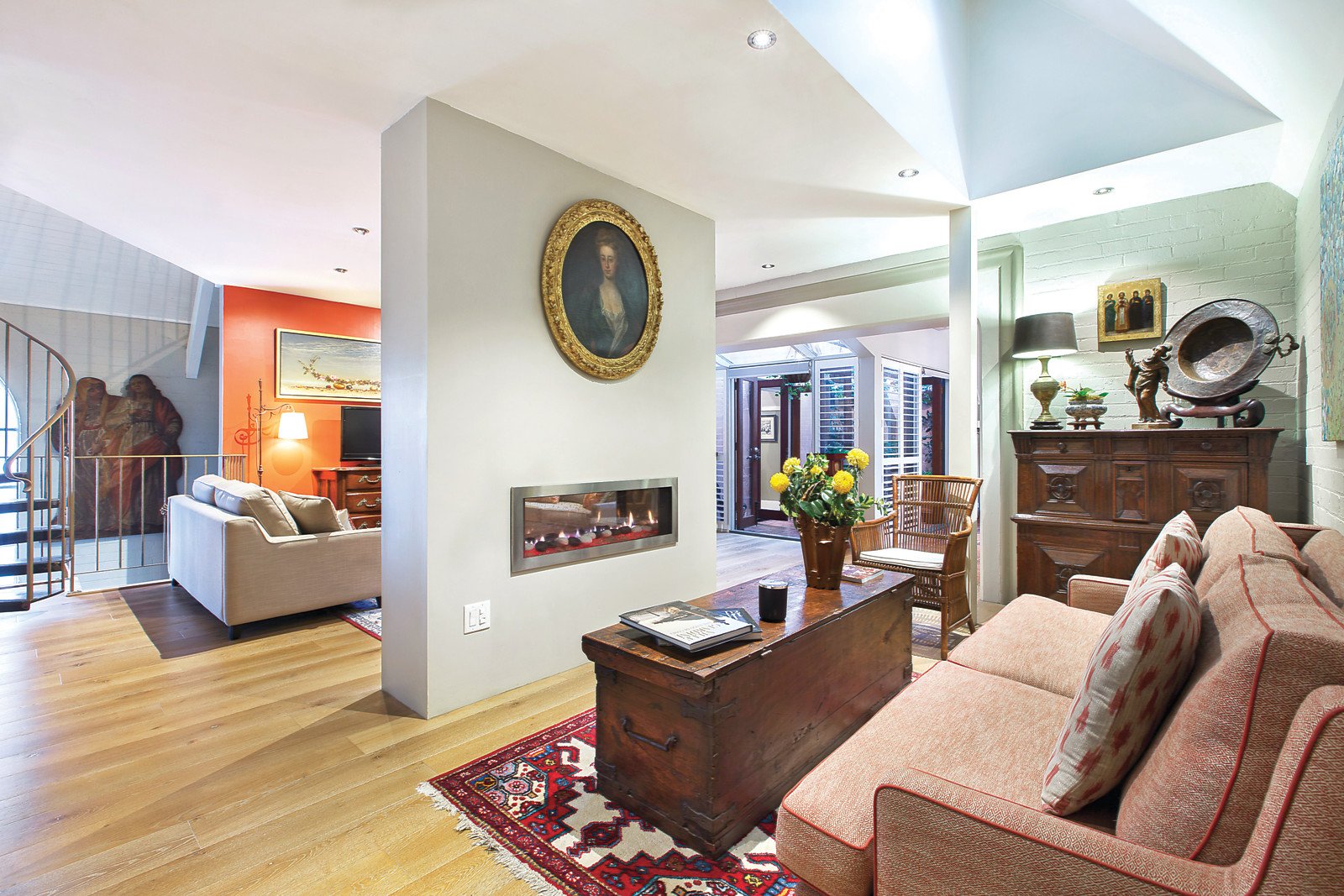 Behind the distinctive original hall doors, oak stairs lead up to two inviting living rooms separated by a 2-way gas pebble fireplace and opening to a lush private central courtyard. Soaring original vaulted ceilings preside over the light-filled dining area (open fireplace) and stylish gourmet stone kitchen which opens out to a terrace. A fabulous double bedroom and gorgeous bathroom are matched upstairs by the main bedroom with designer en-suite with freestanding bath and study nook. An additional bedroom with chic en-suite and courtyard are on the lower level.