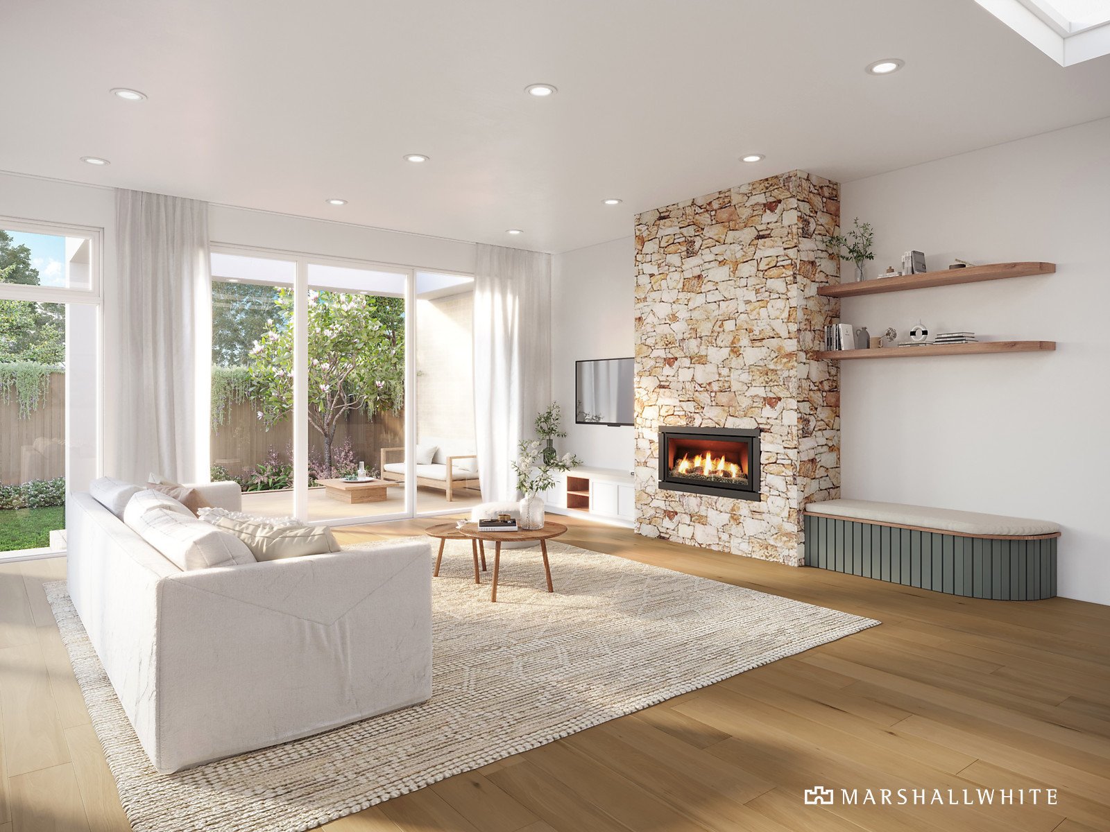 ? The use of warm natural stone to the façade and fireplace surround
