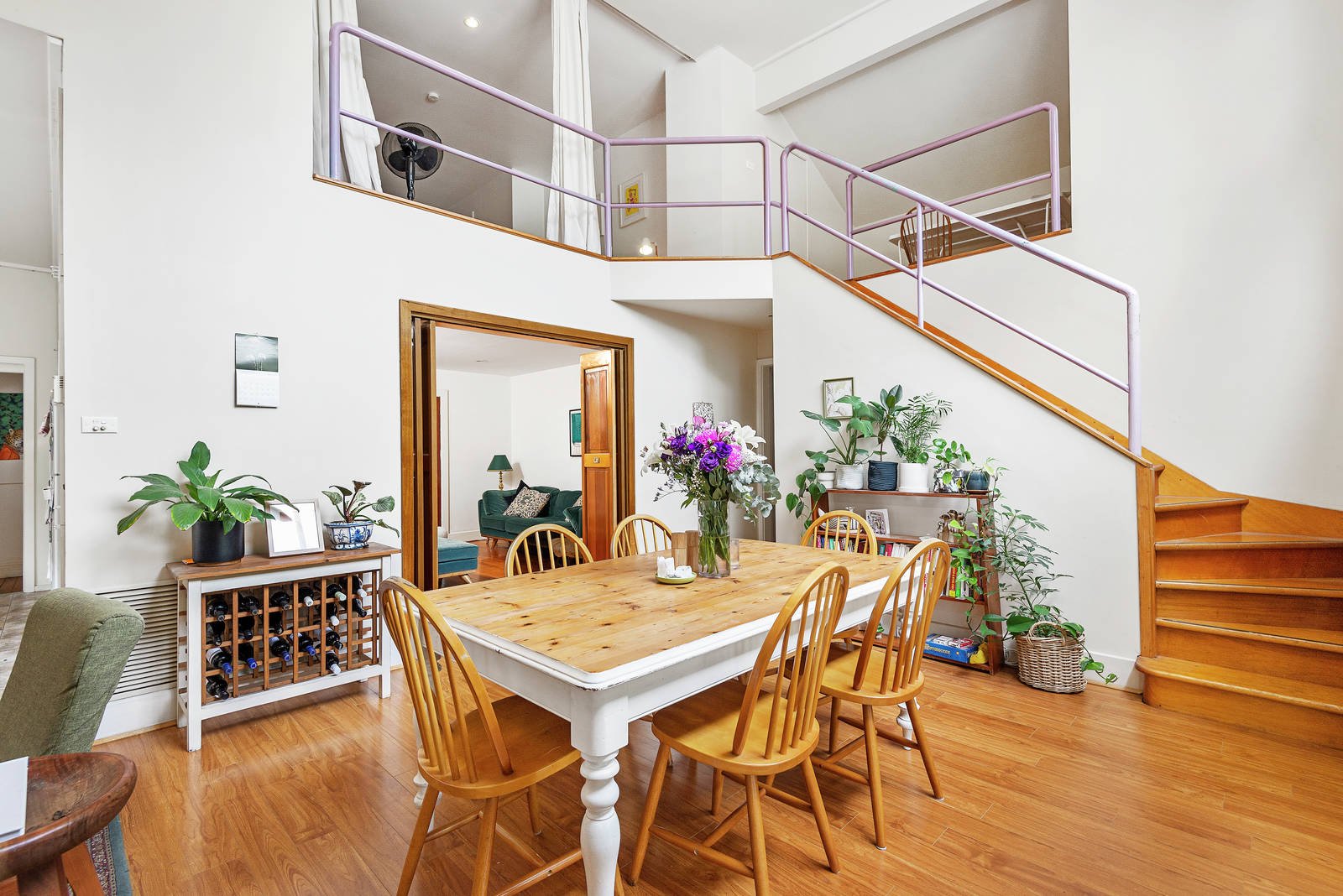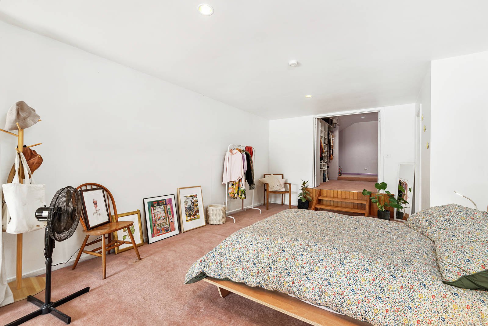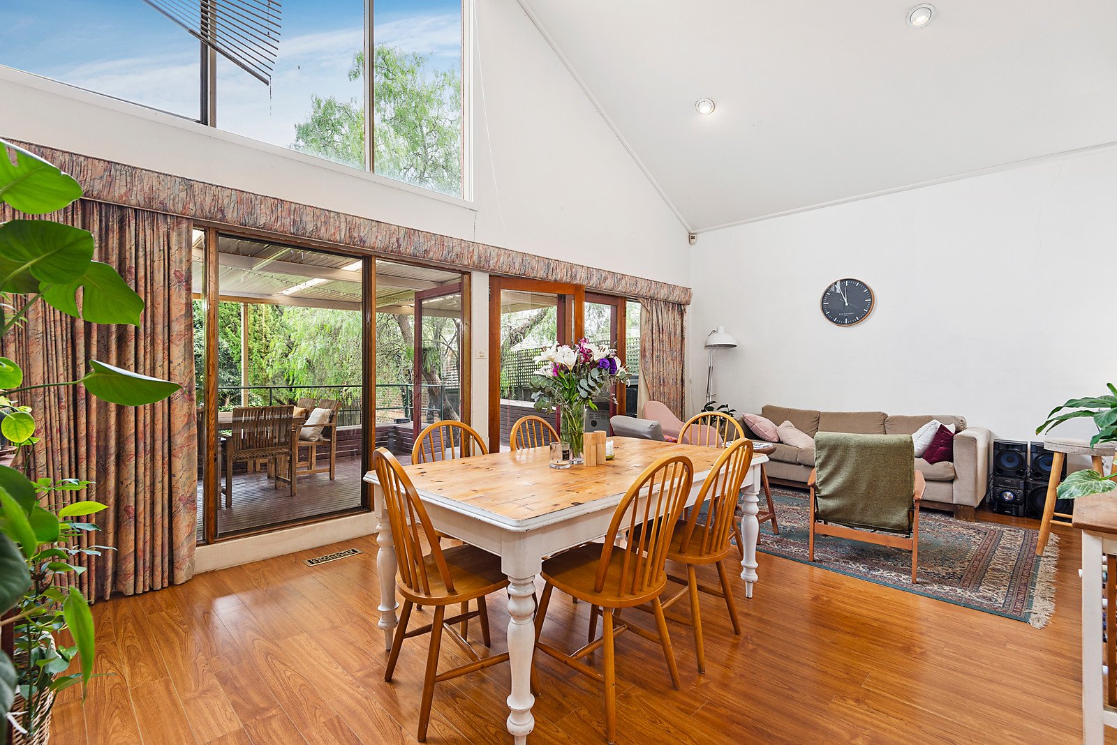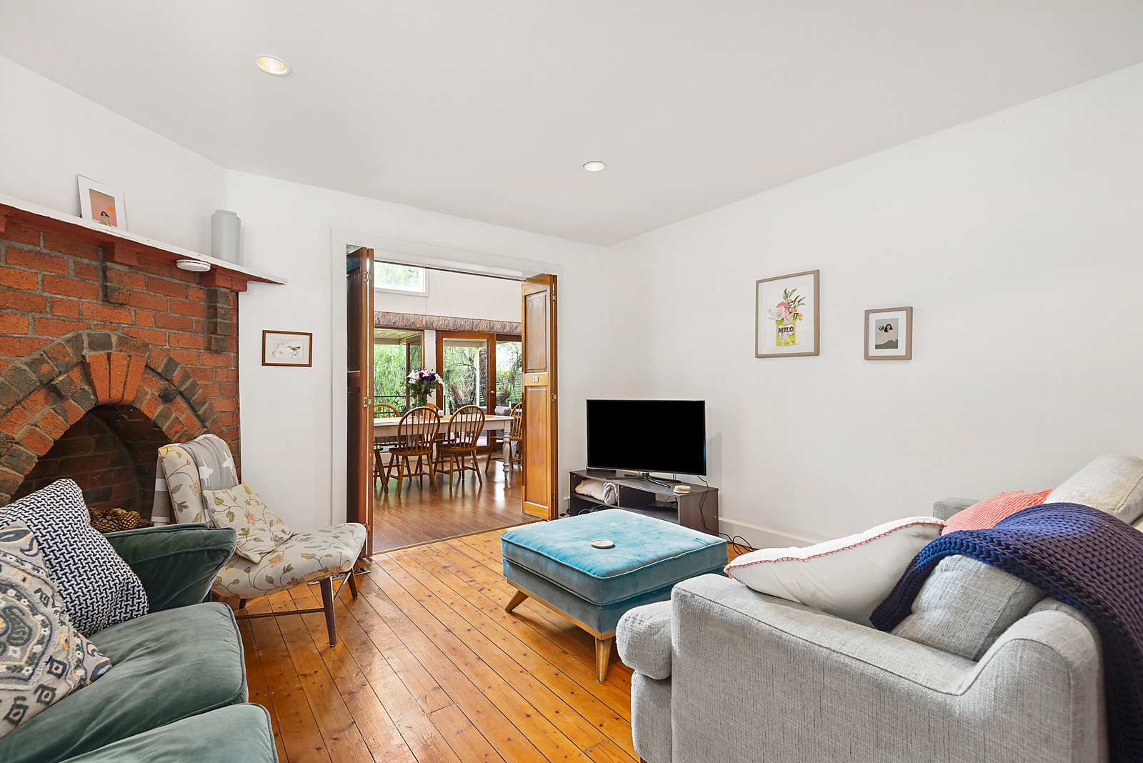 The wide entrance hall featuring Baltic pine floors, high ceilings, and four picturesque leadlight windows flows through to an inviting sitting room with open fire, a large well-appointed kitchen, and a generous living and dining room beneath a soaring cathedral ceiling. The living area opens to a spacious covered entertaining deck overlooking the deep private northwest-facing garden. There is also a versatile lower-level rumpus room/studio opening to the garden. An abundance of accommodation comprises four double bedrooms and two bathrooms on the ground level while upstairs there is a 5th mezzanine bedroom with ensuite, huge walk-in robe, and a study nook.