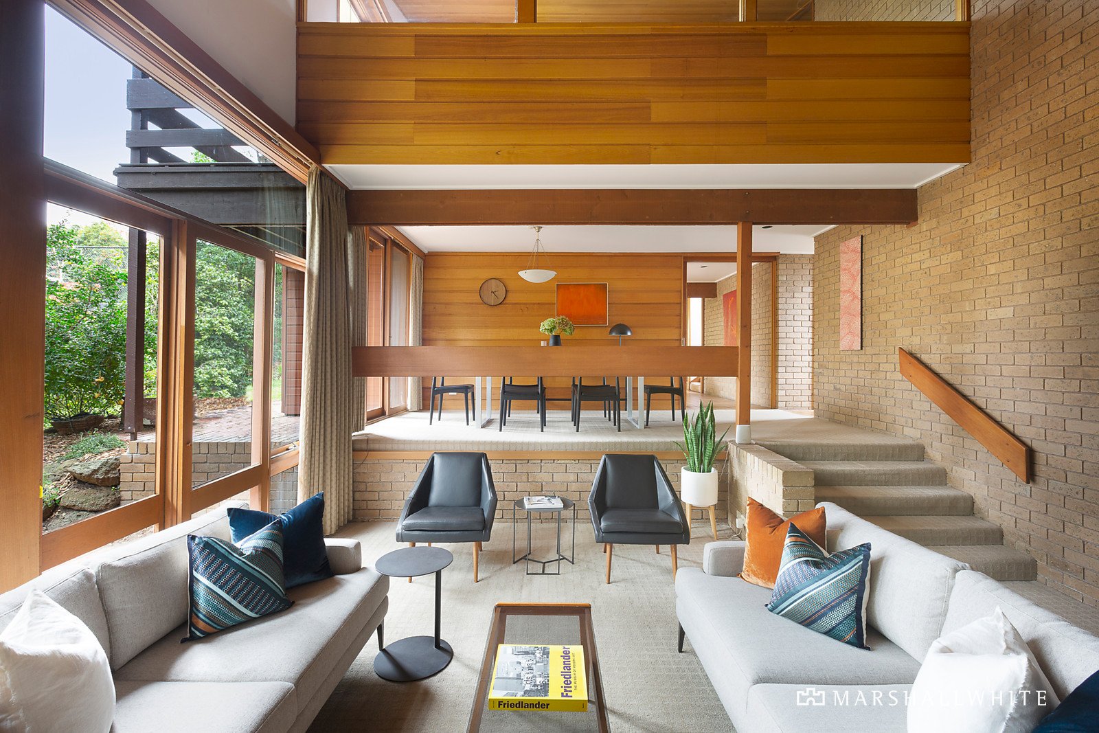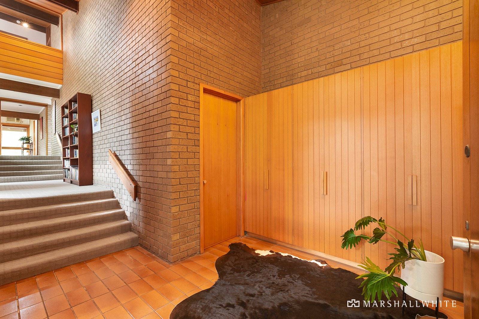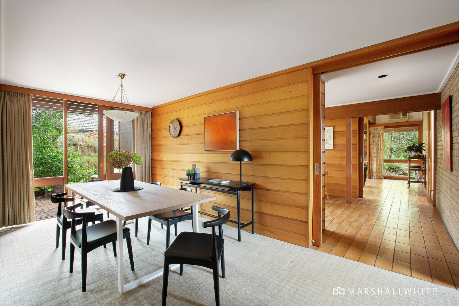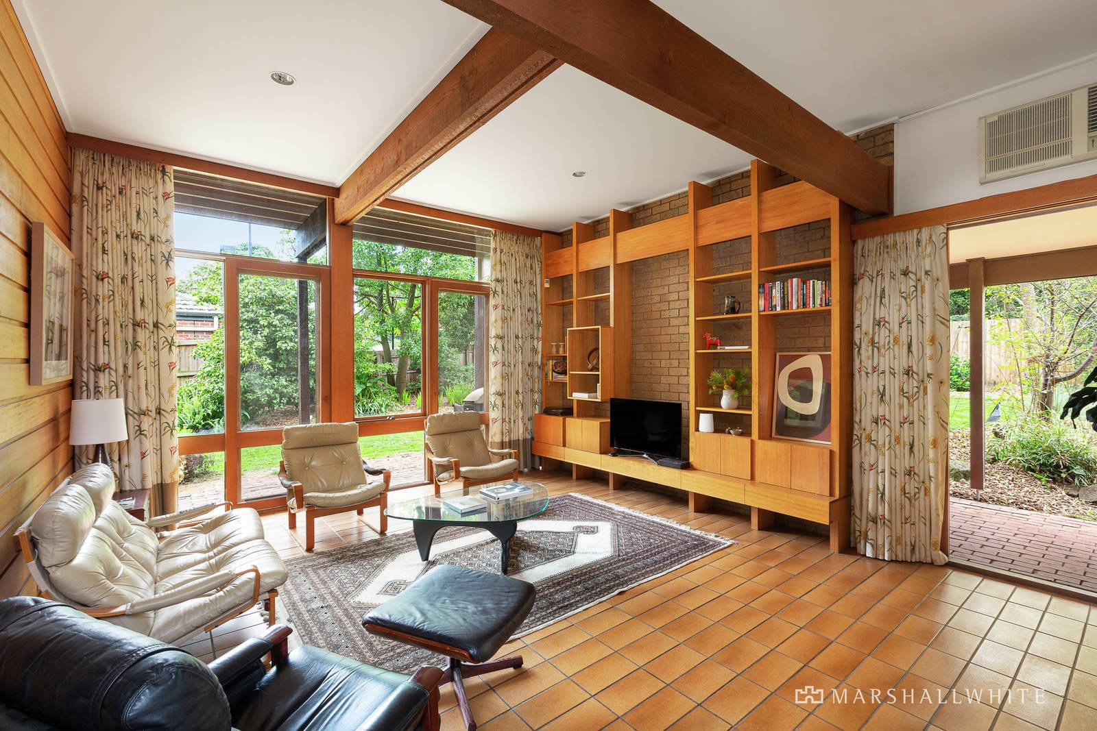 This attractive contemporary solid brick family home, a classic example of 1970s architecture, designed by the well regarded Architect of the time, Kenneth Edelstein. Resulting in a split-level home dominated by space and northern sunlight into all rooms of the house; which features big windows with garden vistas, warm timber panelling, beams and exposed brick surfaces plus a soaring roof line, typical of the era.