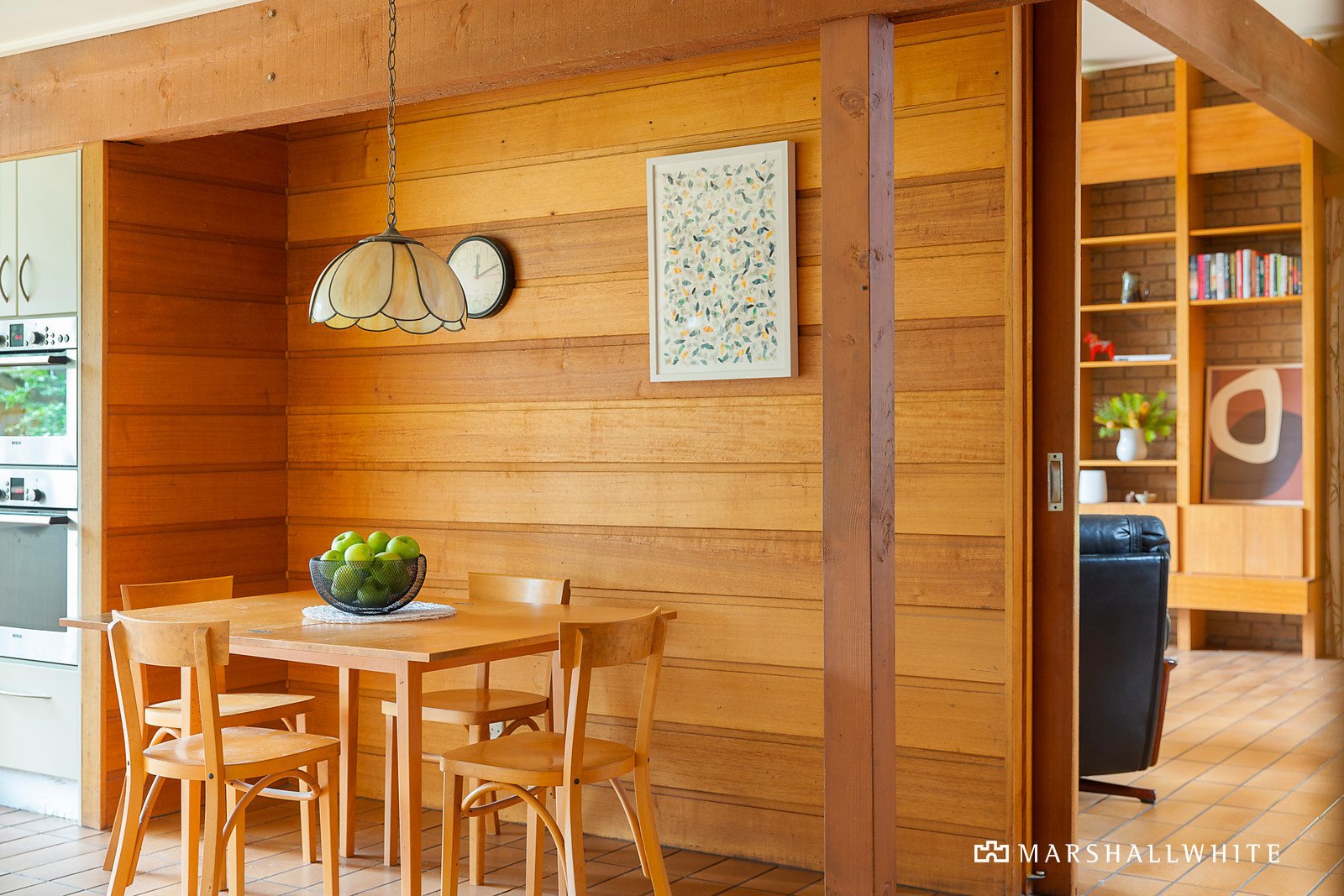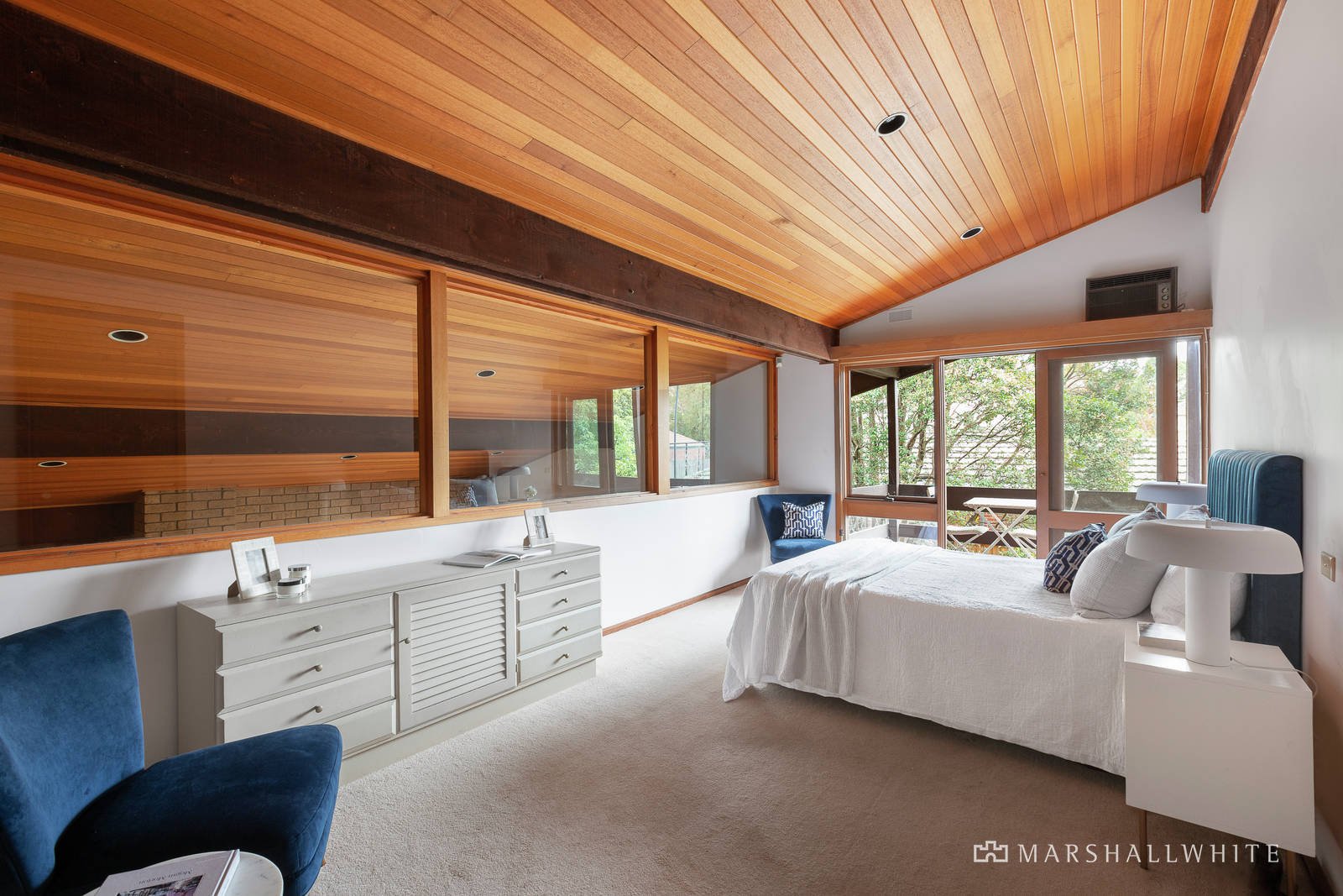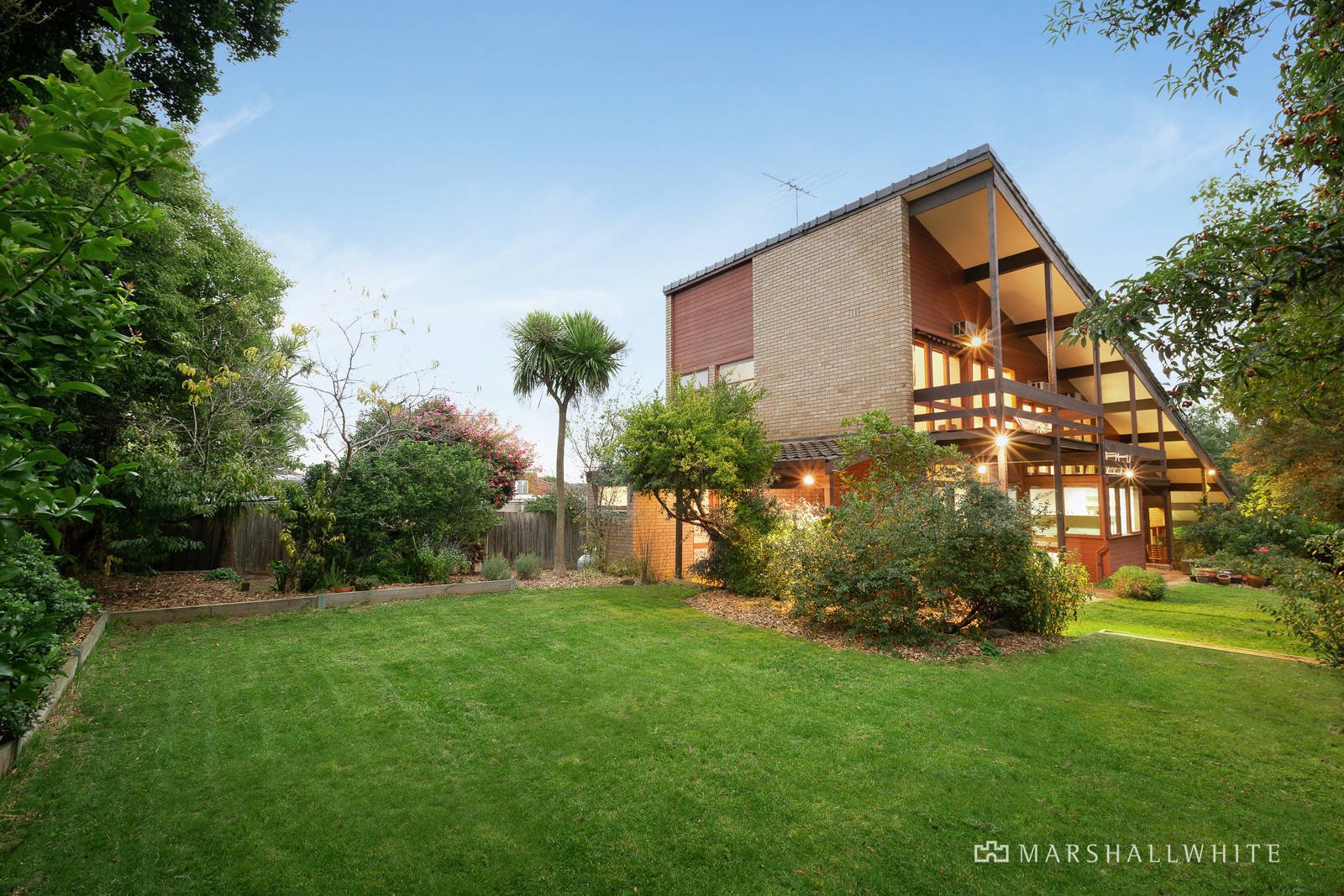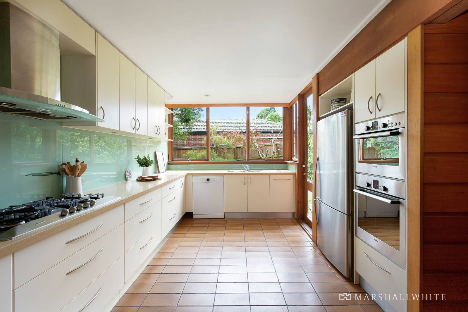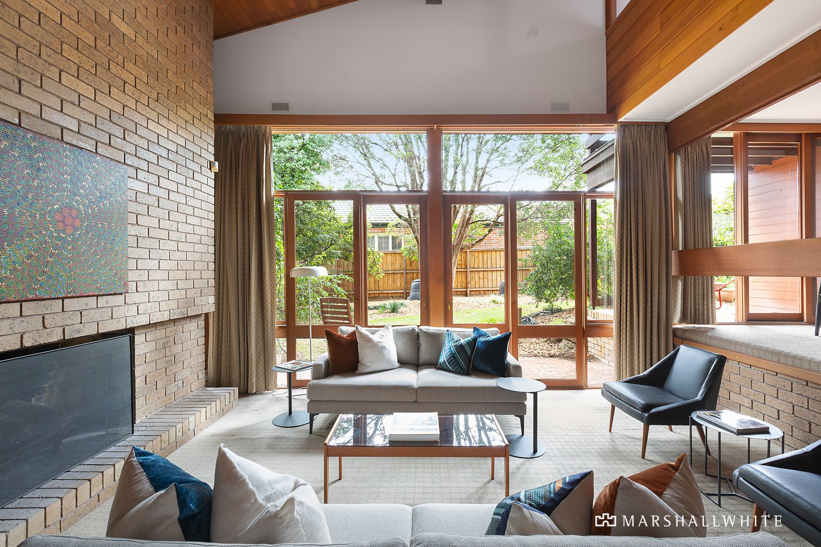 This attractive contemporary solid brick family home, a classic example of 1970s architecture, designed by the well regarded Architect of the time, Kenneth Edelstein. Resulting in a split-level home dominated by space and northern sunlight into all rooms of the house; which features big windows with garden vistas, warm timber panelling, beams and exposed brick surfaces plus a soaring roof line, typical of the era.
