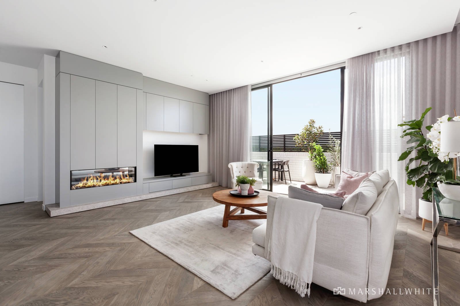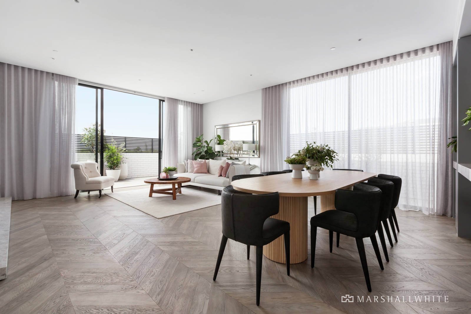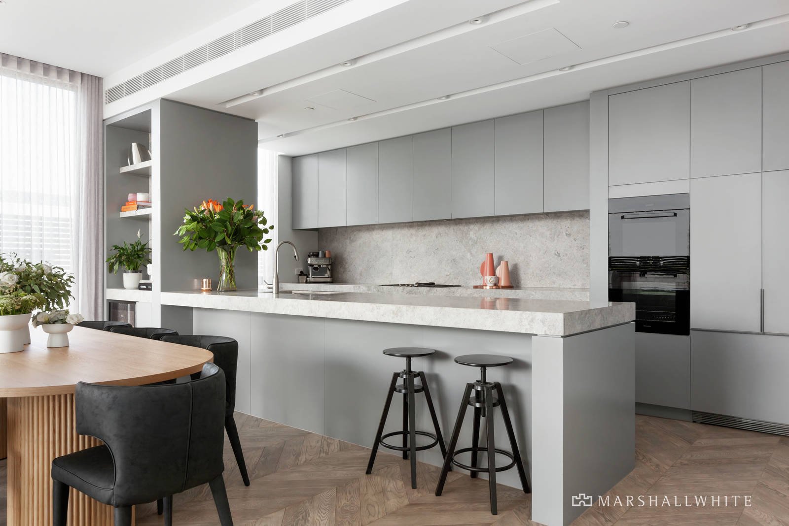 Quietly positioned to the rear of the complex the apartment is highlighted by neutral tones and natural textures in an interior featuring high ceilings and a light-filled ambience. Beautiful wide oak herringbone parquetry floors flow through the hallway leading to a generous open-plan living and dining area which includes a CDK Stone and prestige Miele equipped kitchen including a Fisher & Paykel integrated fridge/freezer and gas log fire; opening to a sunny wrap-around balcony with ample space for indoor/outdoor relaxing or entertaining. Complemented by two superb bedrooms, the main has WIRs, a sparkling ensuite and east-facing private balcony; plus a family bathroom and separate laundry. Other features of this stunning apartment include video intercom entry, ducted heating and cooling, Vintec wine fridge, ample internal storage and lift access to three secure basement car spaces and a storage locker.