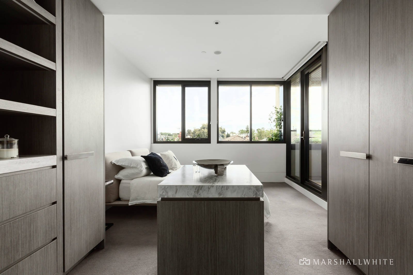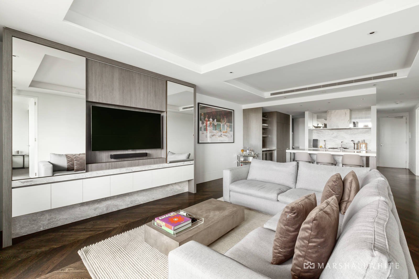 Bespoke joinery, swathes of marble and rich oak parquetry floors define the generous open plan living and dining room with a premium entertainer's kitchen boasting marble benches and splashback, Gaggenau appliances, Liebherr integrated fridge/freezer and a bar with 2 Vintec fridges. The living area opens to a large private undercover al fresco dining balcony enjoying leafy views over the rooftops. The gorgeous main bedroom with a fitted dressing room and opulent marble en suite with bath complements additional bedroom with built in robes and a stylish bathroom.