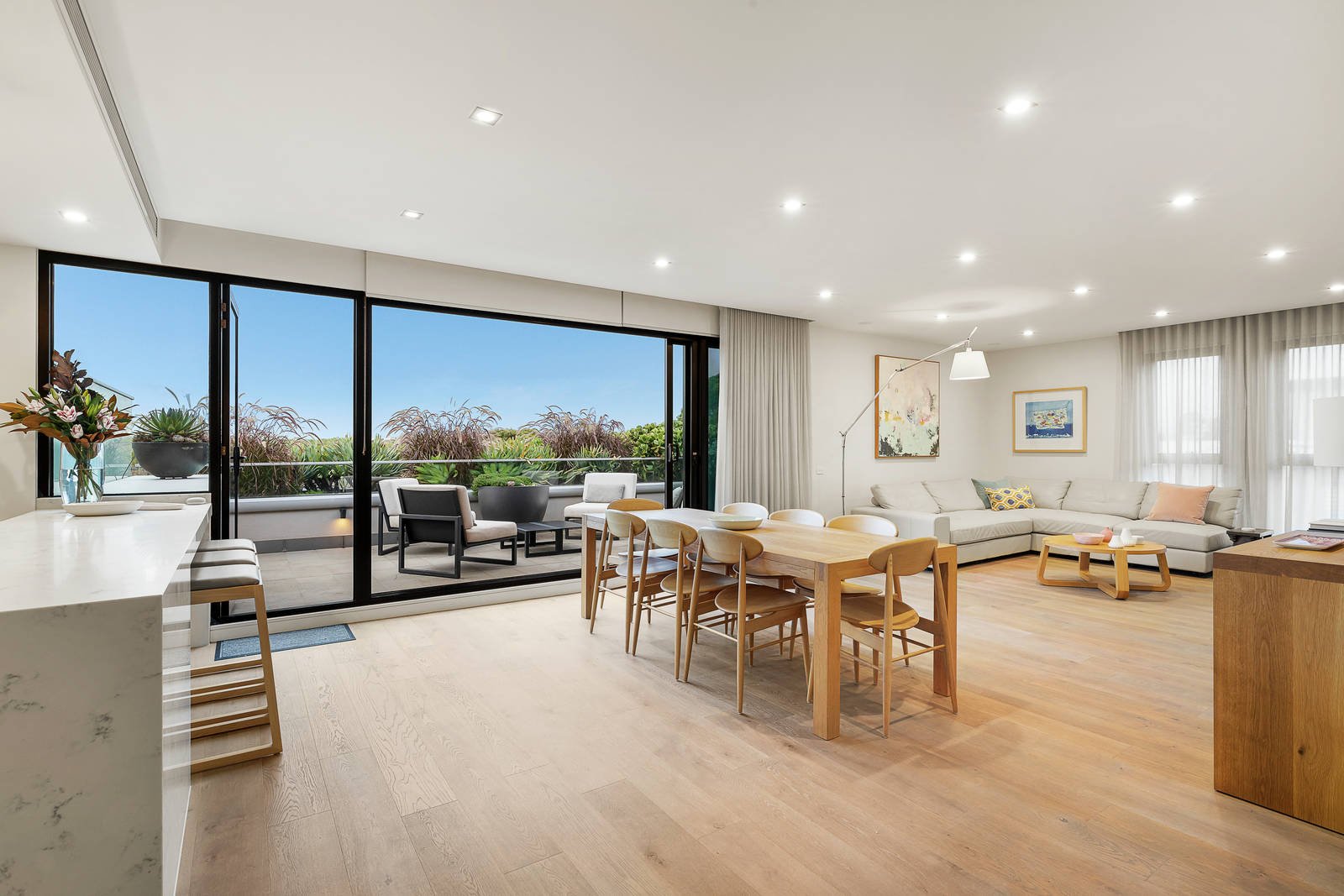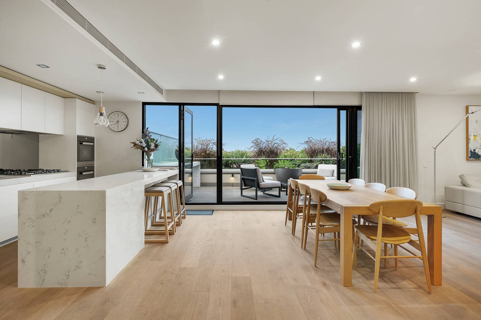 Limed oak floors flow through the entrance hall to an expansive open plan living and dining room served by a premium kitchen appointed with stone benches, Miele appliances, integrated fridge/freezer and a butler's pantry. Stacking glass sliders (with concealed flyscreen) extend the living space out to the sensational north-facing private terrace paved with bluestone and featuring built in serving benches, auto sun-awning and glorious Jane Jones landscaped garden surrounds. The generous main bedroom with dual robes, lavish ensuite and balcony complements a second bedroom with chic ensuite, robe, built in desk and balcony, third bedroom with robe and balcony, a fitted home office and a stylish 3rd bathroom.