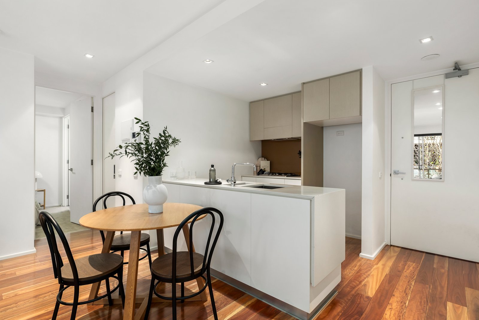 A sleek, crisp white interior and well-designed floorplan features engineered floorboards flowing to a main bedroom with ample built-in robes, an ensuite and terrace access. A second bedroom also with built-in robes could double as a home office and sits alongside a separate pristine bathroom and a Euro laundry. The open-plan living and dining area includes a smart CaesarStone and prestige Blanco appointed kitchen opening through floor-to-ceiling sliding doors to a private terrace overlooking a first-floor garden – providing ample space indoor/outdoor entertaining or enjoying a morning coffee or evening drink. Other features of this must-see apartment include video intercom entry, lift access, ducted heating & cooling, high quality fixtures plus a secure basement car space and storage locker.