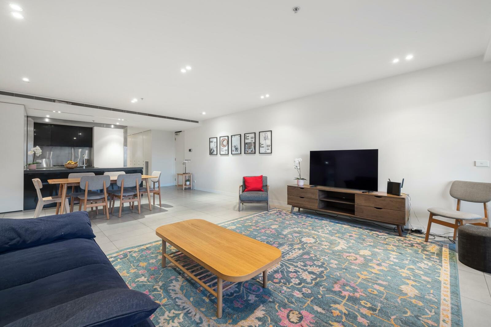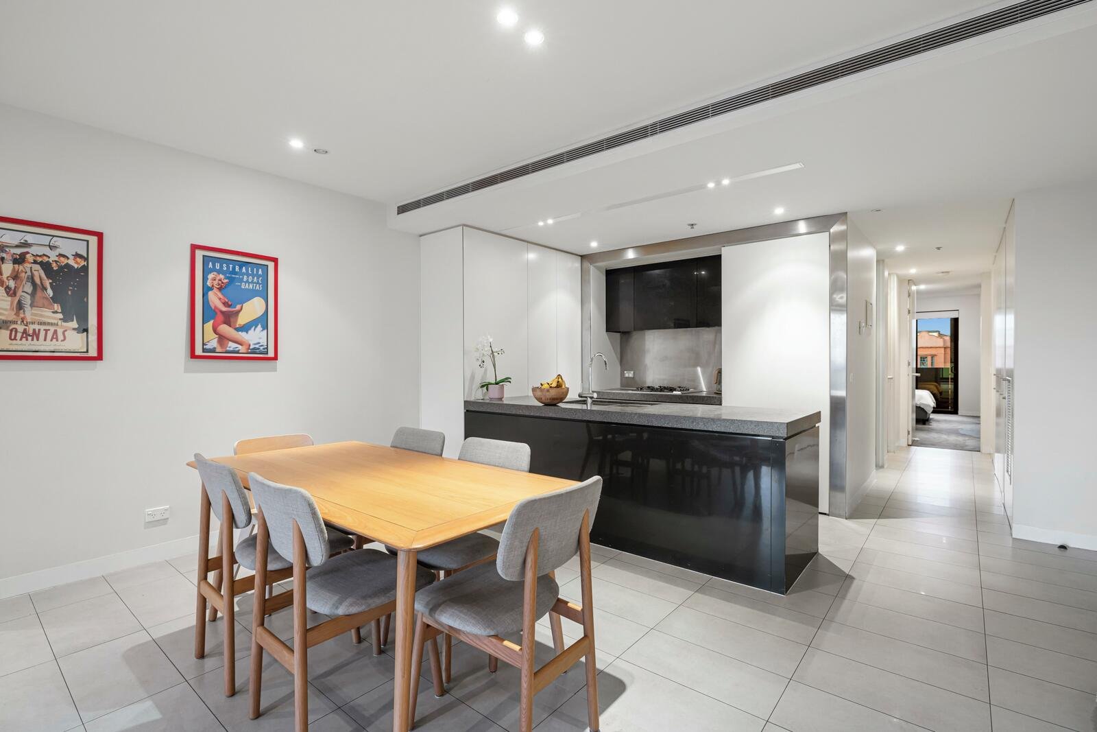 Set on the second floor of a secure building, the home enjoys a spectacular outlook over Luna Park and the Palais Theatre, framed by palm trees and the bay beyond. The expansive open-plan living and dining area flows seamlessly to a deep, curved terrace—perfect for entertaining or simply soaking in the ever-changing scenery.