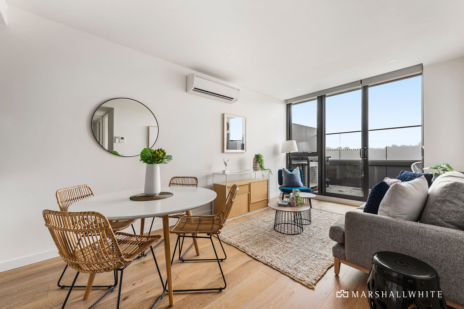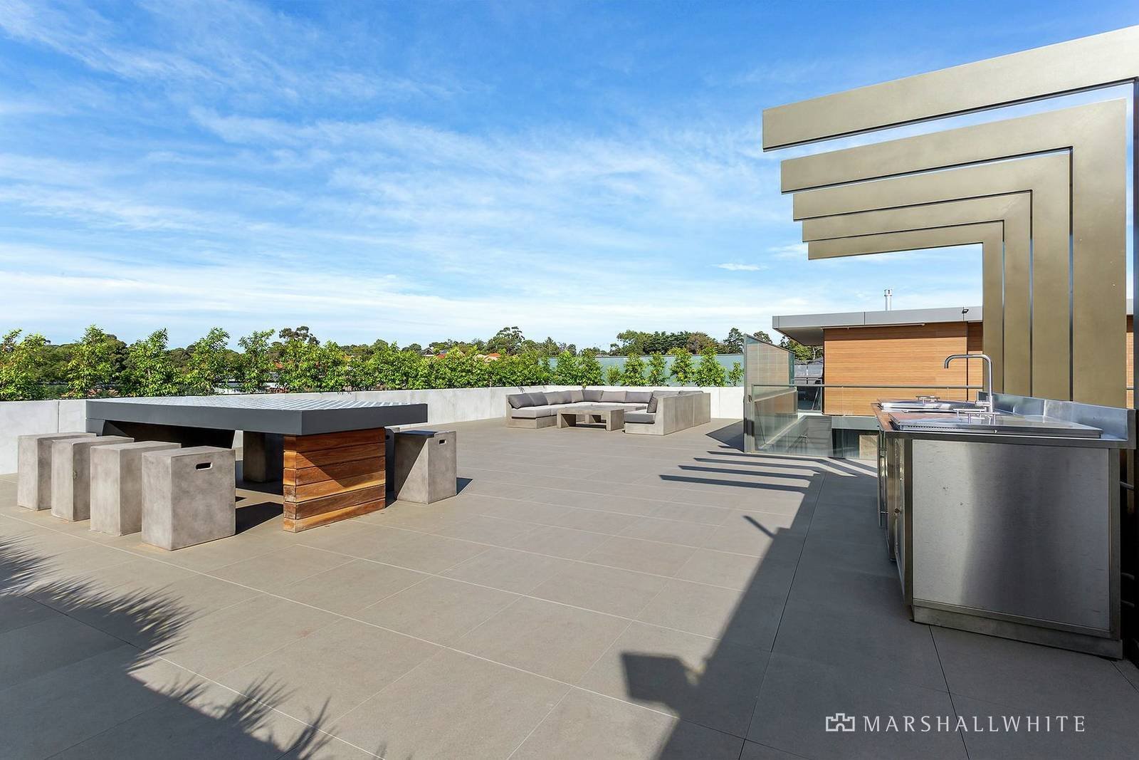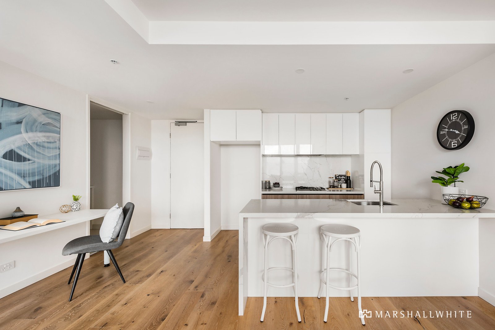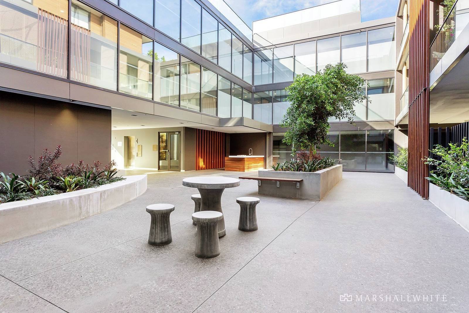 With timber tone flooring, pristine Miele kitchen appliances, white cabinetry and stone-topped working surfaces that present you with a terrific breakfast bar, the kitchen/dining/living space is particularly vogue as it spills outdoors through sheltering double-glazing to a large balcony. Meanwhile, the bedroom features generous mirrored built-in robes, the bathroom includes an oversized shower and there is a laundry as well as a study nook and split system heating and air conditioning. Securely accessed via video and fob entry, this highly anticipated building also features two secure basement parking spaces, rooftop entertaining, a gymnasium, separate bike storage and a lock-up storeroom.