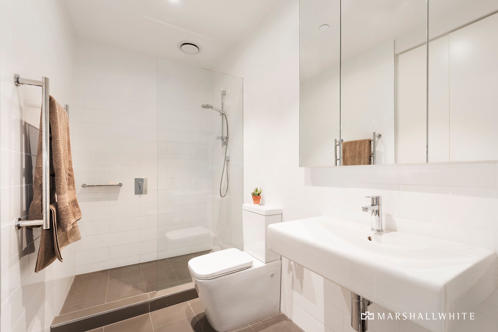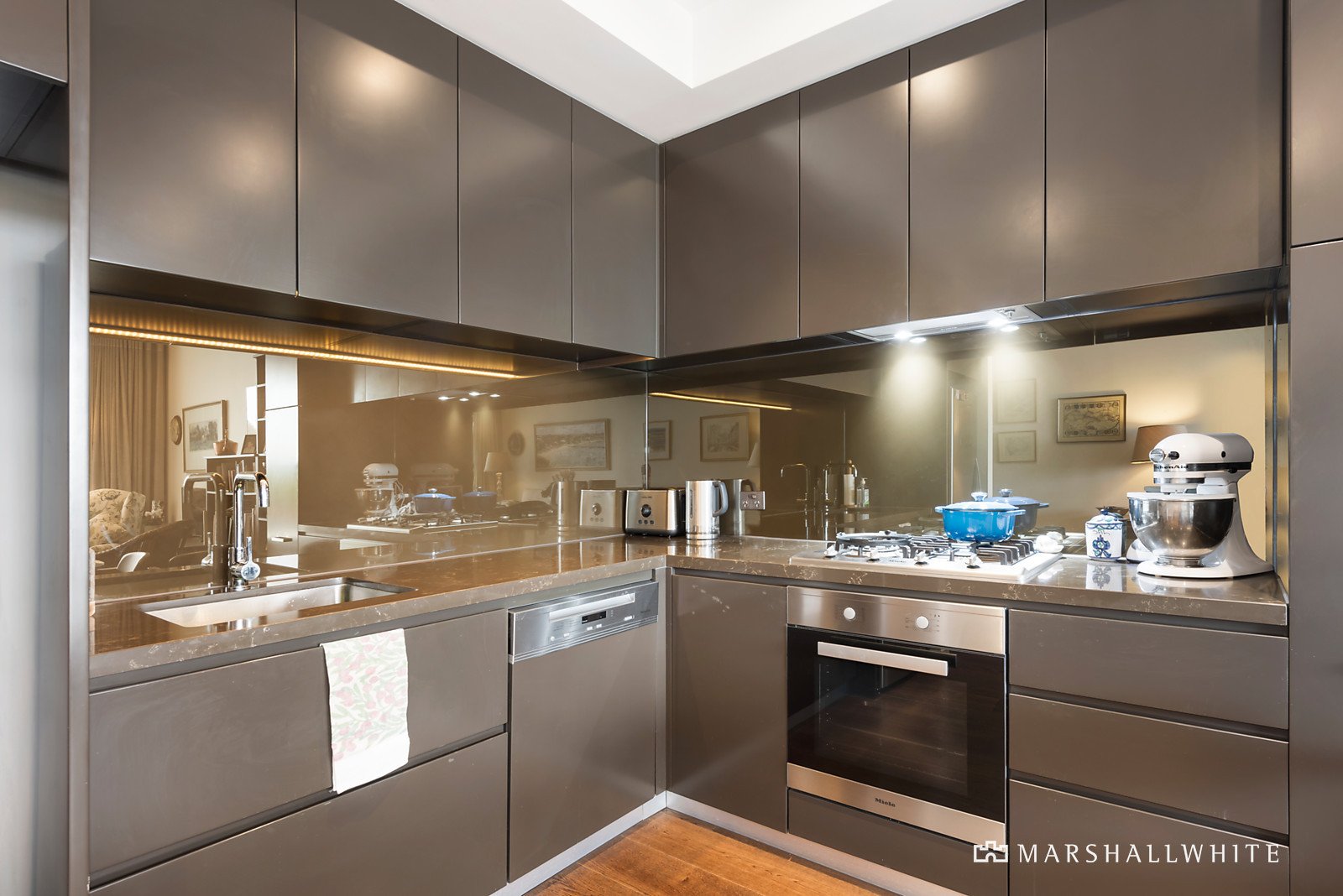 A well-proportioned Miele-equipped kitchen / dining and living area with stone working surfaces and timber tone flooring is evocatively styled with modern, dark tones, as it flows seamlessly to a sun-drawing balcony that manages to balance sensational views with a remarkable sense of privacy. Double-glazing and double block-out blinds combine to evoke the feel of sanctuary, while the bedroom is equipped with built-in robes and the laundry is cleverly concealed in a stylishly-appointed bathroom. Securely accessed via video entry, with basement parking and an elevator, the home also offers access to a communal rooftop terrace and is a first-class candidate as a lock-and-leave city base.