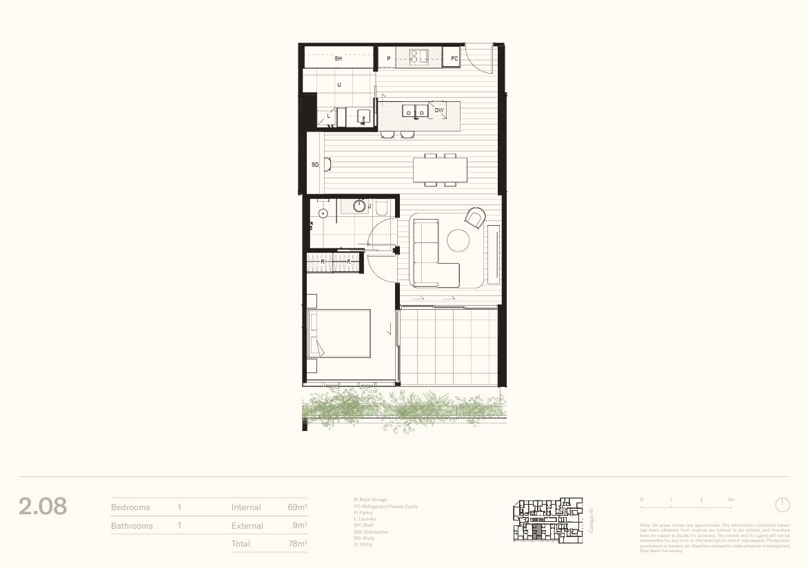 Inside, you’ll find a bright open-plan living space, a well-appointed bathroom, and a cleverly designed butler’s pantry housing the laundry. A secure car space is included, providing ease and security in this sought-after location.