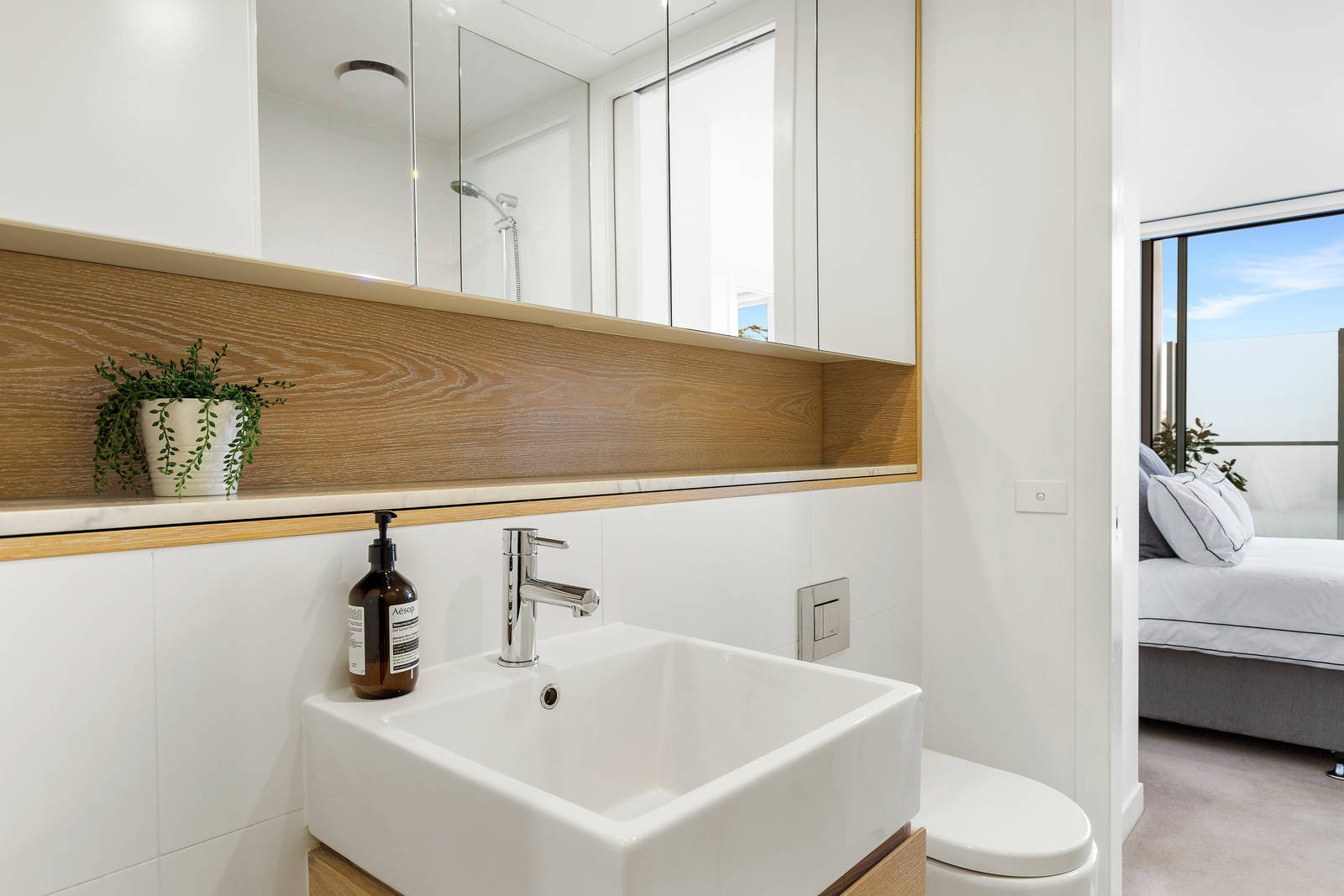 An open-plan design with attractive Oak-toned flooring reveals a Miele-appointed kitchen with stone benchtops and an integrated refrigerator, as well as a clever study nook and a relaxed flow to a private balcony that promises summer entertaining. Impressively, the bedroom enjoys direct access to a second balcony, as well as walk-in robes and semi-ensuite access to a vogue bathroom. Added highlights include secure video entry, basement parking, a storage cage, CCTV surveillance and a European laundry.
