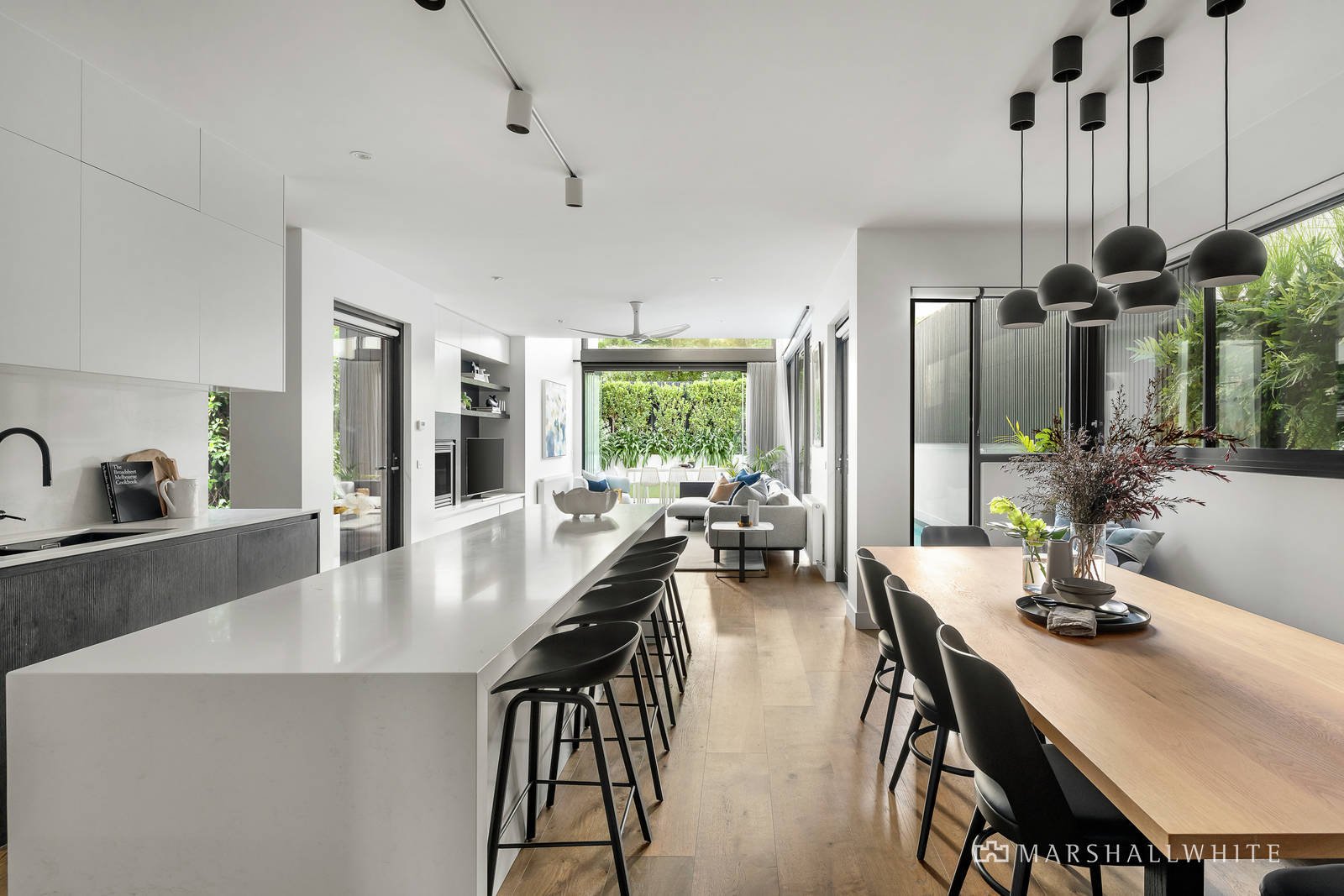 A striking street presence is matched inside by a soaring double height foyer featuring a designer light and dark oak floors. The oak floors continue through to the sleek gourmet kitchen appointed with stone benches, 2 Siemens ovens, integrated Liebherr fridge/freezer and a butler's pantry and the gorgeous dining area with a long built-in bench seat. Bathed in northwestern light, the expansive living area with a gas log fire and designer ceiling fan opens through bi-fold doors to the completely private leafy northwest garden with entertaining terrace and solar-heated lap pool. The gorgeous main bedroom with walk in robe and designer en suite opens to its own private courtyard while a sensational children's zone upstairs comprises four additional bedrooms with built in robes and desks, a retreat and two stylish bathrooms.