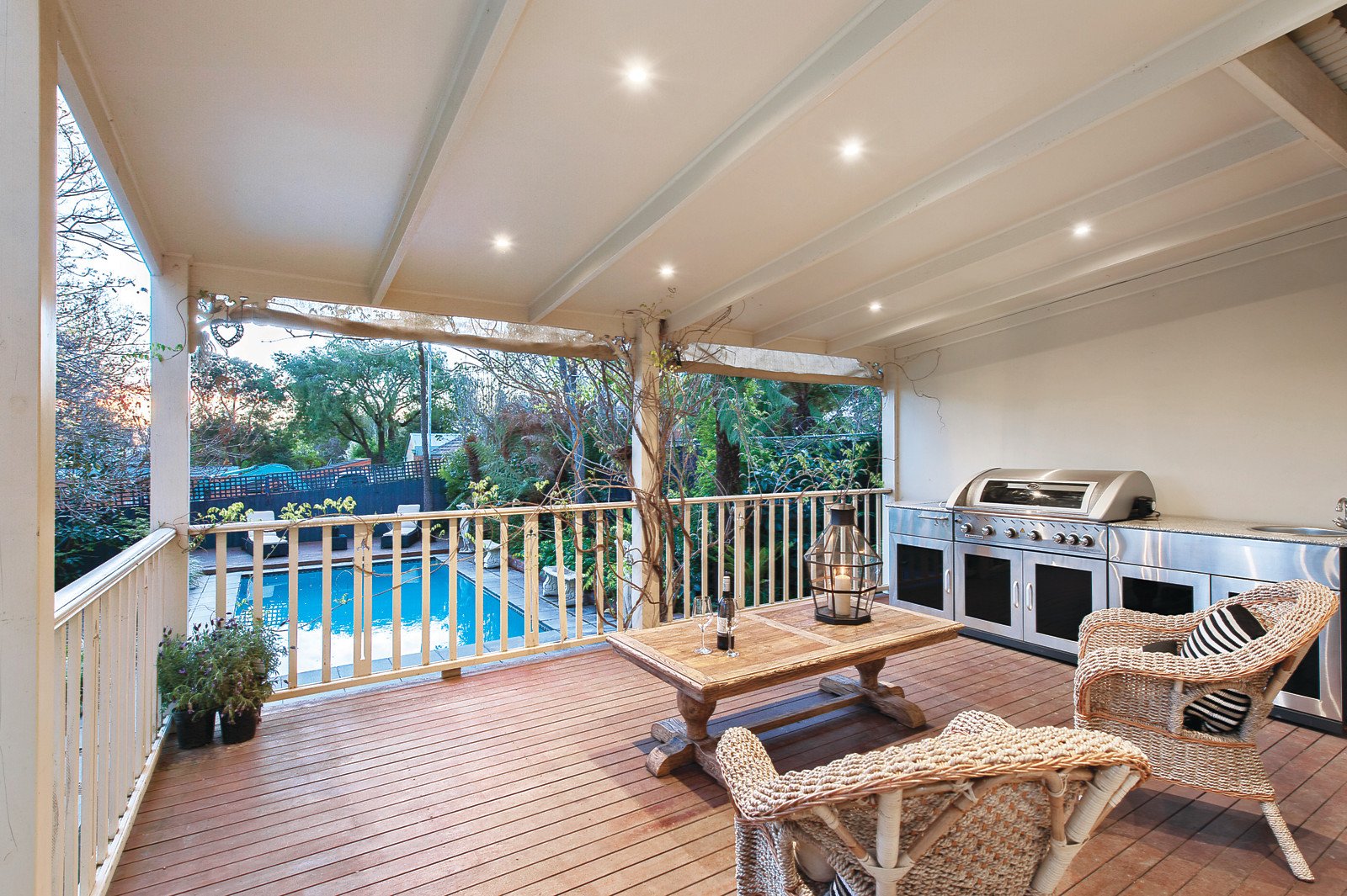 Set on 736sqm (approx.) with deep private northwest garden and pool surrounds, the sun-drenched ambience of the interior spaces are accentuated by pale timber floors through the wide hall, glorious living room with open fireplace, formal dining room and retreat or TV room. The sleek gourmet kitchen featuring stone benches and adjacent family dining area lead out to a fabulous covered al fresco dining deck overlooking the deep private northwest garden with solar heated pool and sun-deck. Conveniently situated on the ground level, the main bedroom is appointed with built in robe and chic en-suite while the three additional bedrooms and stylish bathroom are upstairs.