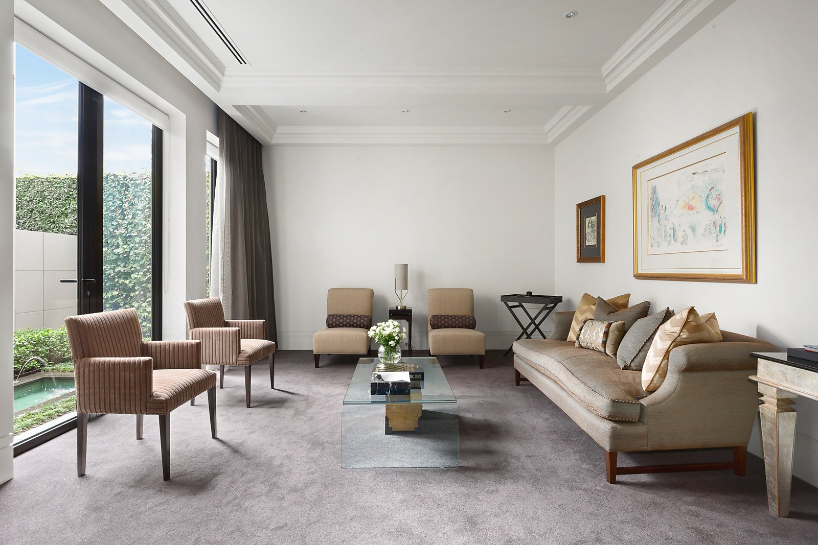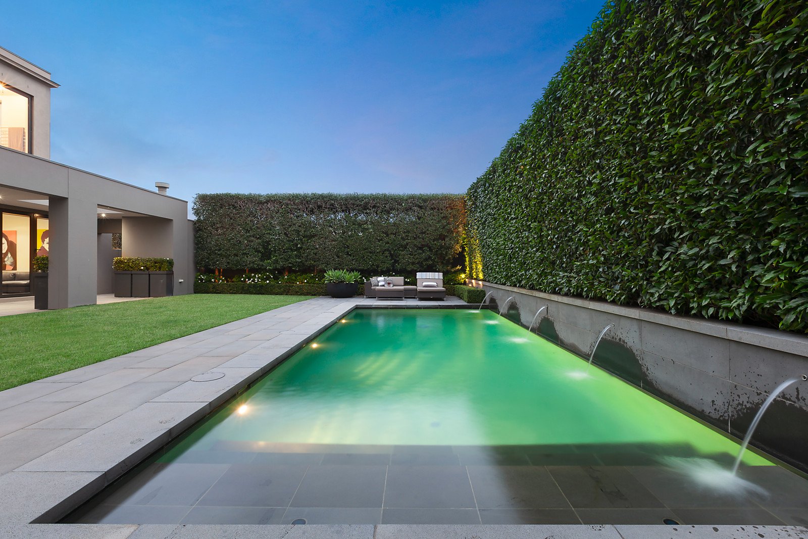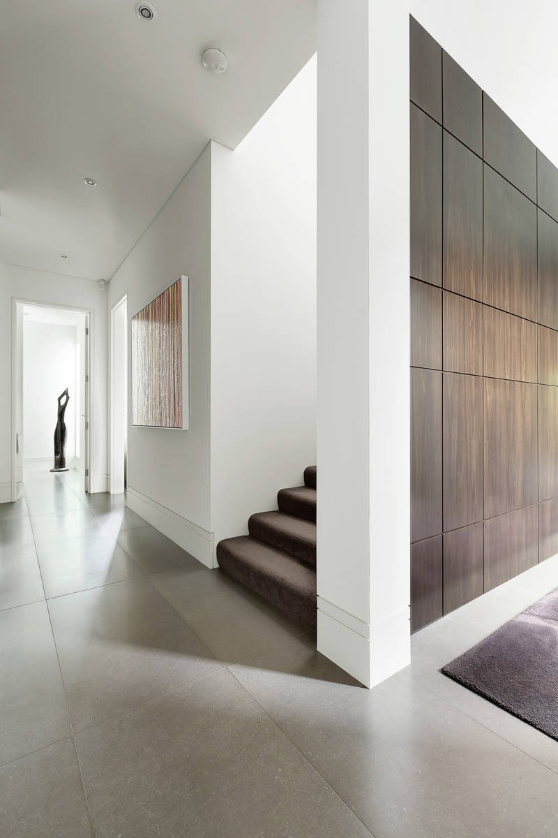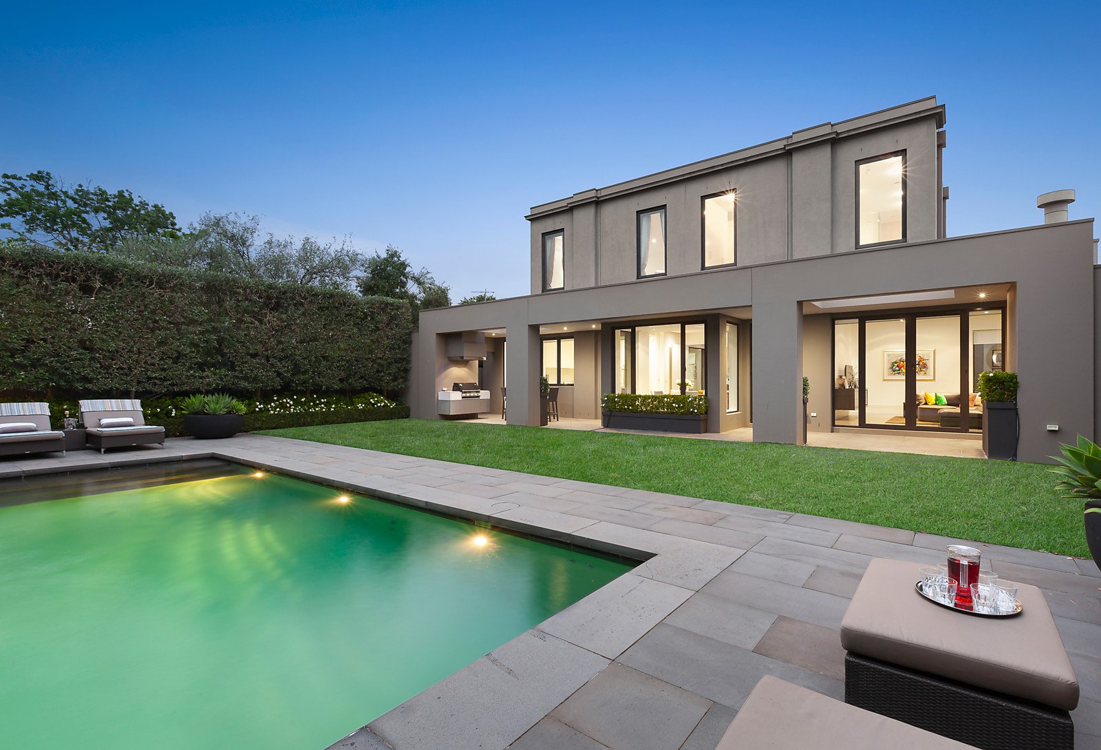 Timeless, elegant, solid and minimalist. These aesthetics, coupled with uncompromised quality, palatial proportions and scrupulous attention to detail led the brief given to Grodski Architects for BELLAZZO. The result is a stunning 4-bedroom contemporary residence where every square centimetre has been meticulously engineered and luxuriously appointed. Set behind high walls with mirror-image auto-gated driveways, the detail equally applied to indoor and outdoor spaces is clear. A bluestone paved walkway through manicured Tuscan gardens designed by Jack Merlo seamlessly transform at the pivoting oversized front door to the entrance hall. Italian slab porcelain flooring flows while towering double-glazed & laminated windows are oriented to views of outdoor spaces, artfully furnished with sculptures and water-features. Inspiration has been gathered from the owners' travels all over the world. Elements inspired by designer hotel suites and contemporary art galleries are evident. On the ground level are several formal and informal living and dining spaces, a custom-built home office, powder room, and the commercial-grade Stone Italiana kitchen with butler's pantry, retractable partition and Gaggenau/Miele appliances. Clever touches include Dutch tulip-wood feature walls with hidden panels opening to generous storage spaces. The grand, oversized staircase is lit with imported Boyd wall sconces and swathes of wall-space is designed for large format artworks. Upstairs are the bedroom suites, all fitted with plush felted carpets. The Master suite incorporates a sizeable ensuite and walk-through dressing room fitted with bespoke leather cabinetry. Sumptuous Italian silk curtains add a glamorous touch. Two further bedroom suites have studies with expansive built in furniture and ensuites with Bisazza glass mosaic feature walls, and another king-size room with BIRs is currently set up as a gym. The Tuscan theme continues in the back garden with high hedges of Portuguese laurel and olive cocooning the super-private space. The lap-length swimming pool (gas/solar heating) has bluestone surrounds and trickles melodically via a row of fountains. There is an alfresco dining space with built-in mains gas BBQ, cabana bathroom and a lush flat lawn, ideal for bocce. Close to Brighton Beach, Church Street, New Street and some of Melbourne's best schools, this impressive residence also includes keyless entry, security system, commercial zoned heating and cooling, double glazed and laminated windows, laundry, DLUG/off-street parking for six vehicles, fully automated irrigation and rainwater tanks. Land size: 910 sqm (approx.).