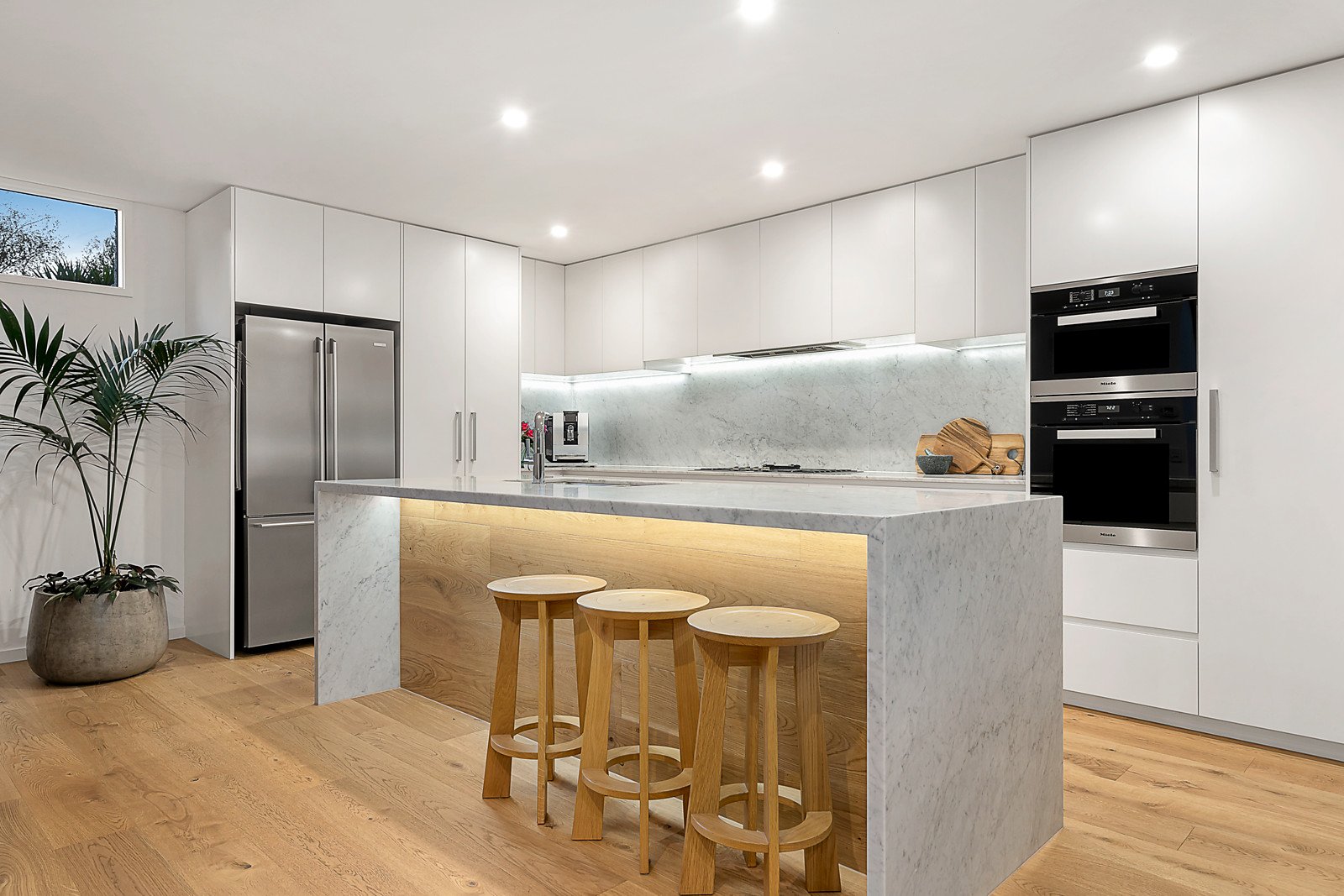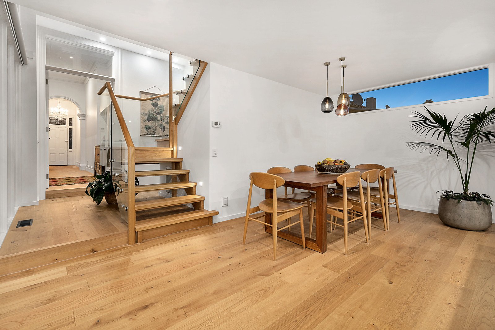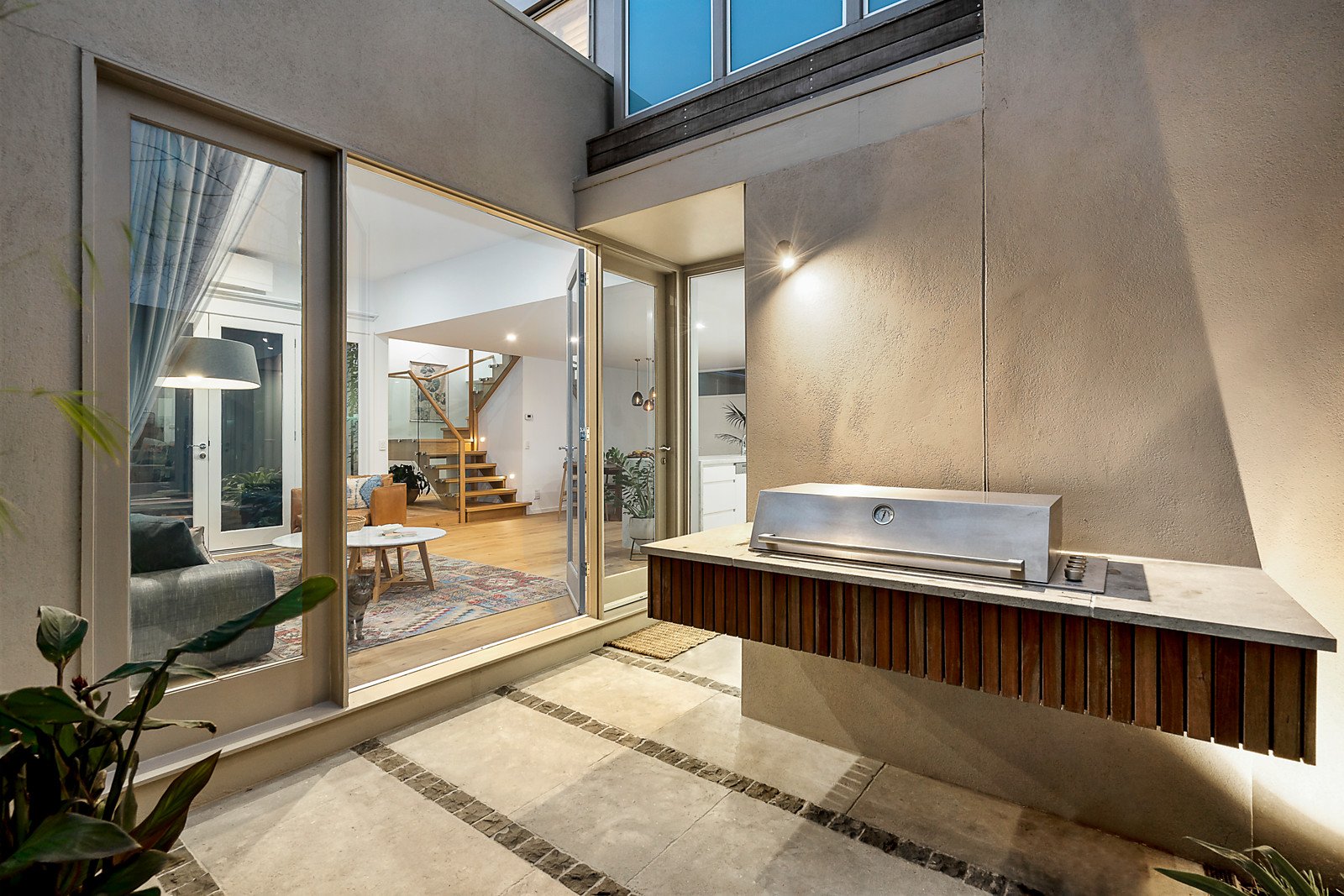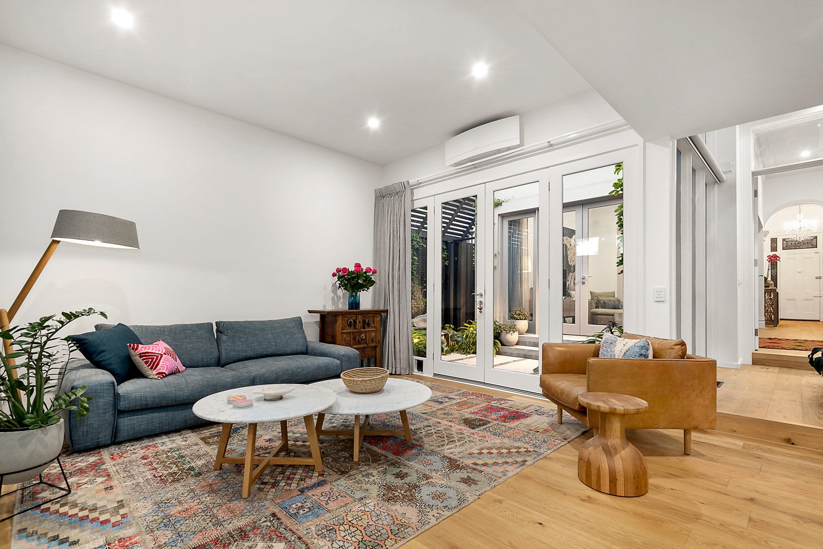 Behind a stunning lush landscaped garden, the arched central hall featuring wide Oak floors introduces a generous and light-filled sitting room with marble mantelpiece. Opening to both a serene central courtyard and a private landscaped northern BBQ terrace, the expansive open plan living and dining room is served by a sleek gourmet kitchen appointed with Carrara marble benches and splash-back and Miele appliances. The beautiful main bedroom with open fire, bespoke walk in robe and lavish marble en-suite with a stone bath is downstairs along with a second double bedroom with open fire, built in robe and a stylish bathroom. Upstairs there is a third spacious bedroom with walk in robe, designer en-suite and sunny north-facing rooftop deck.