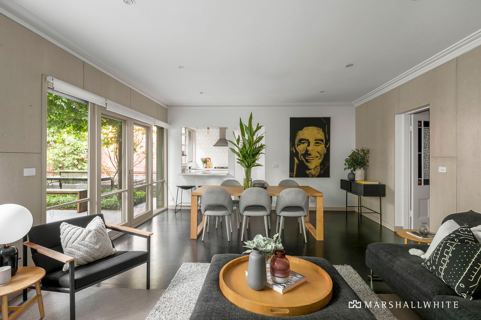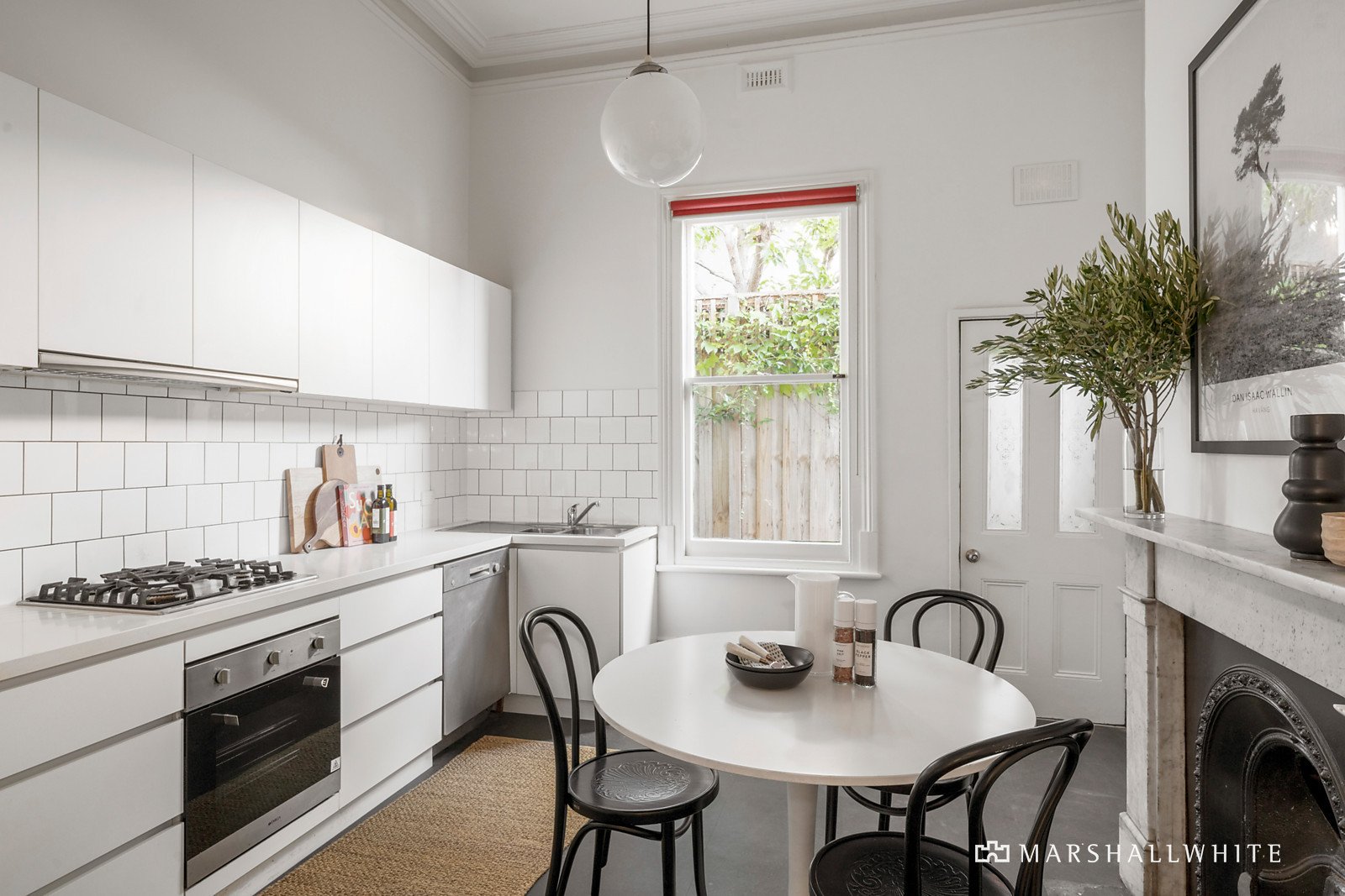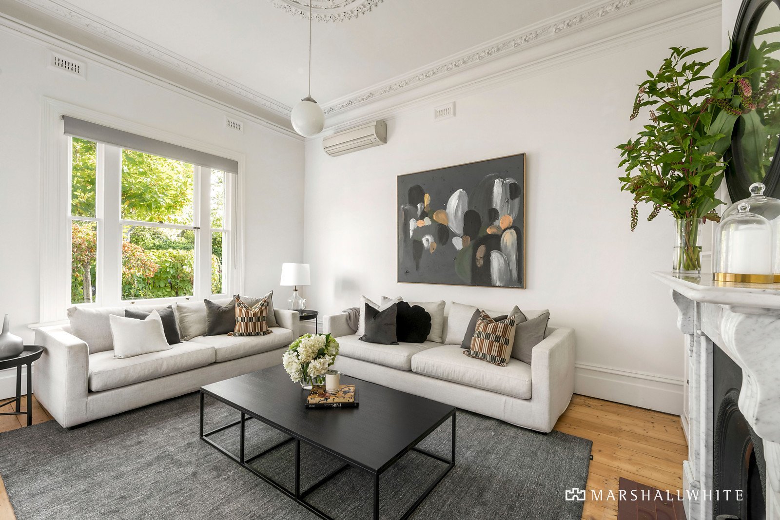 Set discreetly well back from the street behind lush greenery, the grand corbel-arched entrance hall anchors an elegant sitting room, a generous home office/formal dining room, four graciously proportioned bedrooms and a gym/nursery. High ceilings continue through an impressively spacious and designer open plan living and dining room at the rear with a fireplace and signature aesthetic from award-winning ANNA.CARIN Design Studio, accompanied by a stone-bench kitchen and glorious garden outlooks.