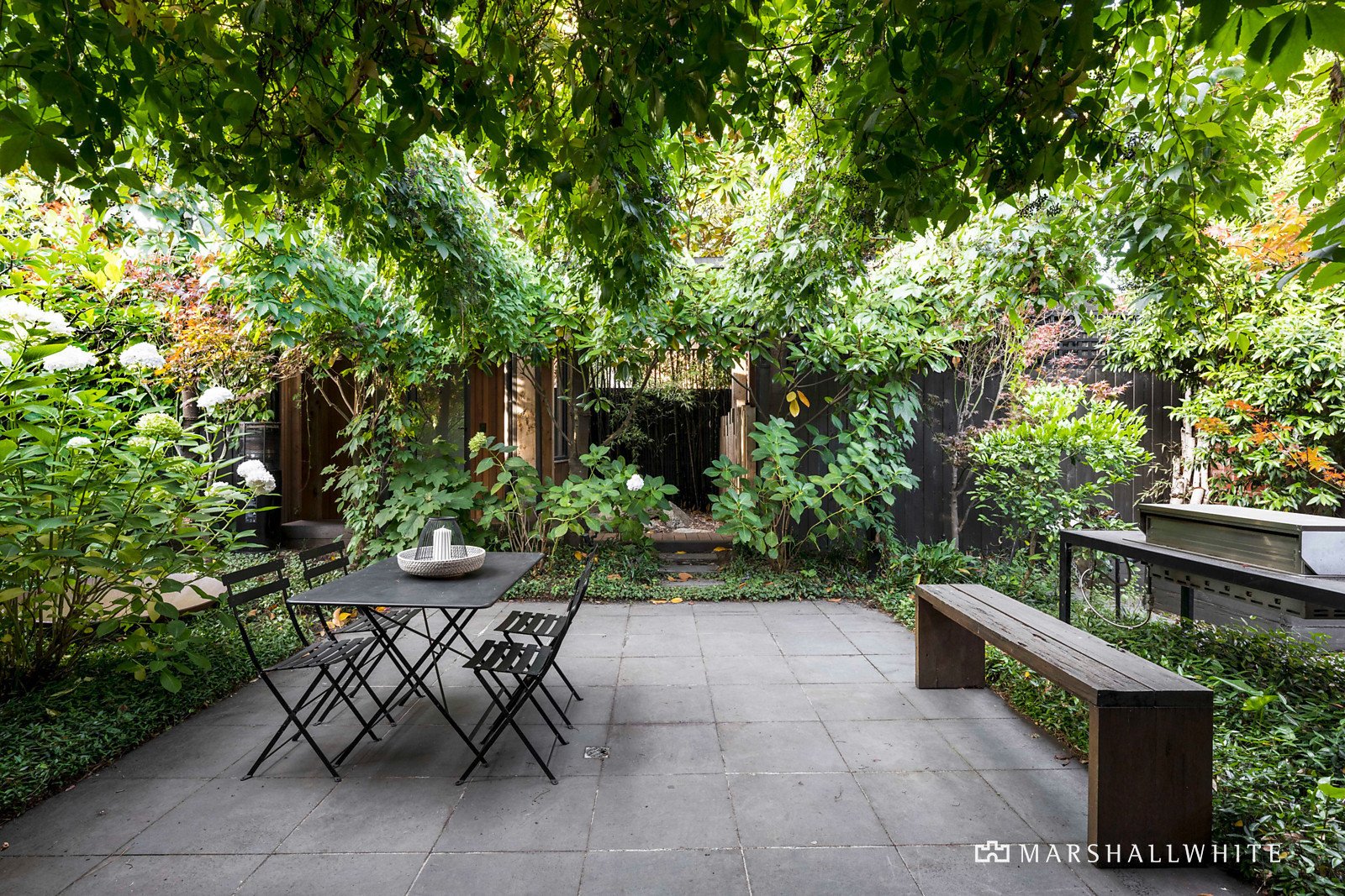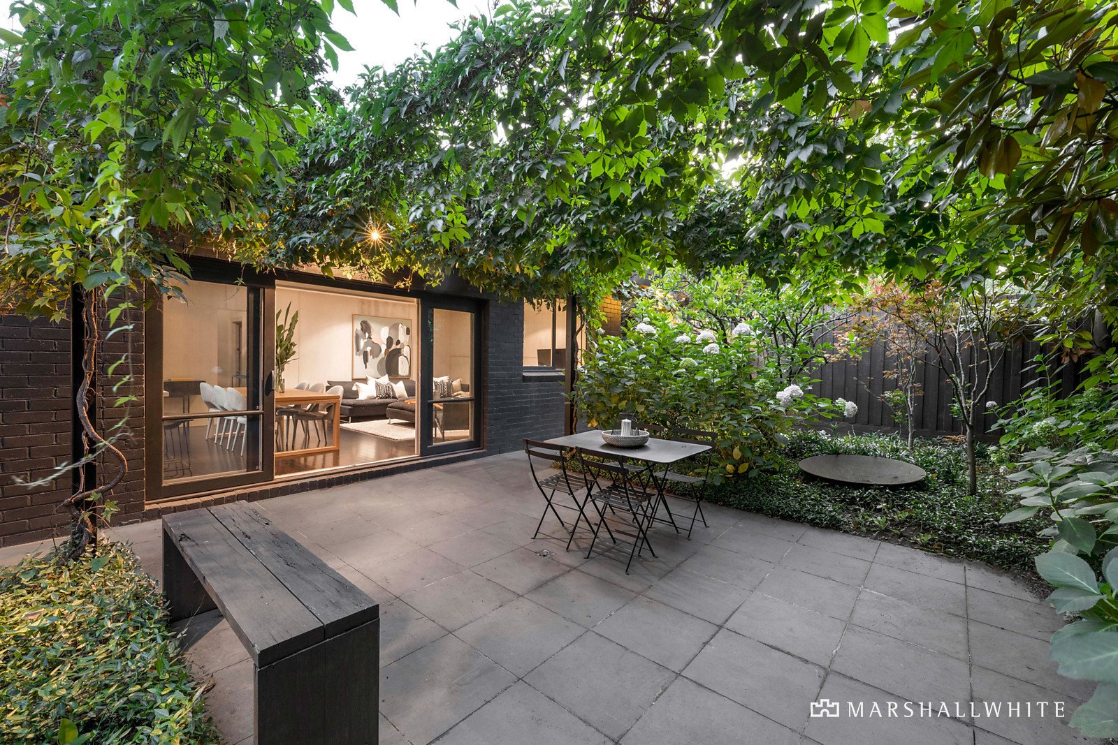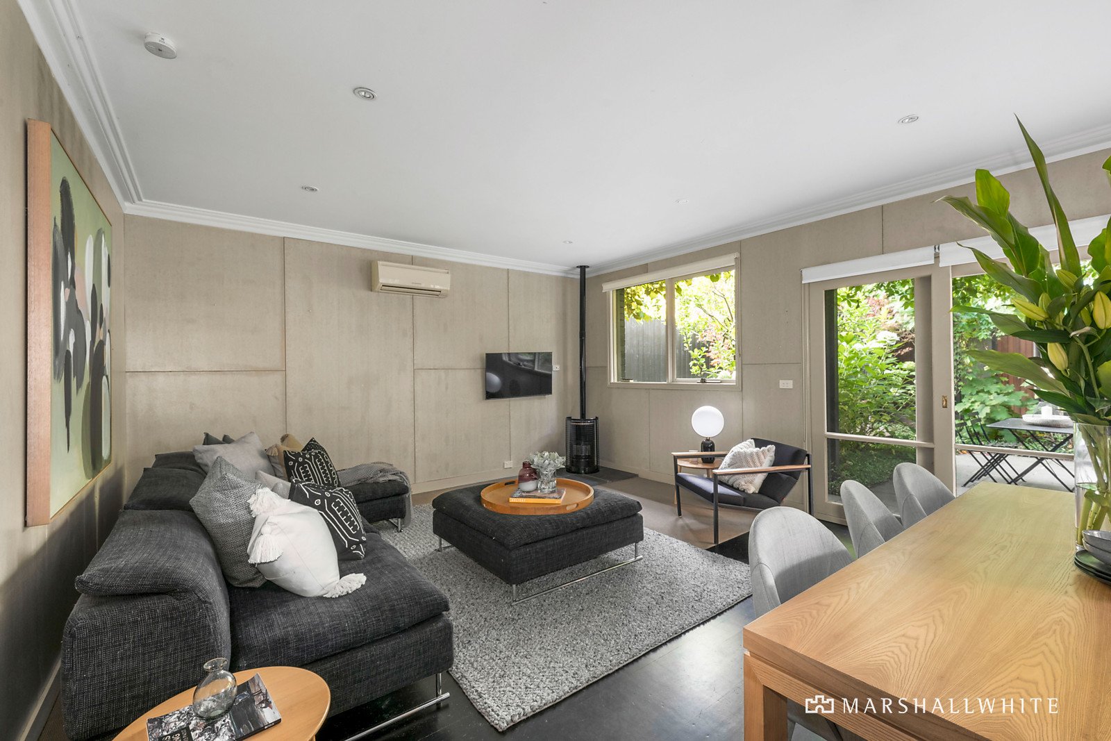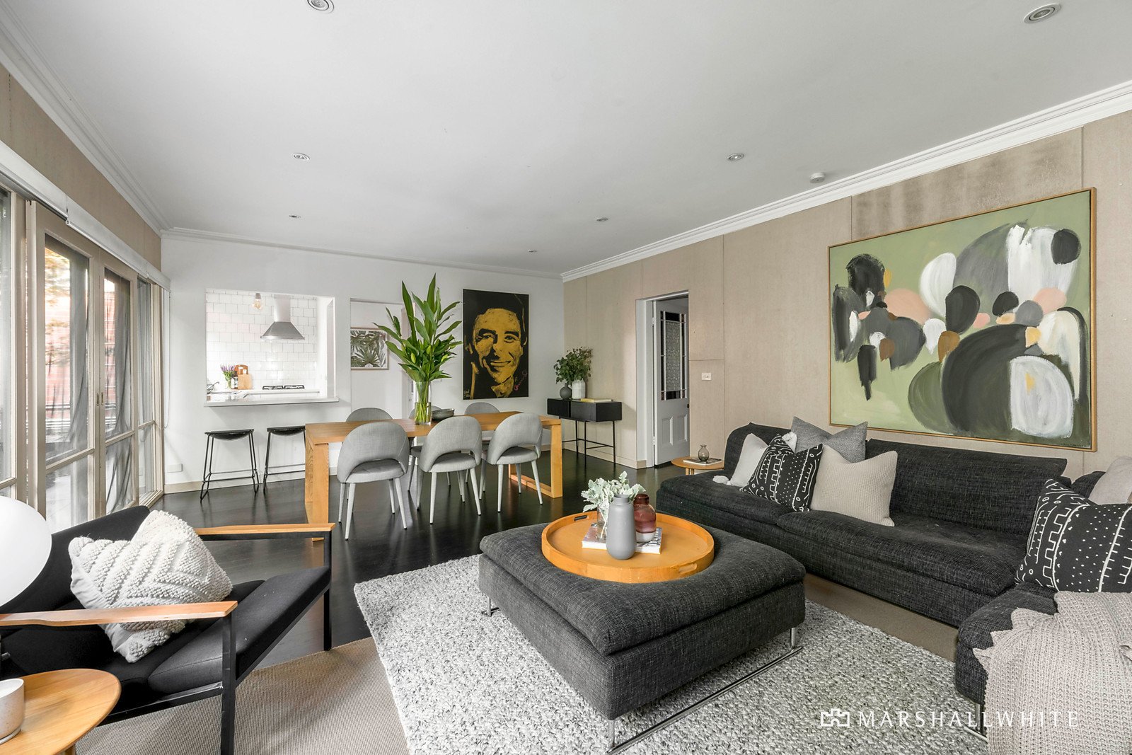 Set discreetly well back from the street behind lush greenery, the grand corbel-arched entrance hall anchors an elegant sitting room, a generous home office/formal dining room, four graciously proportioned bedrooms and a gym/nursery. High ceilings continue through an impressively spacious and designer open plan living and dining room at the rear with a fireplace and signature aesthetic from award-winning ANNA.CARIN Design Studio, accompanied by a stone-bench kitchen and glorious garden outlooks.