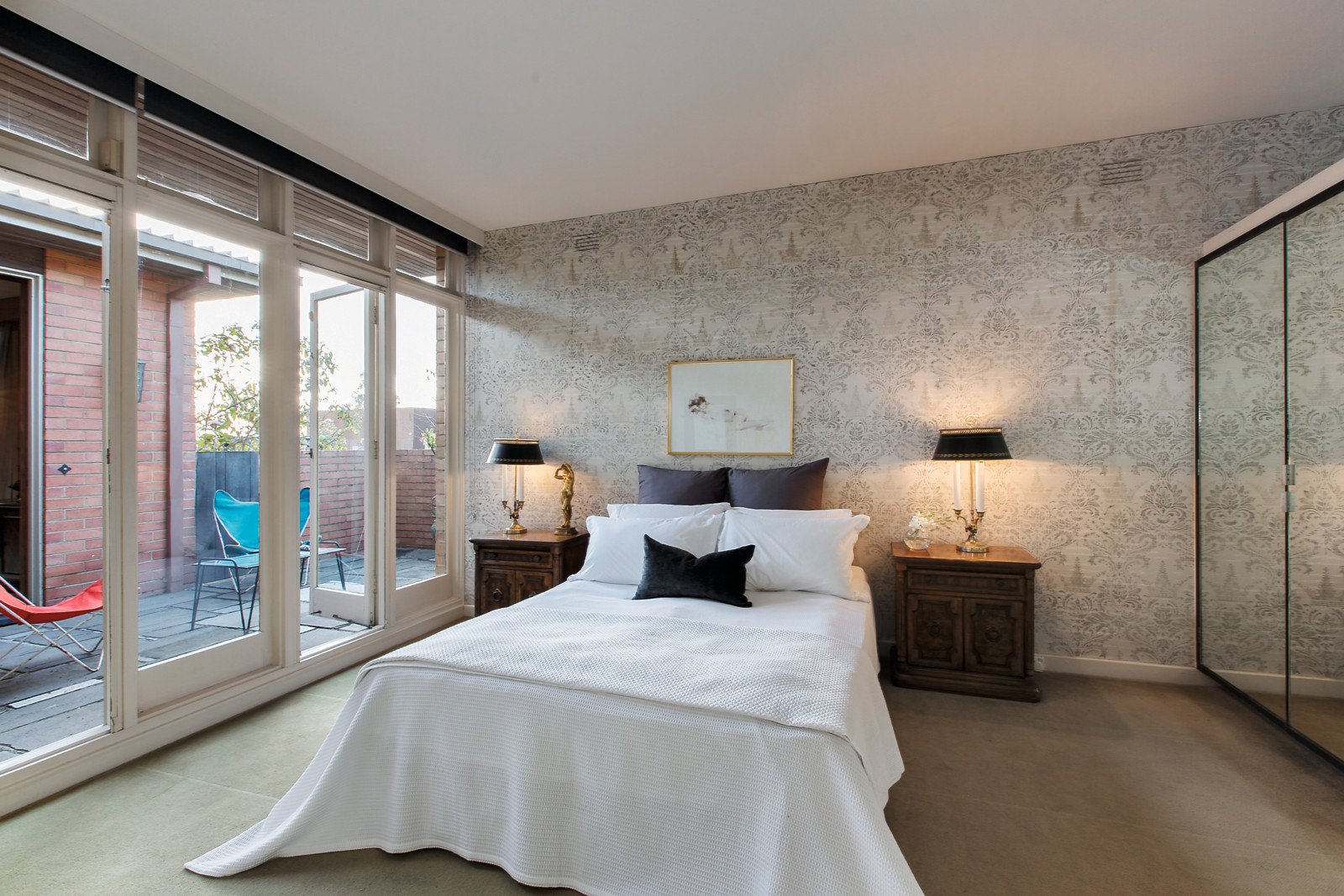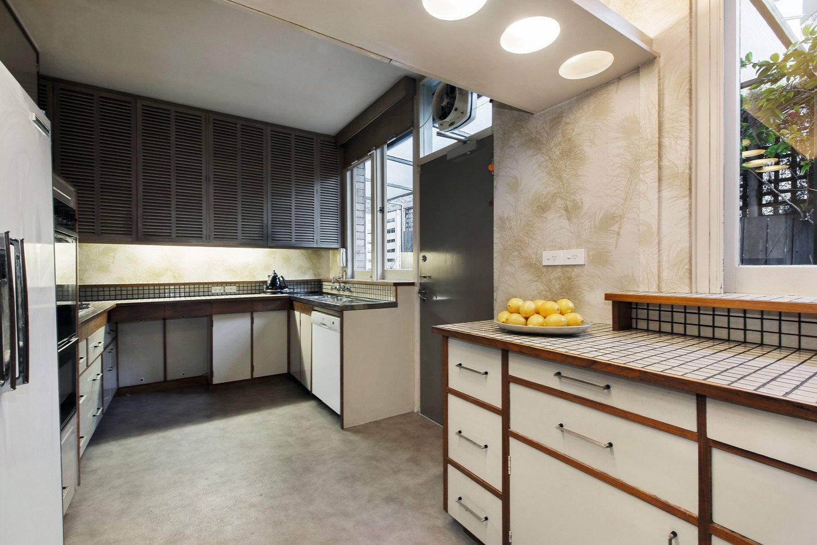 As his first residential project, signature Robin Boyd design elements began with this house. Ahead of its time and still entirely relevant, the design embraces wonderful northwest sunlight throughout. An oversized solid timber door reveals a timber paneled entrance hall leading to a superbly proportioned living room, inviting dining room and a large well appointed kitchen. Also on the ground level, the fabulous main bedroom featuring a dressing room, built in robes and pristine en-suite opens to a private courtyard. Sleek original suspended timber stairs lead up to two additional double bedrooms with built in robes, a bathroom and sensational second living room or retreat offering spectacular city views.
