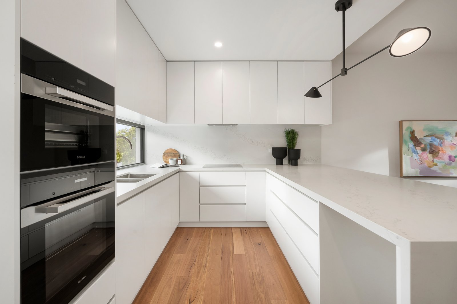 Creating a wonderful sense of occasion, the double height entrance foyer with a dramatic modern chandelier flows through to an exceptionally generous living room featuring timber floors and bi-fold doors opening to a private undercover al fresco dining deck with heaters. Separated by a timber screen, the inviting dining area served by a sleek gourmet kitchen appointed with stone benches, top Miele appliances including a steam oven and butler’s pantry opens to the northeast garden. A convenient downstairs main bedroom with designer en suite, bath and walk in robe offers flexibility as guest accommodation. Sky-lit blackbutt timber stairs lead up to an alternative main bedroom with stunning en suite and walk in robe, two additional robed bedrooms, a stylish bathroom and very spacious retreat opening to a large north-facing private terrace, the perfect location for an afternoon cocktail while watching the sunset.