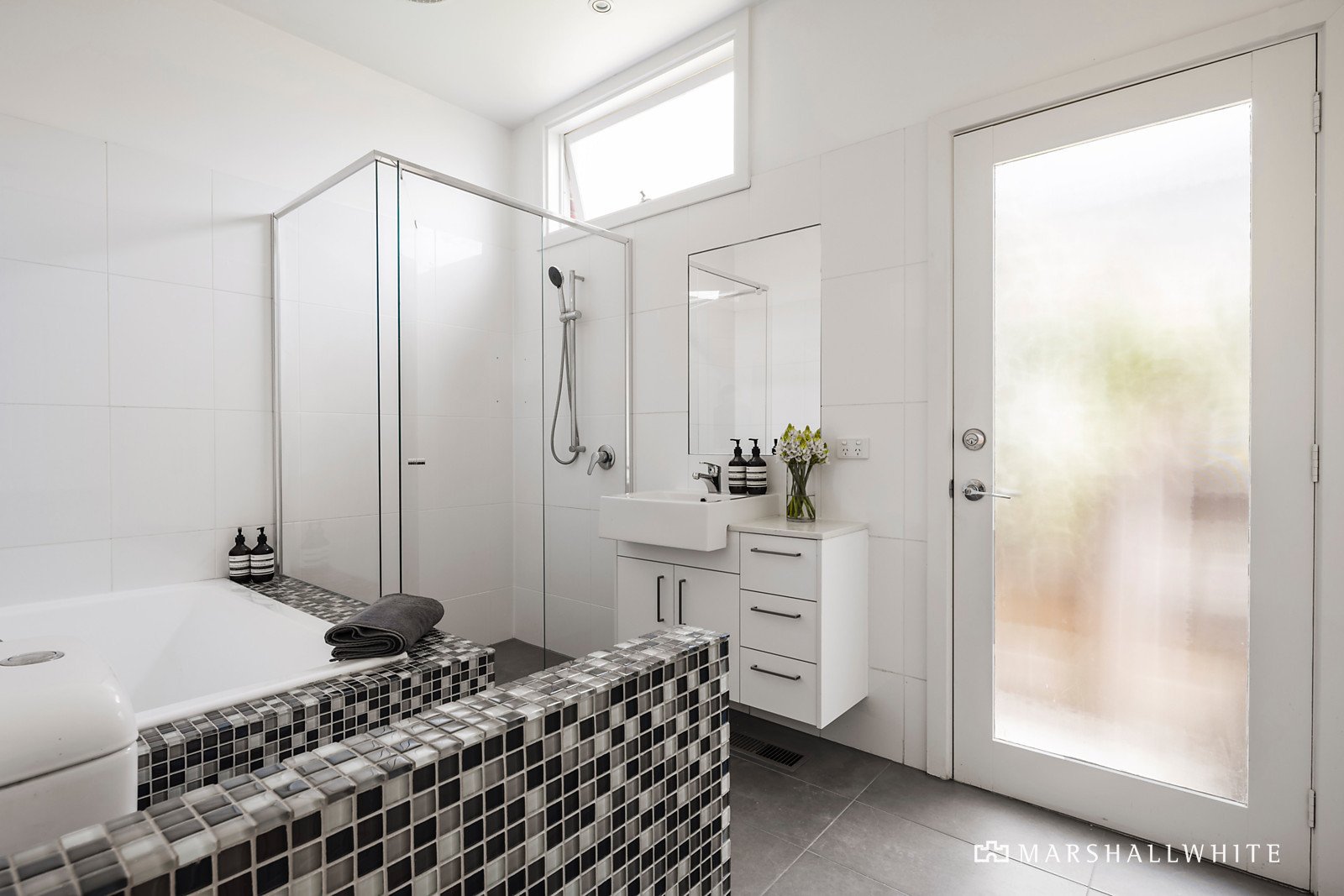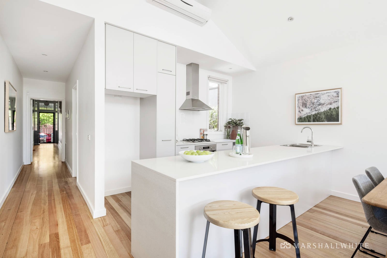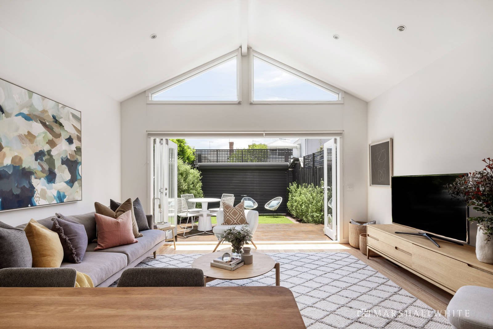 A traditional arched hallway featuring soaring ceilings and timber floors introduces two gorgeous double bedrooms with fireplaces, built in robes, ceiling fans and plantation shutters and a stylish bathroom. Vaulted ceilings and a northern orientation accentuate the sense of space and natural light in the expansive open plan living and dining room with a gourmet stone kitchen appointed with European appliances. Bi-fold doors open completely to seamlessly connect the living space to the private north-facing easy-care garden with an entertaining deck and secure off street parking via the rear right of way.