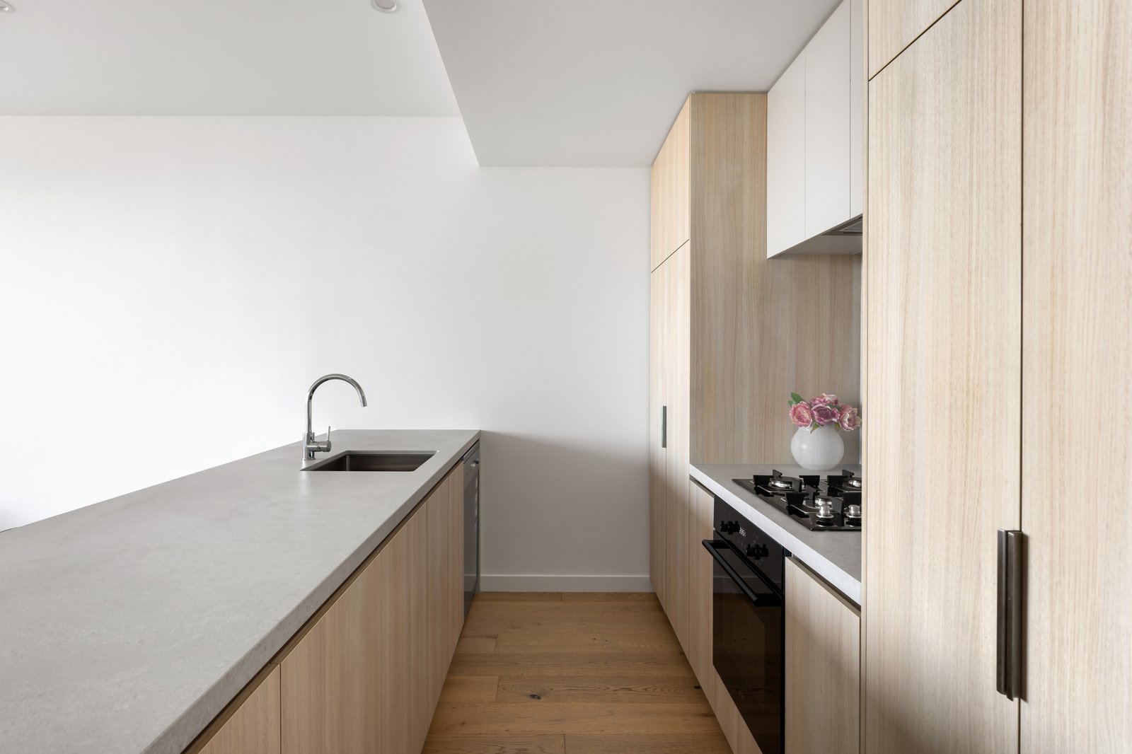 The generous kitchen, dining, and living areas are adorned with Oak flooring and feature exquisite stone kitchen benches, an Ilve oven and cooktop, an undermount sink, and volumes of premium soft-close cabinetry. The space seamlessly flows through double-glazed sliding doors to a covered balcony, perfect for outdoor entertaining.