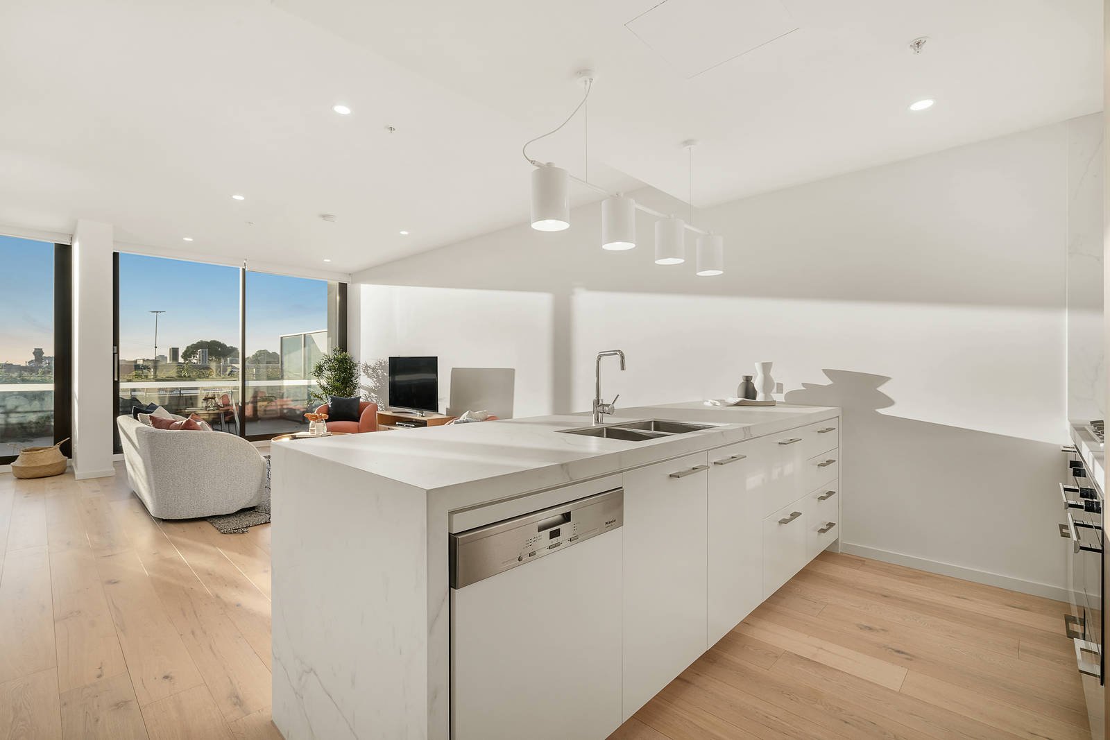 Superbly designed and impeccably appointed apartment matches quality living with an ultra-convenient address, footsteps from shops, cafes and public transport. The two-bedroom spaciousness is outstanding, enhanced with a full-width terrace for relaxing outdoors and admiring the city skyscraper views and spectacular sunsets. Every room has a refined edge. The lounge and dining zone feature big stacking sliding doors opening onto the terrace, oak flooring and remote-control blinds, each bedroom has its own dedicated Corian bathroom, and lift access from the secure entry foyer is a bonus. Quality is at the heart of the light-filled kitchen, with two Miele ovens, Ilve integrated fridge-freezer, pendant lighting over the island bench and porcelain benchtops and splashback. This has everything you need for easy living, including ducted zoned reverse-cycle air conditioning, a European laundry, and two basement garage carparks and storage cage. The perfect address for car-free living with trams around the corner, Balaclava station is 150 metres away, and one of Melbourne's most vibrant shopping and cafe destinations is metres from your front door.