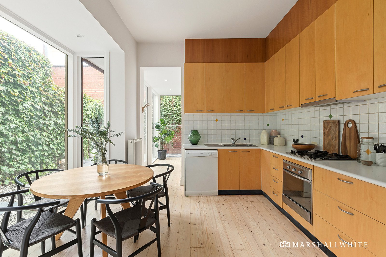 High ceilings, timber fretwork and Baltic pine floors are displayed in the wide entrance hall which leads to a generous living room opening to the garden and a stylish well-appointed kitchen with sunny dining area also opening to the private leafy garden oasis. A light-filled bedroom with double glazing and powder-room on the ground level are complemented by two additional bedrooms, two studies and a pristine bathroom upstairs.