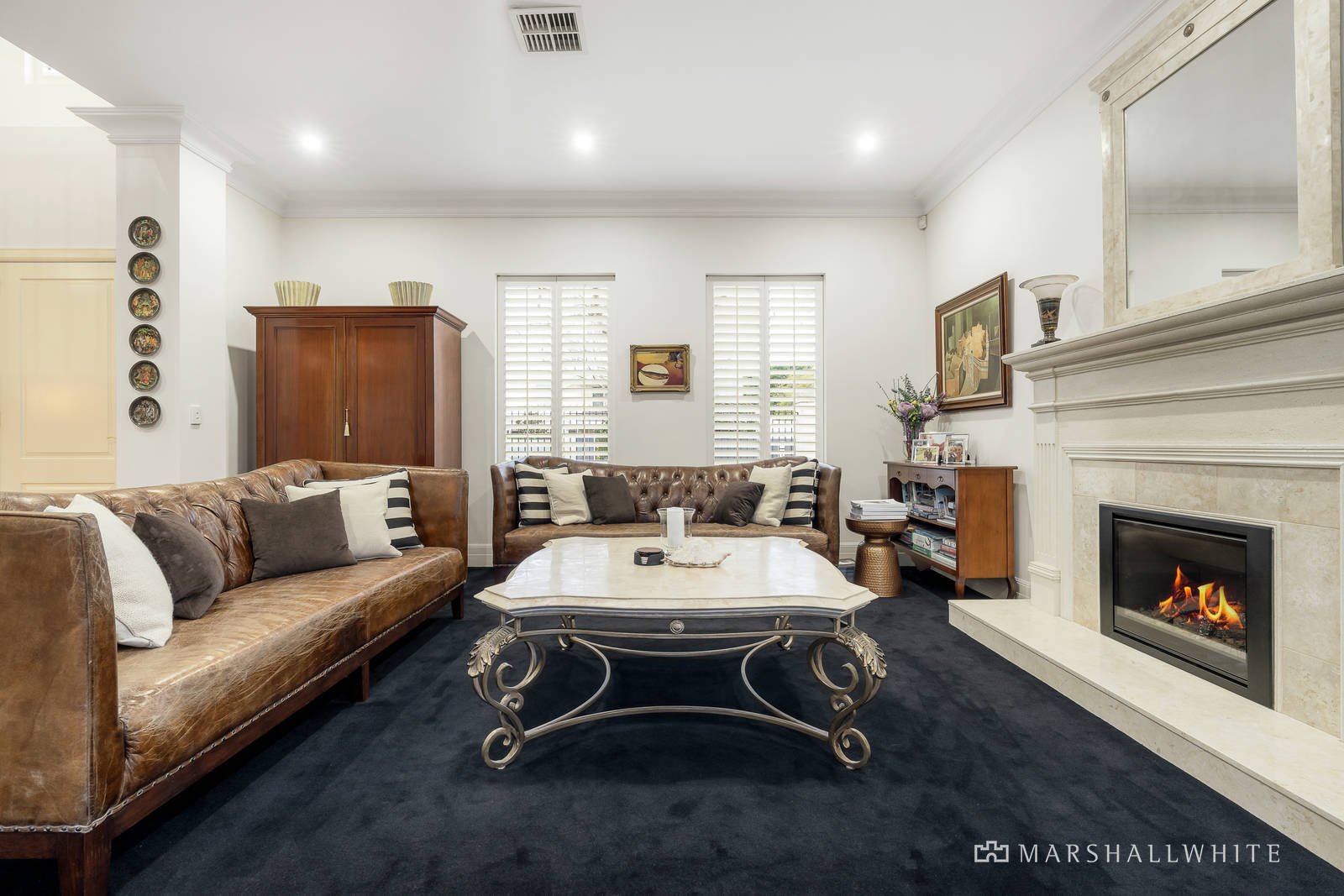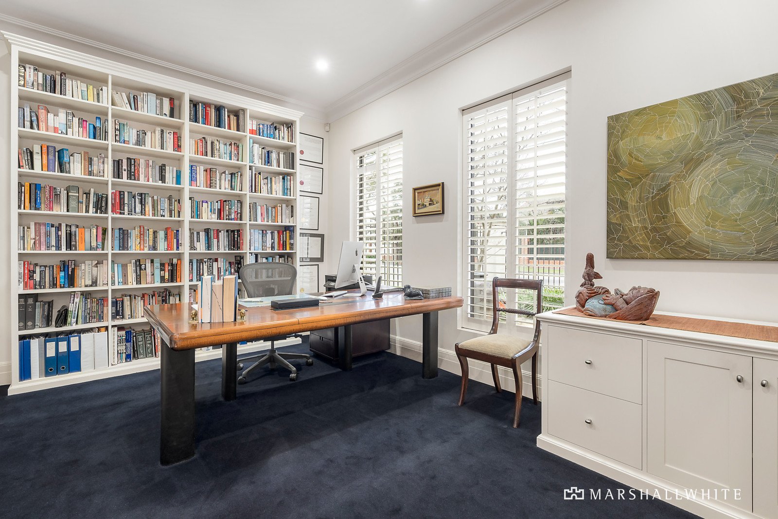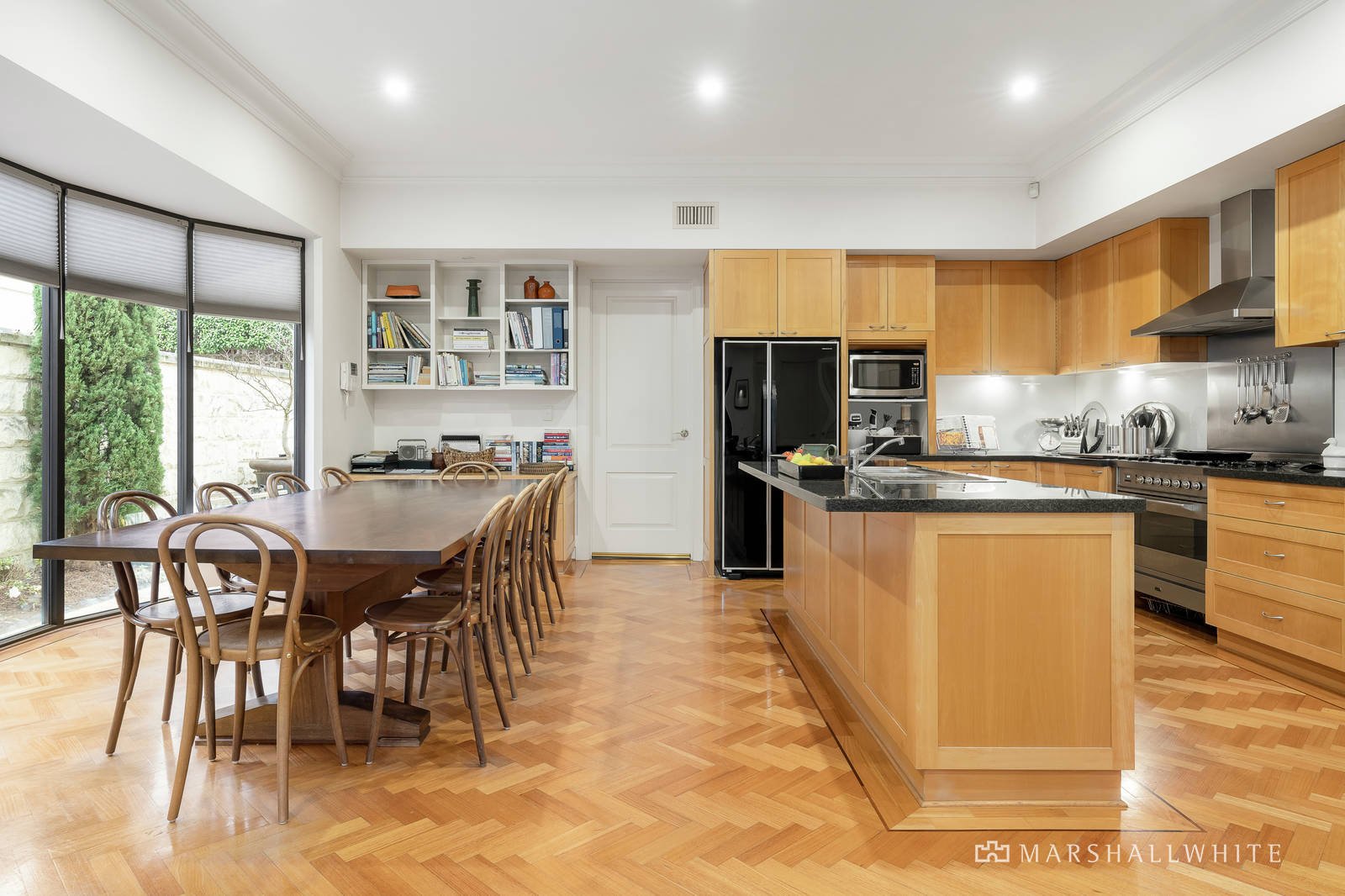 Creating a dramatic first impression, the double height reception hall featuring parquetry floors introduces a beautiful library or executive study and a gracious formal sitting and dining room with a gas log fire. Bathed in northern light, the equally expansive open plan living and dining room served by a gourmet kitchen appointed with stone benches, 90cm Ilve oven and a study nook opens to the gorgeous north-facing private landscaped courtyard. A sweeping curved staircase leads to the generous main bedroom with north-facing balcony, large walk in robe and lavish en suite with spa bath, a second king-sized bedroom with walk in robe and stylish en suite/bathroom and a spacious third bedroom with built in desk.