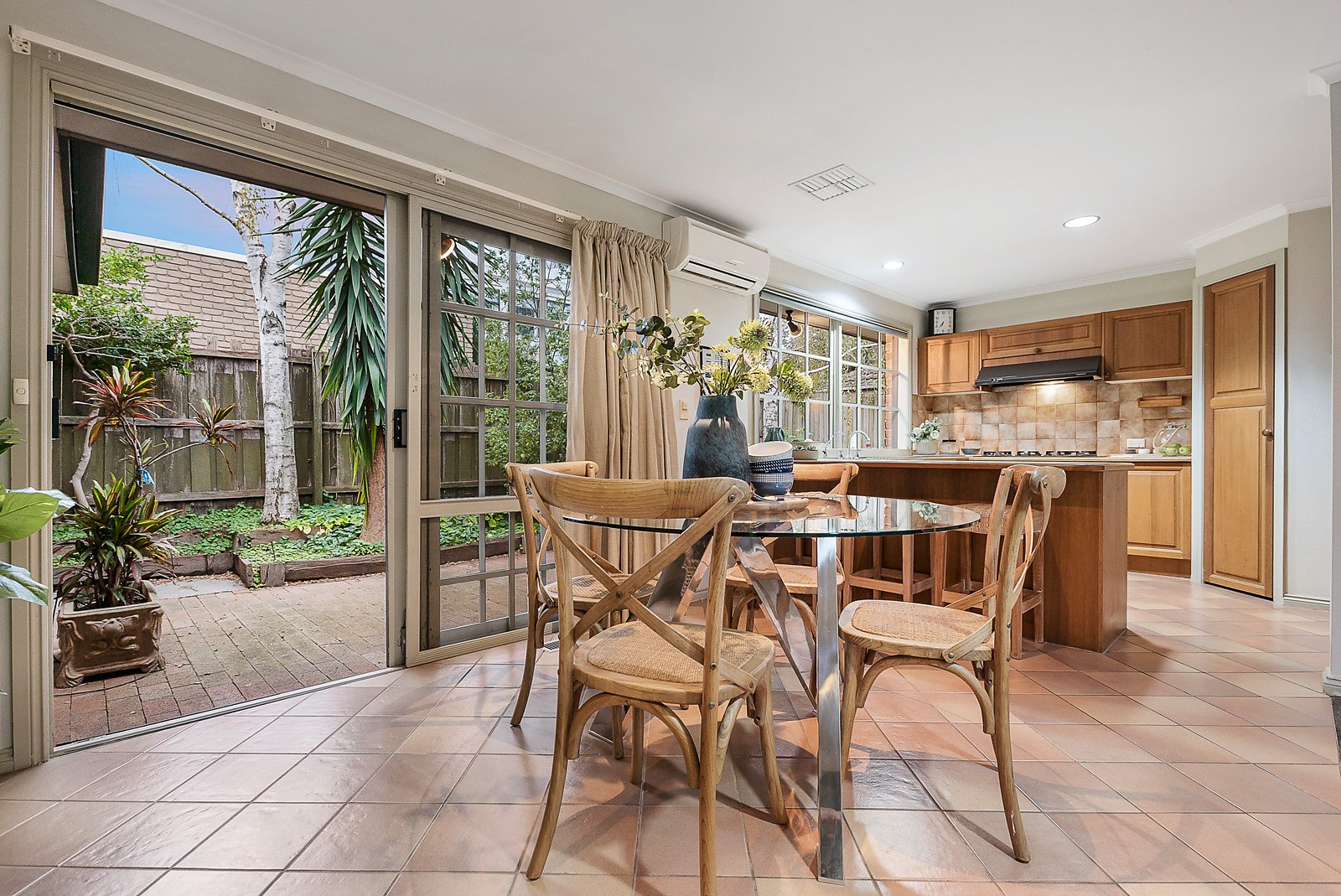 The unexpectedly spacious interior is highlighted by a central courtyard atrium which provides lush garden vistas and additional light to both the formal and informal living and dining areas. Complemented by three zoned bedrooms, main with WIRs and an ensuite, a family bathroom with separate WC and a large laundry. The sunny rear family room incorporates a modern kitchen with warm timber cabinets, WIP and Asko dishwasher flowing to the rear courtyard and wrap-around garden. Other features of this attractive home include intercom, gasLFP, ducted heating, cooling & vacuum, R/C air conditioner (main bedroom & informal living), two air conditioners, wall speakers (family room) and a remote double garage with front turning area.