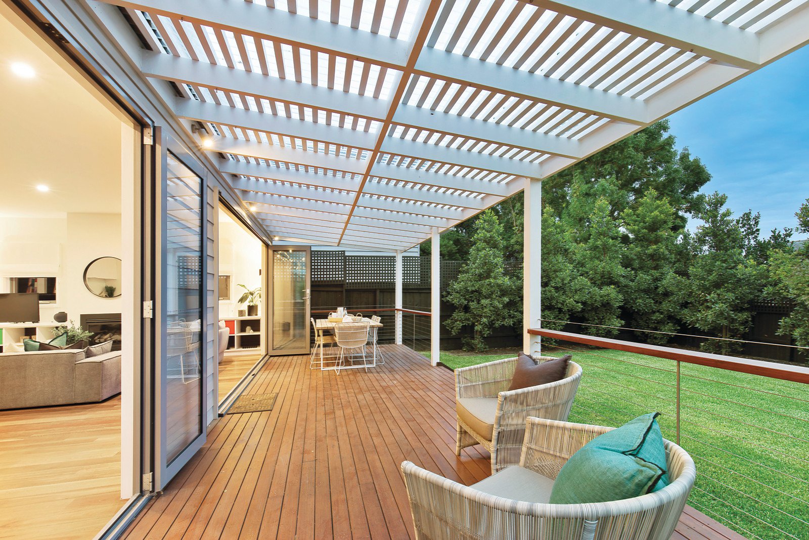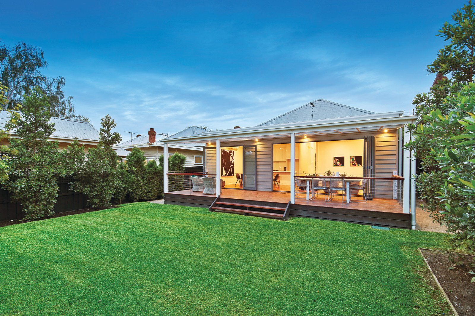 Classic dimensions including high ceilings characterize the central hallway leading to three gorgeous double bedrooms all with built in robes and a stylish en-suite/bathroom. Timber floors flow through the expansive living and dining room with a gas log fire and sleek white stone kitchen boasting Ilve appliances. Bi-fold doors open the living area out to a large covered deck and private northeast landscaped garden.