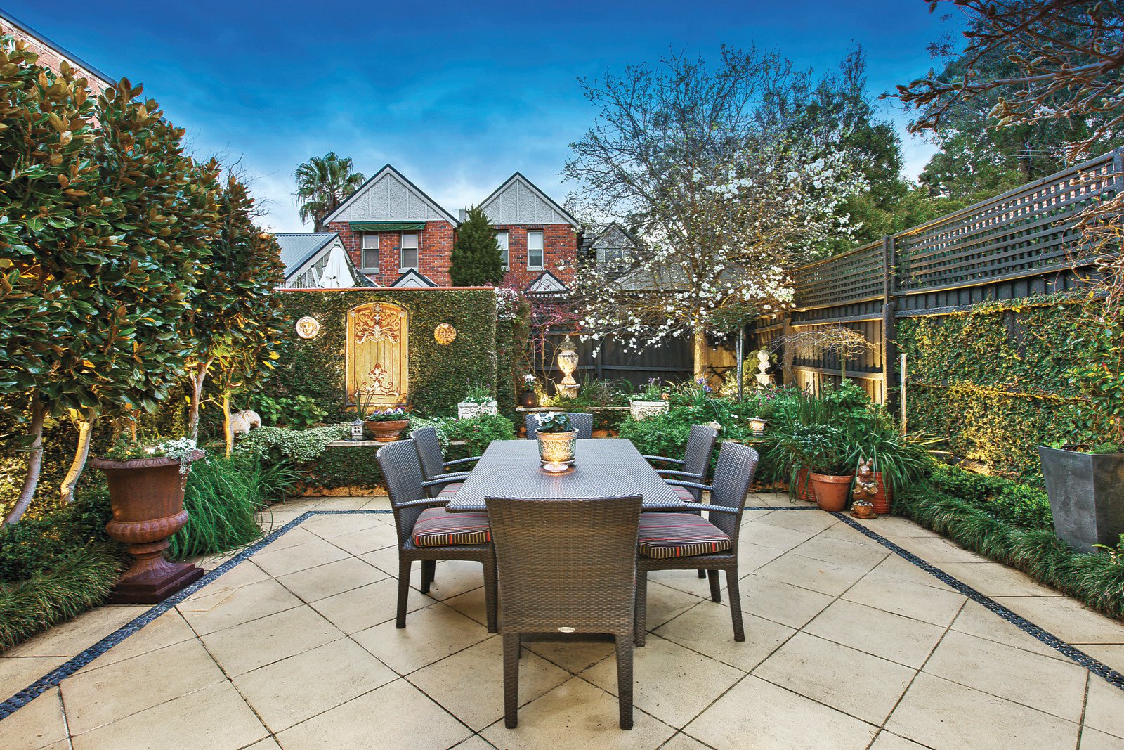 Situated on the preferred northern side, the interior is flooded with sunlight and features a polished timber hallway flowing past two bedrooms both with ample BIRs and sparkling black & white themed bathroom leading to a full-width living room with an inviting OFP plus dining and stylish kitchen with Corian bench-tops and stainless steel appliances. All opening to a north-west facing verandah with summer shading from a wisteria and overlooking a Mediterranean-inspired, flood-lit courtyard garden created by the renowned landscape gardener, Ian Barker - perfect for indoor/outdoor entertaining and relaxation. Other features include quality Plantation shutters, R/C air-conditioner (main bedroom, kitchen & living room) concealed garden storage.