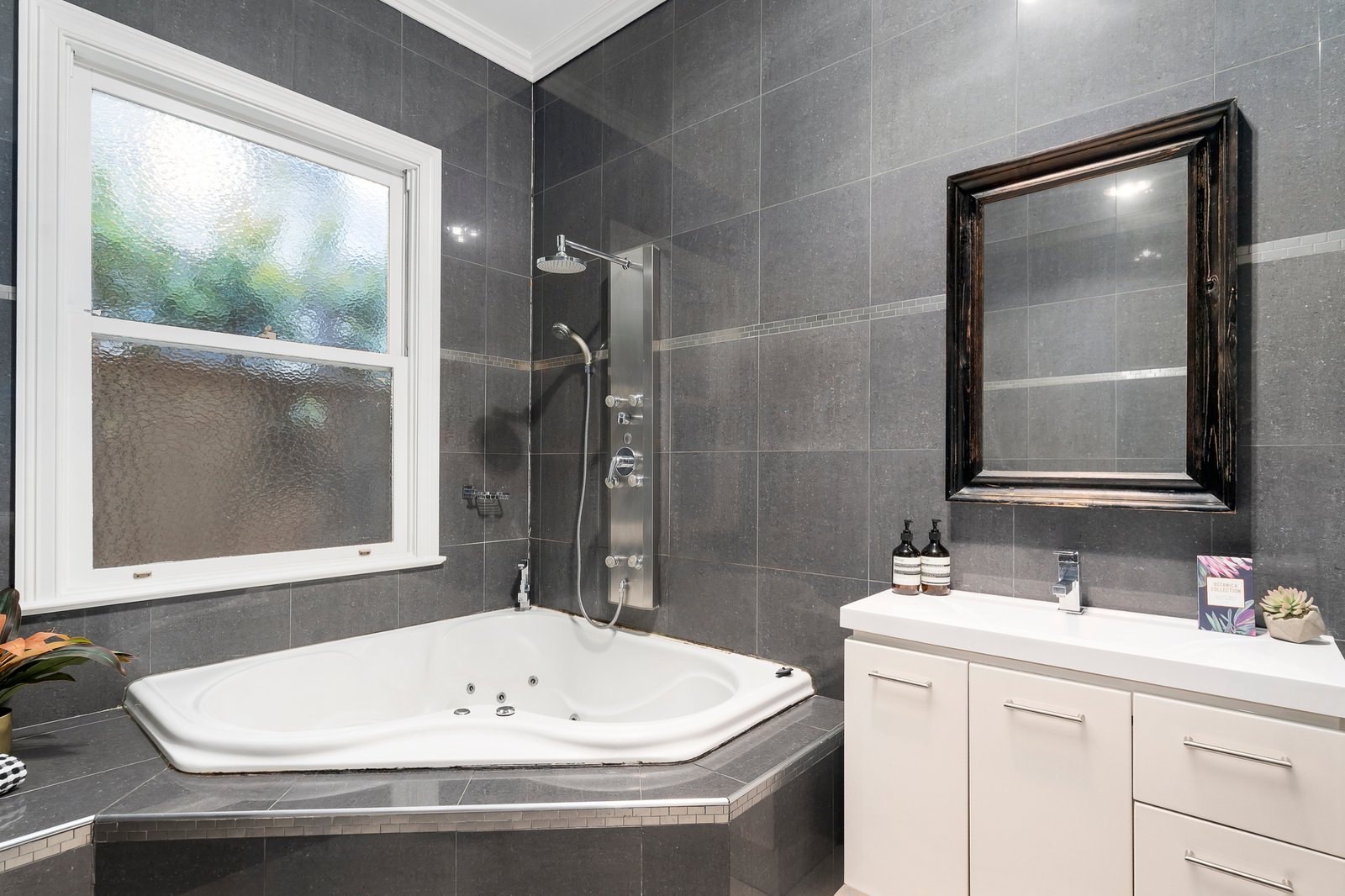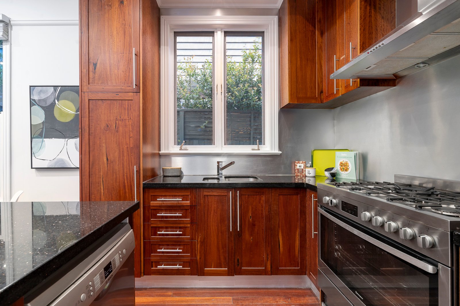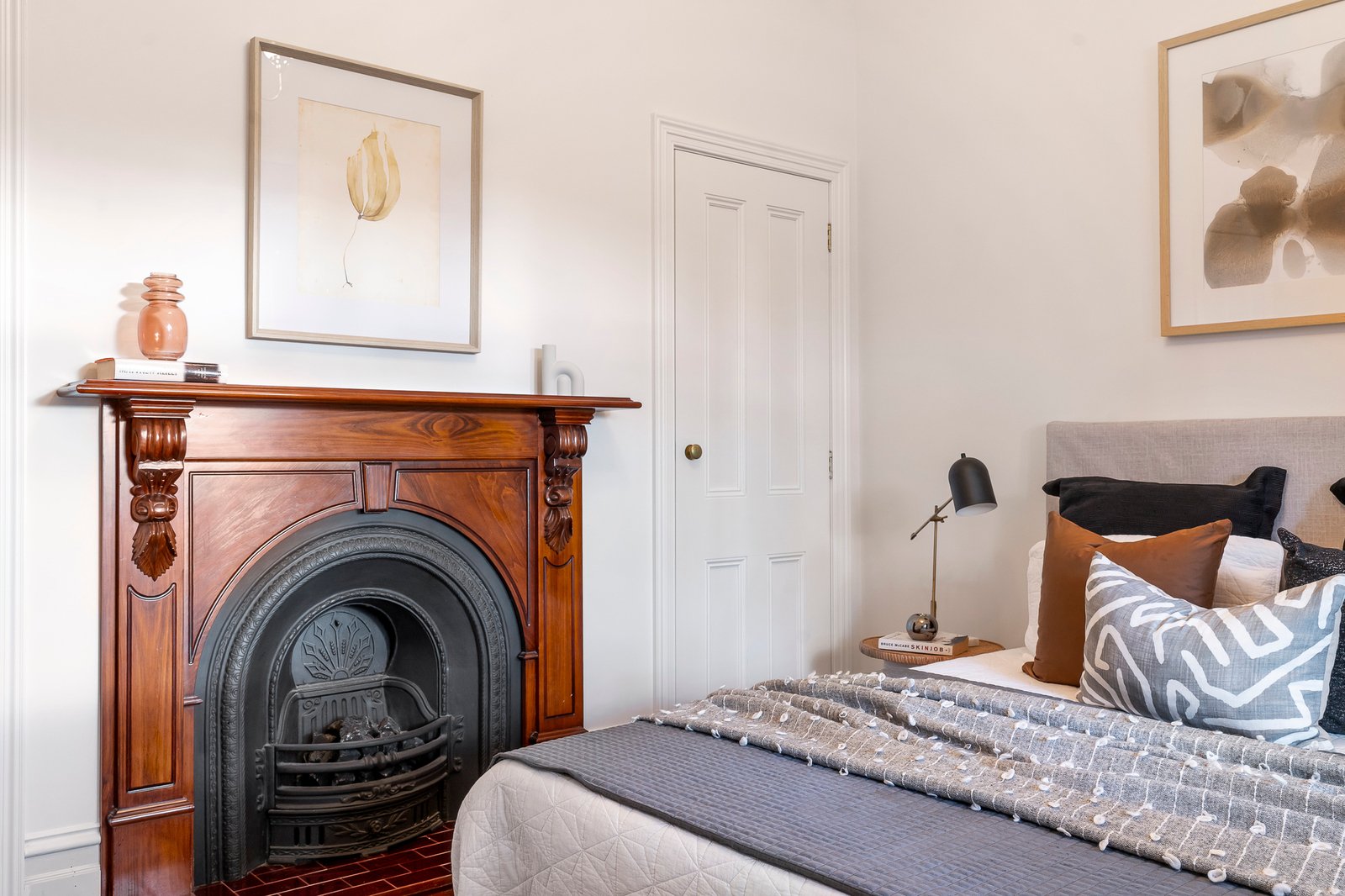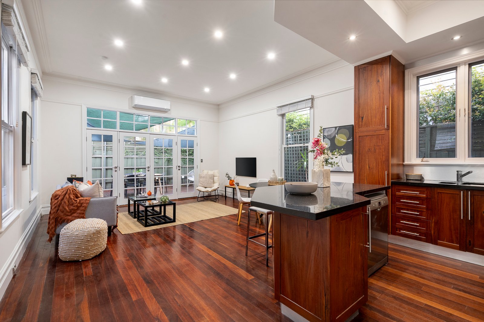 An inviting living and dining area seamlessly connects to the rear outdoor decking offering inside and out entertainment. The kitchen includes plenty of bench space for cooking and entertaining with a spacious island and breakfast bar, featuring stone benchtops, stainless steel appliances including a dishwasher, and solid timber cupboard doors. Accommodation includes two generously sized bedrooms one with built-in robes, the other free standing, and both include ornate timber fireplaces with operational gas fires. The light-filled entrance hallway and bedrooms are packed with period features whilst the large central bathroom boasts a corner spa bath, vanity with storage, toilet, and a Euro-style laundry. A retractable attic ladder leads from the second bedroom up to an extensive fully lined attic storage area. All rooms feature dark hardwood polished timber floorboards throughout.
