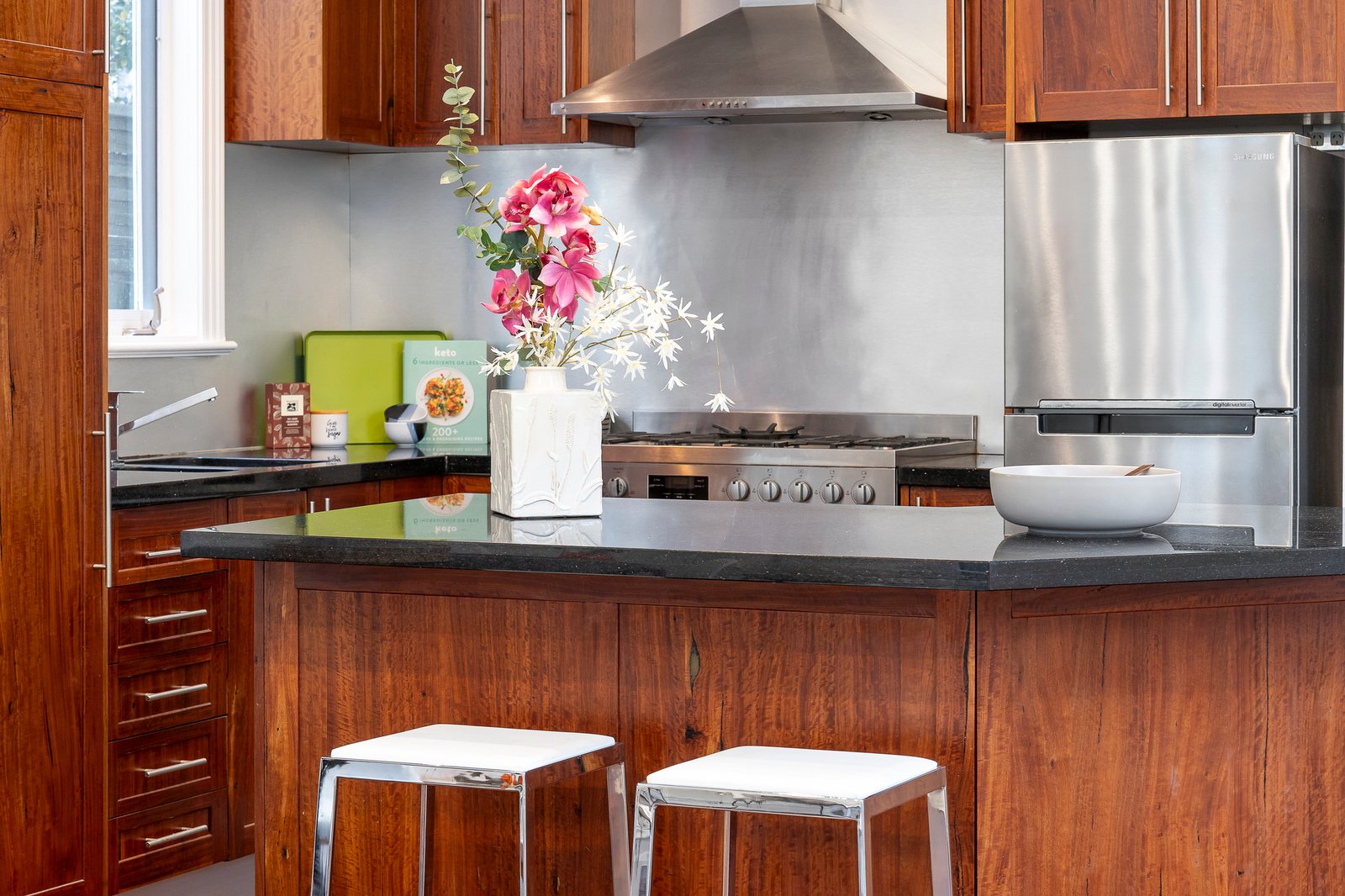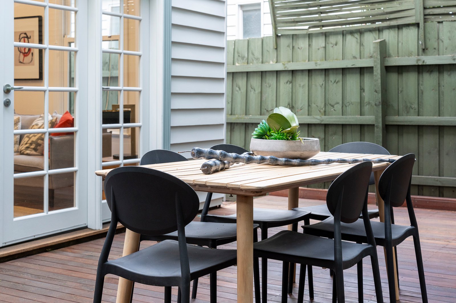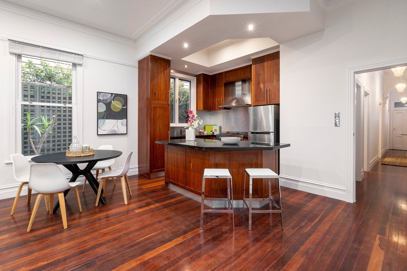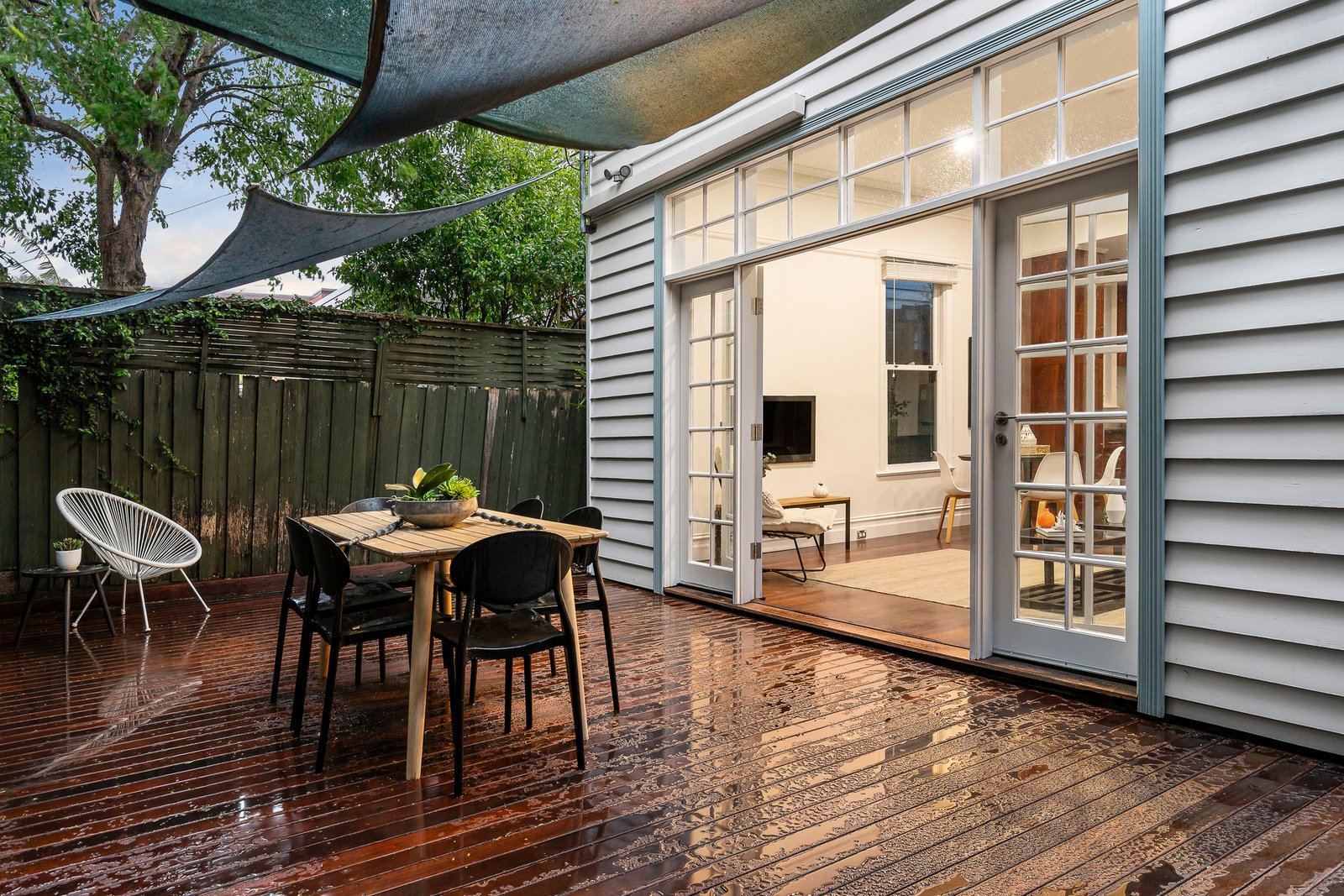 An inviting living and dining area seamlessly connects to the rear outdoor decking offering inside and out entertainment. The kitchen includes plenty of bench space for cooking and entertaining with a spacious island and breakfast bar, featuring stone benchtops, stainless steel appliances including a dishwasher, and solid timber cupboard doors. Accommodation includes two generously sized bedrooms one with built-in robes, the other free standing, and both include ornate timber fireplaces with operational gas fires. The light-filled entrance hallway and bedrooms are packed with period features whilst the large central bathroom boasts a corner spa bath, vanity with storage, toilet, and a Euro-style laundry. A retractable attic ladder leads from the second bedroom up to an extensive fully lined attic storage area. All rooms feature dark hardwood polished timber floorboards throughout.